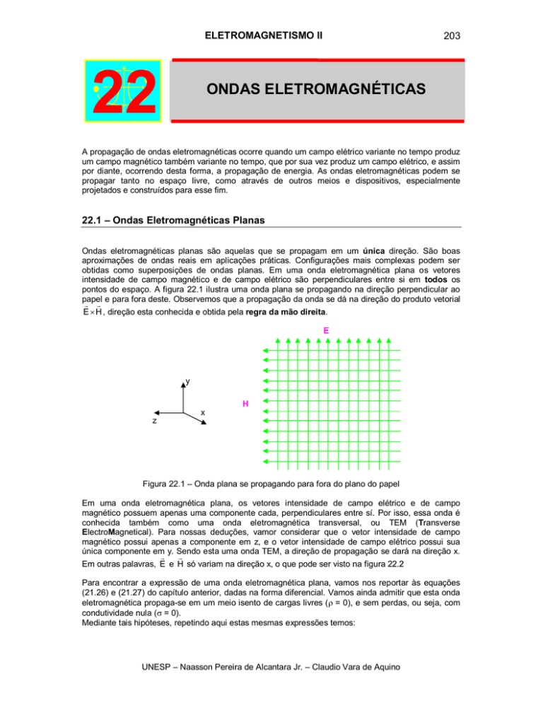 ELETROMAGNETISMO II 22 203 ONDAS ELETROMAGNÉTICAS A propagação de ondas eletromagnéticas ocorre quando um campo elétrico variante no tempo produz um campo magnético também variante no tempo, que por sua vez produz um campo elétrico, e assim por diante, ocorrendo desta forma, a propagação de energia. As ondas eletromagnéticas podem se propagar tanto no espaço livre, como através de outros meios e dispositivos, especialmente projetados e construídos para esse fim. 22.1 – Ondas Eletromagnéticas Planas Ondas eletromagnéticas planas são aquelas que se propagam em um única direção. São boas aproximações de ondas reais em aplicações práticas. Configurações mais complexas podem ser obtidas como superposições de ondas planas. Em uma onda eletromagnética plana os vetores intensidade de campo magnético e de campo elétrico são perpendiculares entre si em todos os pontos do espaço. A figura 22.1 ilustra uma onda plana se propagando na direção perpendicular ao papel e para fora deste. Observemos que a propagação da onda se dá na direção do produto vetorial E H , direção esta conhecida e obtida pela regra da mão direita. E y H x z Figura 22.1 – Onda plana se propagando para fora do plano do papel Em uma onda eletromagnética plana, os vetores intensidade de campo elétrico e de campo magnético possuem apenas uma componente cada, perpendiculares entre sí. Por isso, essa onda é conhecida também como uma onda eletromagnética transversal, ou TEM (Transverse ElectroMagnetical). Para nossas deduções, vamor considerar que o vetor intensidade de campo magnético possui apenas a componente em z, e o vetor intensidade de campo elétrico possui sua única componente em y. Sendo esta uma onda TEM, a direção de propagação se dará na direção x. Em outras palavras, E e H só variam na direção x, o que pode ser visto na figura 22.2 Para encontrar a expressão de uma onda eletromagnética plana, vamos nos reportar às equações (21.26) e (21.27) do capítulo anterior, dadas na forma diferencial. Vamos ainda admitir que esta onda eletromagnética propaga-se em um meio isento de cargas livres ( = 0), e sem perdas, ou seja, com condutividade nula ( = 0). Mediante tais hipóteses, repetindo aqui estas mesmas expressões temos: UNESP – Naasson Pereira de Alcantara Jr. – Claudio Vara de Aquino ELETROMAGNETISMO II 204 E H 0 t (22.1) H E 0 t (22.2) Ey direção x de propagação da onda Hz Figura 22. 2 – polarização e direção de propagação de onda onda plana Desenvolvendo o rotacional do vetor intensidade de campo magnético em coordenadas cartesianas (lado esquerdo da equação 22.1) e expressando a derivada temporal do vetor intensidade de campo elétrico teremos: Hz Hy y z H H H H â x x z â y y x z x x y â z 0 E x â x E y â y E z â z t (22.3) Pelas considerações feitas sobre esta onda plana, o campo magnético só admite a componente em z e o campo elétrico apenas em y. Ainda pela característica apresentada o campo magnético não varia na direção y. Desta forma, a equação (22.3) se reduz a: E y Hz â y 0 .â y x t (22.4) Ou pela identidade vetorial: E y Hz 0 x t (22.5) Desenvolvendo agora o rotacional do vetor intensidade de campo elétrico da equação (22.2),e expressando a derivada temporal do vetor intensidade de campo magnético em coordenadas cartesianas, temos: E z E y y z E E E E â x x z â y y x x y z x â z 0 Hx â x Hy â y Hz â z t (22.6) Pela hipótese da onda plana e pela invariabilidade do campo elétrico na direção z, a equação (22.3) se reduz a: E y x â z 0 Hz â z t (22.7) ou ainda: E y x 0 Hz t UNESP – Naasson Pereira de Alcantara Jr. – Claudio Vara de Aquino (22.8) ELETROMAGNETISMO II 205 Derivando (22.5) em relação a t e (22.8) em relação a x, teremos: 2E y Hz 0 x t t 2 (22.9) 2 1 Ey Hz 2 0 x x t (22.10) 2 2E y 1 Ey 0 0 x 2 t 2 (22.11) Pela identidade entre (22.9) e (22.10): A equação da onda em Ey fica: 2E y x 2 0 0 2E y (22.12) t 2 Analogamente, fazendo a operação inversa, ou seja, derivando (22.8) em relação a t e (22.5) em relação a x, teremos a equação da onda em Hz. Assim, 2Hz x 2 0 0 2Hz (22.13) t 2 Fica nítida a dualidade apresentada pelas equações (22.12) e (22.13), expressando o mesmo fenômeno eletromagnético, podendo assim ser utilizadas indistintamente. Podemos perceber que tanto na equação (22.12) como na equação (22.13) aparece o termo 00. 2 Fazendo v = 1 / (00) podemos escrever: 2 Ey v2 2 Hz t2 t2 2 2 Ey Hz 2 x2 x (22.14) O parâmetro v tem dimensão de velocidade, uma das características do meio. Para o vácuo ou espaço livre temos: v 1 0 0 1 4 10 7 . 9 3 .10 8 m / s 10 36 (22.15) Esta é a velocidade de propagação de qualquer onda eletromagnética no espaço livre, praticamente a 8 velocidade da luz no vácuo (2,99792458 x 10 m/s) calculada muito antes do surgimento da teoria eletromagnética. Mais uma prova de que a luz é uma onda eletromagnética, em acordo com a demonstração teórica de Maxwell. A equação de onda (22.12) é uma equação diferencial a derivadas parciais, linear e de segunda ordem que devemos encontrar uma solução. Aqui, nos restringiremos a apresentar uma possível solução para ela, e mostrar que essa solução é correta. Seja a seguinte proposta de solução: E y E 0 sen (x mt) UNESP – Naasson Pereira de Alcantara Jr. – Claudio Vara de Aquino (22.16) ELETROMAGNETISMO II 206 A constante 2 / , onde é o comprimento de onda, m uma constante a determinar e t o tempo. Derivando (22.16) uma vez em relação a x, teremos: E y x E 0 cos ( x mt) (22.17) 2 E 0 sen ( x mt ) (22.18) m E 0 cos ( x mt ) (22.19) Derivando novamente em relação a x: 2E y x 2 Derivando agora (22.16) em relação a t: E y t Derivando novamente em relação a t: 2E y t 2 m 2 2 E 0 sen (x mt ) (22.20) Substituindo (22.19) e (22.20) em (22.12) considerando (22.15), temos: m 2 2 E 0 sen x mt v 2 2 E 0 sen x mt (22.21) Assim, a equação (22.16) é uma solução