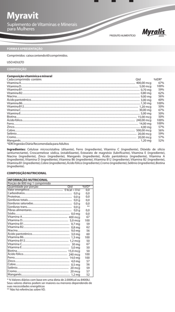 FORMA E APRESENTAÇÃO Comprimidos: caixa contendo 60 comprimidos. USO ADULTO COMPOSIÇÃO Composição vitamínica e mineral Cada comprimido contém: Qtd %IDR* 67% Vitamina A................................................................................................................................................................................ 400,00 mcg 100% Vitamina D..................................................................................................................................................................................... 5,00 mcg 59% Vitamina B1..................................................................................................................................................................................... 0,70 mg 62% Vitamina B2..................................................................................................................................................................................... 0,80 mg 56% Niacina.............................................................................................................................................................................................. 9,00 mg 60% Ácido pantotênico........................................................................................................................................................................ 3,00 mg 100% Vitamina B6...................................................................................................................................................................................... 1,30 mg 50% Vitamina B12................................................................................................................................................................................ 1,20 mcg 67% Vitamina C..................................................................................................................................................................................... 30,00 mg 50% Vitamina E........................................................................................................................................................................................ 5,00 mg 50% Biotina.......................................................................................................................................................................................... 15,00 mcg 100% Ácido fólico.............................................................................................................................................................................. 240,00 mcg 100% Ferro................................................................................................................................................................................................ 14,00 mg 57% Zinco.................................................................................................................................................................................................. 4,00 mg 56% Cobre......................................................................................................................................................................................... 500,00 mcg 59% Selênio......................................................................................................................................................................................... 20,00 mcg 57% Cromo.......................................................................................................................................................................................... 20,00 mcg 52% Manganês........................................................................................................................................................................................ 1,20 mg *IDR: Ingestão Diária Recomendada para Adultos Ingredientes: Celulose microcristalina (diluente), Ferro (ingrediente), Vitamina C (ingrediente), Dióxido de silício (antiumectante), Croscarmelose sódica, (estabilizante), Estearato de magnésio (lubrificante), Vitamina E (ingrediente), Niacina (ingrediente), Zinco (ingrediente), Manganês (ingrediente), Ácido pantotênico (ingrediente), Vitamina A (ingrediente), Vitamina D (ingrediente), Vitamina B6 (ingrediente), Vitamina B12 (ingrediente), Vitamina B2 (ingrediente), Vitamina B1 (ingrediente), Cobre (ingrediente), Ácido fólico (ingrediente), Cromo (ingrediente), Selênio (ingrediente), Biotina (ingrediente). COMPOSIÇÃO NUTRICIONAL INFORMAÇÃO NUTRICIONAL Porção de 800 mg: 1 comprimido Quantidade por porção Qtd %VD* Valor energético.................................................... 0 kcal = 0 kJ 0,0 Carboidratos......................................................................... 0,0 g 0,0 Proteínas................................................................................ 0,0 g 0,0 Gorduras totais.................................................................... 0,0 g 0,0 Gorduras saturadas............................................................ 0,0 g 0,0 Gorduras trans..................................................................... 0,0 g ** Fibras alimentares.............................................................. 0,0 g 0,0 Sódio.................................................................................... 0,0 mg 0,0 Vitamina A...................................................................... 400 mcg 67 Vitamina D....................................................................... 5,0 mcg 100 Vitamina B1....................................................................... 0,7 mg 59 Vitamina B2....................................................................... 0,8 mg 62 Niacina................................................................................ 9,0 mg 56 Ácido pantotênico.......................................................... 3,0 mg 60 Vitamina B6..............