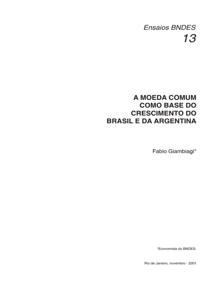 Ensaios BNDES 13 A MOEDA COMUM COMO BASE DO CRESCIMENTO DO BRASIL E DA ARGENTINA Fabio Giambiagi* *Economista do BNDES. Rio de Janeiro, novembro - 2001 Sumário Resumo. . . . . . . . . . . . . . . . . . . . . . . . . . . . . . . . . . . . . . . . . . . . . . . . . . . . 5 Abstract . . . . . . . . . . . . . . . . . . . . . . . . . . . . . . . . . . . . . . . . . . . . . . . . . . . 5 1. Introdução . . . . . . . . . . . . . . . . . . . . . . . . . . . . . . . . . . . . . . . . . . . . . . . 7 2. A Moeda Única do Mercosul: Balanço do Debate . . . . . . . . . . . . . . . . . . . 10 3. A Integração como um Processo . . . . . . . . . . . . . . . . . . . . . . . . . . . . . . . 13 4. A Convergência Macroeconômica . . . . . . . . . . . . . . . . . . . . . . . . . . . . . . 17 4.1. O Ajuste Brasileiro . . . . . . . . . . . . . . . . . . . . . . . . . . . . . . . . . . . . . 4.2. O Ajuste Argentino . . . . . . . . . . . . . . . . . . . . . . . . . . . . . . . . . . . . . 17 20 5. A Alca, o Contexto Mundial e as Economias do Brasil e da Argentina . . . 25 5.1. 5.2. 5.3. 5.4. 5.5. 5.5. Perspectivas da Alca . . . . . . . . . . . . . . . . . . . . . . . . . . . . . . . . . . . . Um Mundo com Menos Moedas. . . . . . . . . . . . . . . . . . . . . . . . . . . . A Necessidade de Diferenciação do Brasil e da Argentina . . . . . . . . O “Núcleo” do Mercosul e a Visão de Longo Prazo . . . . . . . . . . . . . . Democracia, Modernização e Crescimento: Integração com Estabilidade . . . . . . . . . . . . . . . . . . . . . . . . . . . . . . . . . . . . . . . . . . 25 27 28 30 31 6. A Aproximação de uma Área Monetária Ótima: A Agenda Futura . . . . . . 33 7. A Questão Cambial e a Proposta de uma “Sanfona”. . . . . . . . . . . . . . . . . 35 8. Proposta de Cronograma . . . . . . . . . . . . . . . . . . . . . . . . . . . . . . . . . . . . . 38 9. Conclusões . . . . . . . . . . . . . . . . . . . . . . . . . . . . . . . . . . . . . . . . . . . . . . . 42 Referências Bibliográficas . . . . . . . . . . . . . . . . . . . . . . . . . . . . . . . . . . . . . . 44 Resumo Este texto trata do aprofundamento da integração econômica entre Brasil e Argentina, um dos elementos que deverão balizar a tomada de decisão das empresas no Brasil ao longo da década, juntamente com a perspectiva de formação da Área de Livre Comércio das Américas (Alca). Explicam-se quais foram as motivações que justificam a integração, apesar do cenário adverso enfrentado pelos países; comenta-se como seria possível avançar na integração conservando a duplicidade de regimes cambiais do Brasil e da Argentina; e faz-se uma proposta de cronograma de ações, que culminariam com a adoção de uma moeda comum (o “escudo”) em 2011. Isso poderia ser encarado, assim, como o mais poderoso instrumento de política industrial dos dois países, com vistas ao aproveitamento das economias de escala associadas à formação de um mercado comum. Abstract This paper analyses the deepening of economic integration between Brazil and Argentina, one of the elements which are going to define the decisions of Brazilian companies along the decade, besides with the formation of the American Free Trade Area (Afta). The motivation for integration, despite the scenario faced by the countries and the feasibility of new progress despite of the differences between the exchange rate arrangements of Brazil and Argentina, are commented. Finally, a proposal is made, including a set of actions that would conclude with the issue of a common currency (the “escudo”) in 2011. This could be seen as the most powerfull instrument of industrial policy of the two countries, in order to take advantage of the economies of scale associated with a common market. Ensaios BNDES nº 13 5 6 Ensaios BNDES nº 13 “Nothing moves without man and nothing lasts without institutions” (Jean Monnet). “Lembrem-se que vamos ser vizinhos para sempre” (Ministro de Indústria e Comércio do México, em 1990, diante de uma platéia hostil nos Estados Unidos, justificando as primeiras reuniões em favor da integração que culminaram na assinatura do Nafta). 1. Introdução Em artigo publicado recentemente, pouco antes de se tornar diretor do Banco Central, o professor Ilan Goldfajn descreveu com precisão o problema representado pela dualidade de regimes cambiais entre Brasil e Argentina: “O problema central do Mercosul, hoje, é desenhar um mecanismo para que o bloco conviva, no futuro, com uma moeda única... a exemplo do euro. Atualmente... o Brasil está satisfeito com o regime de câmbio flutuante associado ao regime de metas de inflação e a Argentina descarta completamente a possibilidade de abandonar a paridade com o dólar... Mas a pergunta continua sendo se a Argentina abandonará o dólar... ou se o Brasil fixará o real ao dólar” [Goldfajn (2000)]. O presente texto, que de certa forma atualiza as idéias contidas em Giambiagi (1999) e procura responder exatamente a essa questão, trata do aprofundamento da integração entre as duas maiores economias do Mercosul – entendidas como o “núcleo” do bloco –, que deve ser um dos elementos que deverão balizar a tomada de decisão das empresas brasileiras ao longo da década, juntamente com a perspectiva de formação da Área de Livre Comércio das Américas (Alca). O tema da possível integração monetária entre os países do Mercosul passou a freqüentar o debate acerca dos rumos desse acordo regional em 1997, ainda antes da sucessão de crises de economias emergentes que começaram com os problemas do Leste asiático em meados daquele ano e culminaram na desvalorização do real em janeiro de 1999, passando pela decretação da moratória russa em 1998. No início, a tese da unificação monetária baseava-se em dois elementos: por um lado, em considerações de natureza teórica acerca da conveniência da união entre as moedas de economias vizinhas e crescentemente integradas;