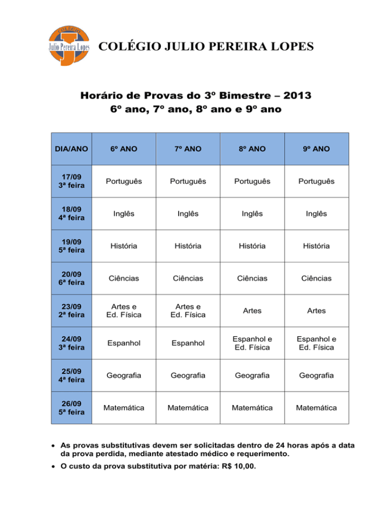 COLÉGIO JULIO PEREIRA LOPES Horário de Provas do 3º Bimestre – 2013 6º ano, 7º ano, 8º ano e 9º ano DIA/ANO 6º ANO 7º ANO 8º ANO 9º ANO 17/09 3ª feira Português Português Português Português 18/09 4ª feira Inglês Inglês Inglês Inglês 19/09 5ª feira História História História História 20/09 6ª feira Ciências Ciências Ciências Ciências 23/09 2ª feira Artes e Ed. Física Artes e Ed. Física Artes Artes 24/09 3ª feira Espanhol Espanhol Espanhol e Ed. Física Espanhol e Ed. Física 25/09 4ª feira Geografia Geografia Geografia Geografia 26/09 5ª feira Matemática Matemática Matemática Matemática • As provas substitutivas devem ser solicitadas dentro de 24 horas após a data da prova perdida, mediante atestado médico e requerimento. • O custo da prova substitutiva por matéria: R$ 10,00.