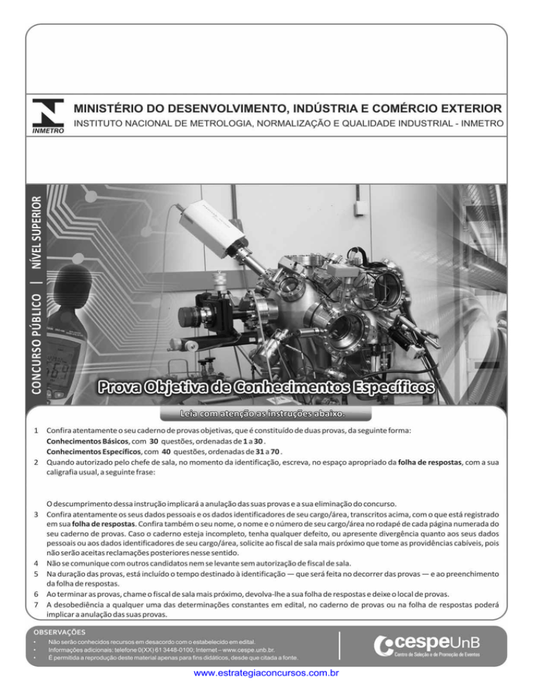 www.estrategiaconcursos.com.br UnB/CESPE – INMETRO Nas questões de 31 a 70, marque, para cada uma, a única opção correta, de acordo com o respectivo comando. Para as devidas marcações, use a folha de respostas, único documento válido para a correção das suas provas. CONHECIMENTOS ESPECÍFICOS QUESTÃO 31 QUESTÃO 34 Com relação à insuficiência renal crônica (IRC), assinale a opção correta. Com relação à influenza, assinale a opção correta. A O uso de eritropoietina sintética reduz o risco de fratura em pacientes com IRC submetidos a diálise. B A ultrafiltração lenta está indicada em pacientes com hiperpotassemia não responsivos à hemodiálise. C A retenção de fosfato é a principal causa da osteoporose observada em pacientes com IRC. D A concentração plasmática de fosfato geralmente permanece normal nos estágios 1 e 2 da IRC. E A administração de vitamina D ao paciente com IRC previne o hiperparatireoidismo primário. A Trata-se de uma doença de notificação compulsória. QUESTÃO 32 B Os adultos começam a transmitir o vírus 24 horas antes do início dos sintomas e até sete dias após. As crianças transmitem-no desde vários dias antes do início dos sintomas e até dez dias após. C Amantadina e rimantadina são bastante eficazes contra o vírus da influenza dos tipos A e B. D A mortalidade por influenza do tipo B é mais comum em idosos, gestantes, crianças e imunocomprometidos. Por essa Assinale a opção correta com respeito à parada cardiorrespiratória. razão, a vacinação é preconizada para esse grupo de A Em ambiente hospitalar e extra-hospitalar, podem-se iniciar as compressões torácicas até que o desfibrilador externo automático (DEA) esteja conectado e pronto para a análise do ritmo. B No ambiente hospitalar, a prioridade deve ser a identificação do ritmo da parada, pois a abordagem preconizada para cada um dos ritmos é bastante diferente. C O DEA não pode ser utilizado em vítimas de choque elétrico, sob risco de agravar as lesões ocasionadas pela corrente elétrica. D No caso de parada cardíaca em ambiente extra-hospitalar, devem-se iniciar as manobras de ressuscitação cardiopulmonar antes de se pedir ajuda ou de acionar o DEA, mesmo quando este estiver disponível. E O acesso intraósseo pode ser realizado com segurança em crianças. Em adultos, o risco precoce de trombose e a dificuldade técnica inviabilizam esse acesso. indivíduos. QUESTÃO 33 E Muito embora nos casos mais graves da pandemia de influenza de 2009 tenha-se identificado o vírus do tipo A, o tipo sazonal mais identificado no Brasil, nesse período, foi o tipo B. QUESTÃO 35 Assinale a opção correta acerca da artrite reumatoide. A Trata-se de doença extremamente rara na prática clínica, acometendo menos de 10 a cada 100.000 pessoas no Brasil. B Doenças linfoproliferativas ocorrem com menor frequência em pacientes com artrite reumatoide. A incidência de linfomas é inversamente proporcional à persistência e ao grau de atividade da doença. C Pacientes com artrite reumatoide têm maior chance de Em indivíduos idosos, apresentarem fraturas ósseas quando comparados com a A ferritina sérica com nível normal afasta o diagnóstico de anemia ferropriva. B a anemia constitui fator de risco independente para morbimortalidade e redução da qualidade de vida. C níveis subnormais de hemoglobina devem ser sempre valorizados, pois não expressam o declínio fisiológico desses pacientes. D a hemoglobina corpuscular média é útil no diagnóstico diferencial entre anemia de doença crônica e anemia hemolítica. E a maior causa de anemia é a deficiência nutricional. população geral. Esse risco deve-se não somente ao uso crônico de corticoides para tratamento, como também à própria inflamação sistêmica associada à doença. D O tratamento com drogas modificadoras do curso da doença deve ser instituído tão logo possível e suspenso tão logo haja remissão clínica. E Pacientes que usarão corticoides por mais de três meses só deverão receber suplementação de cálcio e vitamina D após se confirmar a ocorrência de osteoporose secundária. Cargo 7: Analista Executivo em Metrologia e Qualidade – Área: Medicina – Ortopedia e Traumatologia www.estrategiaconcursos.com.br – 10 – UnB/CESPE – INMETRO QUESTÃO 36 QUESTÃO 38 Um senhor, com 66 anos de idade, é servidor público há 14 anos. No exame admissional desse senhor, constatou-se diabetes melito do tipo 2. Há 5 anos, durante exame periódico, ele teve diagnóstico de hipertensão arterial sistêmica, que passou a ser controlada com enalapril. Seus níveis de hemoglobina glicada sempre estiveram acima de 7,2%. Durante suas atividades laborativas, ele apresentou episódio de crise convulsiva tônicoclônica generalizada, tendo sido, então, medicado com benzodiazepínico, após o que evoluiu com rebaixamento do nível de consciência (9 pontos na escala de coma de Glasgow). Seu comportamento parecia normal antes da crise. Acerca do caso clínico acima, assinale a opção correta. A A principal hipótese diagnóstica é a cetoacidose diabética, que deve ser rapidamente afastada em razão da alta morbimortalidade a ela associada. B Caso o diagnóstico de acidente vascular encefálico (AVE) seja confirmado, é mais provável que se trate de um AVE do tipo hemorrágico, mais comum nessa faixa etária. C Pode-se excluir a possibilidade de encefalopatia urêmica, uma vez que a nefropatia diabética é complicação relativamente precoce do diabetes melito do tipo 2 e o servidor tem nível de hemoglobina glicada persistentemente elevada. D Caso o diagnóstico de AVE do tipo isquêmico seja confirmado, é importante que o servidor receba profilaxia secundária, com aspirina ou clopidogrel. A anticoagulação plena com cumarínicos está indicada principalmente para pacientes com AVE de etiologia embólica. E O diagnóstico de neoplasia intracraniana deve ser prontamente c