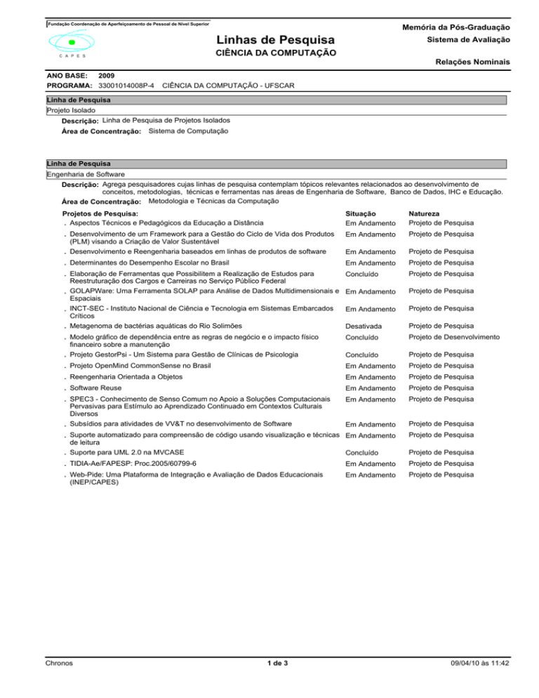 Fundação Coordenação de Aperfeiçoamento de Pessoal de Nível Superior Memória da Pós-Graduação Linhas de Pesquisa Sistema de Avaliação CIÊNCIA DA COMPUTAÇÃO Relações Nominais ANO BASE: 2009 PROGRAMA: 33001014008P-4 CIÊNCIA DA COMPUTAÇÃO - UFSCAR Linha de Pesquisa Projeto Isolado Descrição: Linha de Pesquisa de Projetos Isolados Área de Concentração: Sistema de Computação Linha de Pesquisa Engenharia de Software Descrição: Agrega pesquisadores cujas linhas de pesquisa contemplam tópicos relevantes relacionados ao desenvolvimento de conceitos, metodologias, técnicas e ferramentas nas áreas de Engenharia de Software, Banco de Dados, IHC e Educação. Área de Concentração: Metodologia e Técnicas da Computação Projetos de Pesquisa: . Aspectos Técnicos e Pedagógicos da Educação a Distância Situação Em Andamento Natureza Projeto de Pesquisa . Desenvolvimento de um Framework para a Gestão do Ciclo de Vida dos Produtos (PLM) visando a Criação de Valor Sustentável . Desenvolvimento e Reengenharia baseados em linhas de produtos de software Em Andamento Projeto de Pesquisa Em Andamento Projeto de Pesquisa . Determinantes do Desempenho Escolar no Brasil Em Andamento Projeto de Pesquisa . Elaboração de Ferramentas que Possibilitem a Realização de Estudos para Reestruturação dos Cargos e Carreiras no Serviço Público Federal . GOLAPWare: Uma Ferramenta SOLAP para Análise de Dados Multidimensionais e Espaciais . INCT-SEC - Instituto Nacional de Ciência e Tecnologia em Sistemas Embarcados Críticos . Metagenoma de bactérias aquáticas do Rio Solimões Concluído Projeto de Pesquisa Em Andamento Projeto de Pesquisa Em Andamento Projeto de Pesquisa Desativada Projeto de Pesquisa . Modelo gráfico de dependência entre as regras de negócio e o impacto físico financeiro sobre a manutenção . Projeto GestorPsi - Um Sistema para Gestão de Clínicas de Psicologia Concluído Projeto de Desenvolvimento Concluído Projeto de Pesquisa . Projeto OpenMind CommonSense no Brasil Em Andamento Projeto de Pesquisa . Reengenharia Orientada a Objetos Em Andamento Projeto de Pesquisa . Software Reuse Em Andamento Projeto de Pesquisa . SPEC3 - Conhecimento de Senso Comum no Apoio a Soluções Computacionais Pervasivas para Estímulo ao Aprendizado Continuado em Contextos Culturais Diversos . Subsídios para atividades de VV&T no desenvolvimento de Software Em Andamento Projeto de Pesquisa Em Andamento Projeto de Pesquisa . Suporte automatizado para compreensão de código usando visualização e técnicas Em Andamento de leitura . Suporte para UML 2.0 na MVCASE Concluído Projeto de Pesquisa . TIDIA-Ae/FAPESP: Proc.2005/60799-6 Em Andamento Projeto de Pesquisa . Web-Pide: Uma Plataforma de Integração e Avaliação de Dados Educacionais (INEP/CAPES) Em Andamento Projeto de Pesquisa Chronos 1 de 3 Projeto de Pesquisa 09/04/10 às 11:42 Fundação Coordenação de Aperfeiçoamento de Pessoal de Nível Superior Memória da Pós-Graduação Linhas de Pesquisa Sistema de Avaliação CIÊNCIA DA COMPUTAÇÃO Relações Nominais ANO BASE: 2009 PROGRAMA: 33001014008P-4 CIÊNCIA DA COMPUTAÇÃO - UFSCAR Linha de Pesquisa Inteligência Artificial Descrição: Investigação de técnicas de representação de conhecimento e aprendizado de máquina bem como da aplicabilidade de métodos da inteligência computacional a automação industrial e processamento de linguagem natural. Área de Concentração: Metodologia e Técnicas da Computação Projetos de Pesquisa: Situação . Algoritmos eficientes para a identificação de atributos relevantes em aprendizado de Concluído máquina . Aprendizado de Máquina e a Mineração de Dados (Processo CNPq 307403/2007-6) Em Andamento Natureza Projeto de Pesquisa . ERUDITE : Uma máquina que lê Projeto de Pesquisa Em Andamento Projeto de Pesquisa . Fábrica Automática TEAR - Uma Plataforma de Ensaios de Sistemas de Fabricação Em Andamento Projeto de Pesquisa . FAROL - Fortalecimento e Integração nas Competências Em Andamento Projeto de Pesquisa . Investigação de métodos de aprendizado indutivo de máquina baseados em conceitos da geometria computacional . Investigação e implementação de técnicas de tradução automática com o uso de informação sintática . Métodos de Busca para Programação da Produção Concluído Projeto de Pesquisa Em Andamento Projeto de Pesquisa Em Andamento Projeto de Pesquisa . Métodos Híbridos para Modelagem Fuzzy Em Andamento Projeto de Pesquisa . Pesquisa e Desenvolvimento em Inteligência Artificial Em Andamento Projeto de Pesquisa . PorSimples - Simplificação Textual do Português para Inclusão e Acessibilidade Digital . Read the Web Em Andamento Projeto de Pesquisa Em Andamento Projeto de Pesquisa . Redes Bayesianas Aplicadas à Tarefas de Descoberta de Conhecimento em Em Andamento Bancos de Dados . Sistema Inteligente de Gerenciamento de Veículos Autônomos (SIGV) - (INCT SEC) Em Andamento Projeto de Pesquisa . Sistemas Inteligentes no Seqüenciamento, Programação e Controle da Produção Projeto de Pesquisa Em Andamento Projeto de Pesquisa Linha de Pesquisa Processamento de Imagens e Sinais: Algoritmos e Arquiteturas Descrição: Sistemas e métodos de processamento de sinais e imagens, redes neurais, realidade virtual ubíqua em rede, e arquiteturas dedicadas para esse fim; onde incluem: técnicas estatísticas, morfologia matemática, wavelets, conjuntos convexos. Área de Concentração: Metodologia e Técnicas da Computação Projetos de Pesquisa: . Aplicação de network coding em algoritmos para redes de sensores sem fio com nós e sink móveis . Aplicação de redes neurais artificiais em processamento de imagens e sinais Situação Em Andamento Natureza Projeto de Pesquisa Em Andamento Projeto de Pesquisa . BDA - Brazilian Decimetric Array - Fase II Concluído Projeto de Pesquisa . Caverna Digital: Projeto Fapesp Multiusuário (Laboratório Multiusuário de Visualizaç