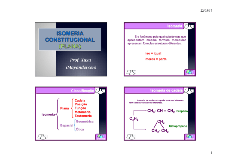 22/05/17 Isomeria É o fenômeno pelo qual substâncias que apresentam mesma fórmula molecular apresentam fórmulas estruturais diferentes. iso = igual meros = parte Prof. Xuxu (Mayanderson) Química Isomeria de cadeia Classificação Plana Isomeria Cadeia Posição Função Metameria Tautomeria Isomeria de cadeia é aquela onde os isômeros têm cadeias ou núcleos diferentes. CH3- CH = CH2 C 3H 6 Geométrica Espacial Propeno CH2 Ciclopropano Ótica CH2- CH2 Química Química 1 22/05/17 Isomeria de cadeia Isomeria de posição Isomeria plana de posição ocorre quando os isômeros tem a mesma cadeia carbônica, mas diferem pela posição de radicais ou de ligações duplas ou triplas. 1 2 3 4 CH3 CH3- CH - CH3 CH2=CH-CH2-CH3 Metil - propano C4H10 C 4H 8 CH3- CH2- CH2 - CH3 Buteno-1 1 2 3 4 CH3-CH=CH-CH3 Buteno-2 Butano Química Isomeria de posição 3 2 Isomeria de Função Isomeria funcional ocorre quando os isômeros pertencem a funções químicas diferentes. Os casos mais comuns de isomeria plana de função ocorrem entre: 1 CH3- CH2- CH2- OH Propanol-1 C 3H 8O 1 2 Química 3 CH3- CH- CH3 OH • Álcool, Éter, Enol e Fenol; • Aldeído e Cetona; • Ácido Carboxílico e Éster. Propanol-2 Química Química 2 22/05/17 Isomeria de Função Isomeria de Função Álcoois e Éteres; Aldeídos e Cetonas; CH3- CH2 – OH C 2H 6O CH3- CH2 - CHO Etanol C 3H 6O CH3- O - CH3 Propanal CH3 - CO - CH3 Metóxi-metano Propanona Química Isomeria de Função Química Metameria (compensação) Isomeria de compensação ocorre quando os isômeros diferem pela posição de um heteroátomo na cadeia carbônica. Ác.Carboxílicos e Ésteres; CH3- CH2 -O- CH2 - CH3 CH3- CH2 -COOH C3H6O2 Ác. Propanóico C4H10O CH3 -COO- CH3 Etóxi-etano CH3 -O- CH2 - CH2 - CH3 Etanoato de metila Metóxi-propano Química Química 3 22/05/17 Tautomeria Tautomeria Tautomeria é o caso particular de isomeria funcional onde os dois isômeros ficam em equilíbrio dinâmico. Enol CH2 H C OH Aldeído CH3 - C Tautomeria é o caso particular de isomeria funcional onde os dois isômeros ficam em equilíbrio dinâmico. H O OH CH2 O C CH3 CH3 Enol C CH3 Cetona Tautomeria Ceto-enólica Tautomeria aldo-enólica Química Química Isômeros: substâncias de estruturas diferentes, mas de mesma fórmula molecular ESTEREOISÔMEROS Substâncias em que os átomos estão ligados na mesma ordem mas a orientação espacial é diferente ENANTIÔMEROS As moléculas são imagens especulares umas das outras. Não se sobrepõem. DIASTEREOISÔMEROS As moléculas não são imagens especulares umas das outras. Não se sobrepõem. ISÔMEROS CONSTITUCIONAIS (PLANA) Isômeros que diferem na ordem com que os átomos estão ligados 4 22/05/17 Isomeria Espacial Os isômeros espaciais possuem a mesma fórmula molecular e também a mesma fórmula estrutural plana, diferenciando apenas nas fórmulas estruturais espaciais. Os isômeros espaciais podem ser divididos em geométricos e ópticos. Fórmulas Moleculares Iguais Fórmulas Estruturais Planas Iguais fórmulas Espaciais Diferentes Isomeria geométrica (cis-trans ou Z-E) Os isômeros são compostos que possuem a distribuição espacial diferente. Este tipo de isomeria espacial, ocorre, caso existam ligações duplas ou cadeia fechada ou ainda, os ligantes estejam ligados à carbonos diferentes. Os isômeros podem ser classificados como cis(Z) ou trans(E). 5 22/05/17 Não ocorre isomeria espacial geométrica devido a possibilidade de rotação entre os carbonos. Compostos etilênicos C=C - A ligação pi entre os carbonos impede a rotação entre eles. - A ligação dupla divide o espaço em dois planos, um acima da ligação pi e outra abaixo. 6 22/05/17 Compostos Ciclânicos Tipos de Isomeria Geométrica cis(Z): zusammen (juntos) do mesmo lado, juntos, no mesmo lado do plano de simetria. trans(E) entgegen (opostos) Os átomos de C dos ciclos não giram completamente ao redor de suas ligações. em lados opostos do plano de simetria. 7 22/05/17 Isomeria Geométrica (Cis –Trans) Condições de existência: 1) Cadeias abertas com ligação dupla; 2) Radicais ≠ no mesmo carbono e = entre carbonos; H H C=C CH3 CH3 H CH3 C=C H CH3 Isomeria Geométrica (Cis –Trans) Condições de existência: 1) Cadeias abertas com ligação dupla entre carbonos ou cadeias cíclicas; 2) Radicais ≠ no mesmo carbono e = entre carbonos; 3) Radicais ≠ nos carbonos da dupla. H H O C-C H C-C O O H O Mesmo composto Isomeria Geométrica (Cis –Trans) CIS (próximo a): os radicais iguais, ou de maiores Z, estão do mesmo lado do semi-plano. TRANS (através de): os radicais iguais, ou de maiores, Z estão em semi-planos opostos. Em geral, a forma TRANS é mais estável. Condições de existência: 1) Cadeias abertas com ligação dupla; 2) Radicais ≠ no mesmo carbono e = entre carbonos; H H C=C CH3 CH3 Cis H CH3 C=C H CH3 Trans 8 22/05/17 Isomeria Geométrica (Cis –Trans) Condições de existência: 1) Cadeias cíclicas; 2) Radicais ≠ no mesmo carbono e = entre carbonos; H CH2 C C CH3 H CH3 Cis CH2 H C CH3 C CH3 H Trans Os isômeros cis e trans possuem propriedades físicas diferentes, tais como, PF, PE e densidade. 9 22/05/17 Compostos cíclicos TRANS CIS Classificação Isômeros ÓPTICOS Diasteroisômeros Enantiômeros 10 22/05/17 Polarização da Luz ISOMERIA ÓPTICA Estuda o comportamento das substâncias quando submetidas a um feixe de luz polarizada, que pode ser obtida a partir da luz natural (não-polarizada). A luz polarizada é obtida fazendo-se passar um feixe de luz natural por dispositivos chamados de polarizadores. Um dos mais comuns é o prisma de Nicol. Polarizador Luz Natural Luz Polarizada Substância opticamente ativa Substância opticamente inativa (SOI): não desvia o plano de vibração da luz polarizada. Dextrógiro, (d) ou (+) - desvia o plano de luz para a direita. Substância opticamente ativa (SOA): desvia o plano de vibração da luz polarizada. Levógiro, (l) ou (- ): desvia o plano de luz p