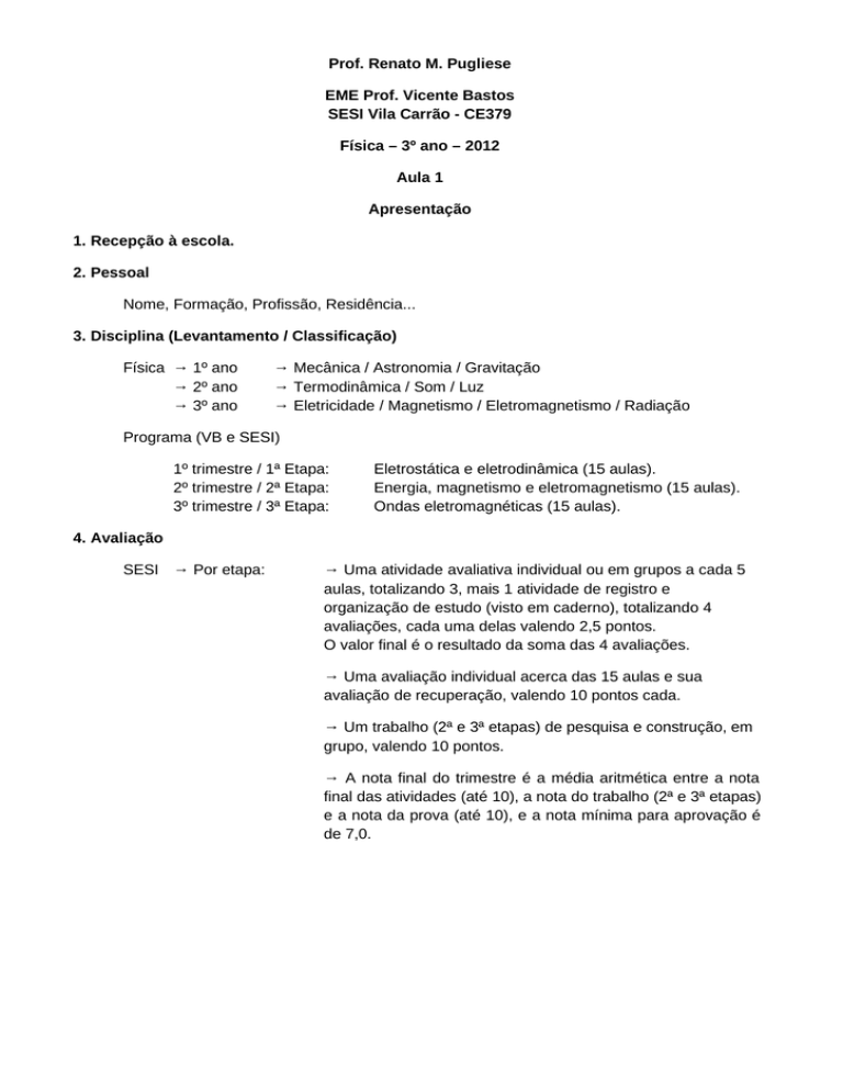 Prof. Renato M. Pugliese EME Prof. Vicente Bastos SESI Vila Carrão - CE379 Física – 3º ano – 2012 Aula 1 Apresentação 1. Recepção à escola. 2. Pessoal Nome, Formação, Profissão, Residência... 3. Disciplina (Levantamento / Classificação) Física → 1º ano → 2º ano → 3º ano → Mecânica / Astronomia / Gravitação → Termodinâmica / Som / Luz → Eletricidade / Magnetismo / Eletromagnetismo / Radiação Programa (VB e SESI) 1º trimestre / 1ª Etapa: 2º trimestre / 2ª Etapa: 3º trimestre / 3ª Etapa: Eletrostática e eletrodinâmica (15 aulas). Energia, magnetismo e eletromagnetismo (15 aulas). Ondas eletromagnéticas (15 aulas). 4. Avaliação SESI → Por etapa: → Uma atividade avaliativa individual ou em grupos a cada 5 aulas, totalizando 3, mais 1 atividade de registro e organização de estudo (visto em caderno), totalizando 4 avaliações, cada uma delas valendo 2,5 pontos. O valor final é o resultado da soma das 4 avaliações. → Uma avaliação individual acerca das 15 aulas e sua avaliação de recuperação, valendo 10 pontos cada. → Um trabalho (2ª e 3ª etapas) de pesquisa e construção, em grupo, valendo 10 pontos. → A nota final do trimestre é a média aritmética entre a nota final das atividades (até 10), a nota do trabalho (2ª e 3ª etapas) e a nota da prova (até 10), e a nota mínima para aprovação é de 7,0. Prof. Renato M. Pugliese EME Prof. Vicente Bastos SESI Vila Carrão - CE379 Física – 3º ano – 2012 Aula 2 Eletricidade: onde está? 1. Onde está a eletricidade? - Levantamento de situações, fenômenos, coisas, histórias onde a eletricidade apareça. 2. Classificação - Dentre os seguintes temas: a) tecnologia (com fio, sem fio); b) natureza (humana, não-humana); c) magnetismo. Prof. Renato M. Pugliese EME Prof. Vicente Bastos SESI Vila Carrão - CE379 Física – 3º ano – 2012 Aula 3 Eletricidade: origens e desenvolvimento 1. Do âmbar ao iPhone, 2500 anos de investigação. - Elektron, fluido elétrico, carga elétrica, magnetismo, ondas, campos... 2. Interações fundamentais - massa x gravidade - carga elétrica x eletricidade - ímã x magnetismo 3. Exemplo prático - latinha x canudinho - papéis x caneta - pelos x tela da tv Prof. Renato M. Pugliese EME Prof. Vicente Bastos SESI Vila Carrão - CE379 Física – 3º ano – 2012 Aula 4 Eletrostática: processos de eletrização 1. Processos clássicos de eletrização a) Atrito antes → corpos neutros durante → atrito físico dinâmico depois → corpos com diferentes cargas com igual valor b) Contato antes → corpo carregado e corpo neutro durante → contato físico estático depois → corpos com cargas iguais equivalentes à ½ da carga inicial c) Indução antes → corpo carregado e corpo neutro durante 1 → aproximação e indução de separação de cargas durante 2 → aterramento de corpo neutro depois → corpos com diferentes cargas Prof. Renato M. Pugliese EME Prof. Vicente Bastos SESI Vila Carrão - CE379 Física – 3º ano – 2012 Aula 5 Eletrostática: carga e força elétrica – Lei de Coulomb 1. Eletrostática a) Carga Elétrica (Q) [Q] = C → Coulomb Ex.: Q = 3C, 450 C, 10⁶ C... → Quantificação microscópica Q = n.e n: quantidade de cargas elementares (e, p) e: carga elementar (e, p) e = 1,6.10-19C b) Força elétrica (F) → Lei de Coulomb F ∝ Q1 F ∝ Q2 F ∝ 1/d² F ∝ Q1.Q2/d² → Comparando com Peso e outras forças K = constante elétrica F = K.Q1.Q2/d² → Unidades [F] = N [d] = m [K] = Nm²/C² Prof. Renato M. Pugliese EME Prof. Vicente Bastos SESI Vila Carrão - CE379 Física – 3º ano – 2012 Aula 6 Eletrostática: campo elétrico e espaço físico 1. Campo elétrico (E) a) Conceito → Comparação com campos gravitacional e magnético. → Justifica a ação à distância. → Região no entorno de uma carga elétrica onde outra carga sente força (atrativa ou repulsiva). b) Quantificação E = K.Q/d2 [E] = N/m F = q.E c) Representação gráfica Prof. Renato M. Pugliese EME Prof. Vicente Bastos SESI Vila Carrão - CE379 Física – 3º ano – 2012 Aula 7 Eletrostática: campo elétrico - exercícios 1. Exercícios I. Sobre uma carga elétrica de 2,0.10-6C, colocada em certo ponto do espaço, age uma força de intensidade 0,80N. Despreze as ações gravitacionais. A intensidade do campo elétrico nesse ponto é: a) 1,6.10-6N/C b) 1,3.10-5N/C c) 2,0.103N/C d) 1,6.105N/C e) 4,0.105N/C II. Uma carga pontual Q, positiva, gera no espaço um campo elétrico. Num ponto P, a 0,5m dela, o campo tem intensidade E=7,2.106N/C. Sendo o meio vácuo onde K0=9.109 unidades S.I., determine Q. a) 2,0.10-4C b) 4,0.10-4C c) 2,0.10-6C d) 4,0.10-6C e) 2,0.10-2C Prof. Renato M. Pugliese EME Prof. Vicente Bastos SESI Vila Carrão - CE379 Física – 3º ano – 2012 Aula 8 Eletrostática: potencial elétrico e diferença de potencial 1. Potencial elétrico (V) a) Conceito → Capacidade de um ponto do campo elétrico de uma carga acelerar outra carga. → Comparação com campo gravitacional. → Diferentes materiais com diferentes potenciais elétricos. b) Quantificação Va = K.Q/da [V] = V (Volt) 2. Diferença de Potencial Elétrico (d.d.p.) → Causa da aceleração das cargas. → Comparar com d.d.p. Gravitacional. → Ex.: Pilhas, baterias, tomadas...: dois polos com potenciais diferentes (ddp). → Tensão elétrica (U). Prof. Renato M. Pugliese EME Prof. Vicente Bastos SESI Vila Carrão - CE379 Física – 3º ano – 2012 Aula 9 Condutores e isolantes: definição e limites 1. Condutores e isolantes → Materiais diferentes com diferentes estruturas elétricas. a) Condutores → Materiais que contêm excesso de cargas “livres” (elétrons, íons...). → Ex.: Metais, soluções (ácidas / básicas)... b) Isolantes → Materiais que contém desprezível quantidade de cargas “livres”. → Ex.: Vidro, cerâmica, plástico, borracha... 2. Choques elétricos: atividade prática → O corpo como isolante e c
