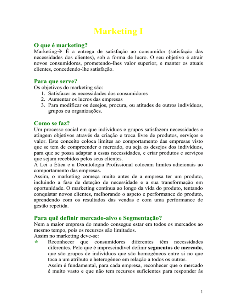 Marketing I O que é marketing? Marketing É a entrega de satisfação ao consumidor (satisfação das necessidades dos clientes), sob a forma de lucro. O seu objetivo é atrair novos consumidores, prometendo-lhes valor superior, e manter os atuais clientes, concedendo-lhe satisfação. Para que serve? Os objetivos do marketing são: 1. Satisfazer as necessidades dos consumidores 2. Aumentar os lucros das empresas 3. Para modificar os desejos, procura, ou atitudes de outros indivíduos, grupos ou organizações. Como se faz? Um processo social em que indivíduos e grupos satisfazem necessidades e atingem objetivos através da criação e troca livre de produtos, serviços e valor. Este conceito coloca limites ao comportamento das empresas visto que se tem de compreender o mercado, ou seja os desejos dos indivíduos, para que se possa adaptar a essas necessidades, e criar produtos e serviços que sejam recebidos pelos seus clientes. A Lei a Ética e a Deontologia Profissional colocam limites adicionais ao comportamento das empresas. Assim, o marketing começa muito antes de a empresa ter um produto, incluindo a fase de deteção de necessidade e a sua transformação em oportunidade. O marketing continua ao longo da vida do produto, tentando conquistar novos clientes, melhorando o aspeto e performance do produto, aprendendo com os resultados das vendas e com uma performance de gestão repetida. Para quê definir mercado-alvo e Segmentação? Nem a maior empresa do mundo consegue estar em todos os mercados ao mesmo tempo, pois os recursos são limitados. Assim no marketing deve-se: Reconhecer que consumidores diferentes têm necessidades diferentes. Pelo que é imprescindível definir segmentos de mercado, que são grupos de indivíduos que são homogéneos entre si no que toca a um atributo e heterogéneo em relação a todos os outros. Assim é fundamental, para cada empresa, reconhecer que o mercado é muito vasto e que não tem recursos suficientes para responder às 1 necessidades de todos o mercado, pelo que subdivido o mercado em vários grupos. Aperceber-me de quais são os atributos mais importantes. Ou seja se estou a vender sapatos desportivos, não me interessa subdivir o mercado de acordo com a cor de cabelo. Os critérios de segmentação são: Geográficos: Região/país Regiões de um país Urbano, suburbano, rural Demográficos: Idade Sexo Dimensão da família Ciclo de vida da família Níveis de rendimento Tipo de emprego Formação escolar Psicográficos: Classe Social Estilo de Vida (as pessoas ao comprarem um produto, querem que ele se adeque a um estilo de vida: saudável, amigo do ambiente, etc.) Personalidade Comportamentais. Benefícios: qualidade, economia, conveniência, rapidez Ocasião: regular, ocasião especial Tipo de utilizador: não utilizador, ex-utilizador, utilizador potencial… Nível de utilização: utilização mínima, utilização média, utilização elevada Lealdade/ Fidelidade Atitude face ao produto Posicionamento O processo de colocação de um produto/ serviço num lugar claro, distintivo e desejável na mente dos clientes-alvo através de um marketing mix adequado. Assim a única forma de garantir crescimento sustentado e continuado numa empresa é: Concentrar-se nas necessidades dos clientes Definir o negócio da empresa em termos de necessidades de clientes e não em termos de forma de produto ou tecnologia. 2 A razão de ser de qualquer empresa reside nos problemas que resolve à sociedade ou seja, nas necessidades dos clientes que satisfaz. Break – Even Custos fixos Independentes da quantidade vendida ou produzida (são proporcionais no tempo). Custos variáveis Proporcionais à quantidade vendida ou produzida. Margem de Contribuição Unitária Diferença entre o preço e o custo variável. = Pv-CVu Preço de venda unitária - Custo variável unitário =Margem de Contribuição Unitária - Custos fixos Margem liquida (antes de imposto) 50€ -20€ 30€ -10€ 20€ É a margem que esta vende vai libertar para cobrir os custos fixos O Break – Even point é o ponto onde as receitas totais são iguais à linha de custos, ou seja onde o lucro (margem liquida) é nulo. A partir dessa quantidade a empresa obtém lucro. A empresa pode praticar um preço mais baixo do Break-Even point desde que estes cubram os custos variáveis e parte dos custos fixos. (?) Cálculo: Lucro = Receitas – Custo Total Receitas = Preço de venda de cada unidade (Pu)* Unidade Vendida (Q) Custos Totais = Custos variáveis (CV) + Custos Totais (CT) Lucro = Pu*Q – (CV+CT) 3 Custos Variáveis = Q* Custo variável unitário (CVu) Lucro = Pu*Q- (Q*CVu+CT) Lucro = Q(Pu-CVi) –CF Margem de Contribuição Unitária Lucro= Q*MCu-CF Se Lucro=0 0=Q(no ponto de Break Even)*MC-CF Quantidade no ponto de Break even= CF/MCu Se conseguir vender mais do que essa quantidade terei lucro. A fórmula da margem de contribuição unitária é : (P-CVu)/P Quando se fala em margem fala-se em função do preço. Se a margem for 5% significa que por cada € que vendo esse 1€ liberta 5 cêntimos para cobrir os custos fixos. Se multiplicar pelo preço, como por exemplo, 5€. 5%*5€= 0,25 Ou seja por cada unidade do produto que vendo essa unidade liberta 0,25 cêntimos para cobrir os custos fixos e remunerar os acionistas. ROI= Margem liquida depois de impostos/ Investimento O ROI dá-me a rentabilidade de investimento depois de pagar: custos Impostos Diz-me que depois de investir um montante, qual o lucro que o acionista retirou do investimento que fez. Previsões de Vendas e Incerteza As previsões de vendas são incertas e esta incerteza aumenta à medida que se avança para o futuro. Assim apesar de muitos investimentos exigirem que se considere o futuro para os justificar, é muito difícil fazer contas e justificar razoabilidade dos números para períodos futuros. 4 Ambiente de Marketing As companhias têm sucesso desde que adaptem os seus produtos ou serviços ao ambiente