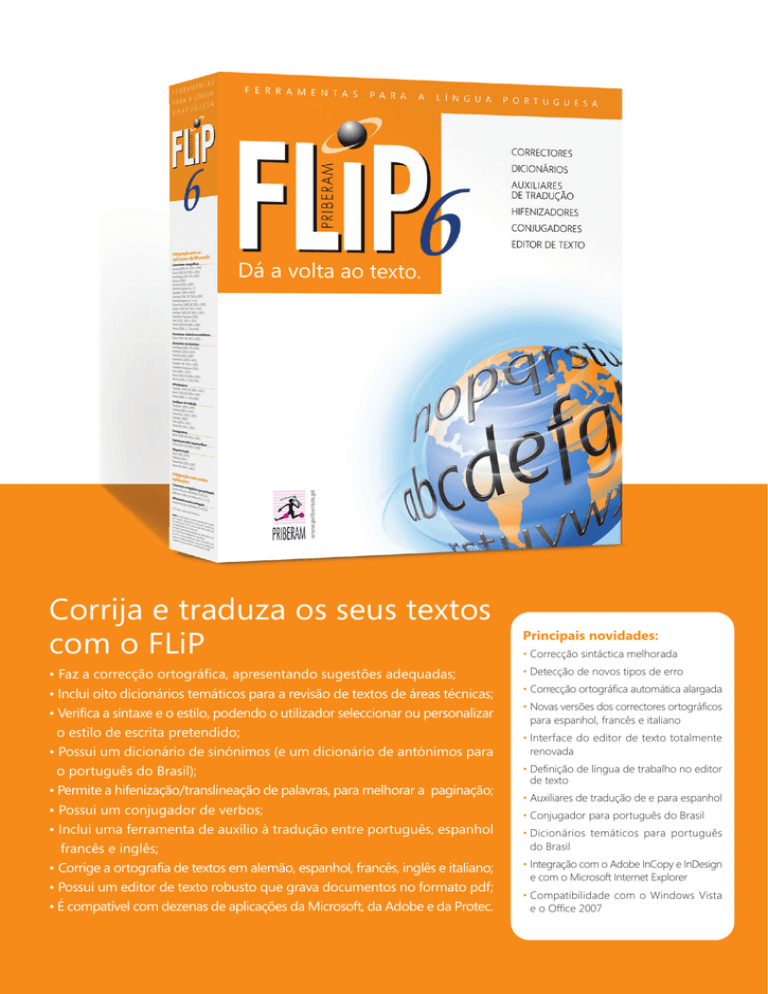 Corrija e traduza os seus textos com o FLiP • Faz a correcção ortográfica, apresentando sugestões adequadas; • Inclui oito dicionários temáticos para a revisão de textos de áreas técnicas; • Verifica a sintaxe e o estilo, podendo o utilizador seleccionar ou personalizar o estilo de escrita pretendido; • Possui um dicionário de sinónimos (e um dicionário de antónimos para o português do Brasil); • Permite a hifenização/translineação de palavras, para melhorar a paginação; • Possui um conjugador de verbos; • Inclui uma ferramenta de auxílio à tradução entre português, espanhol francês e inglês; • Corrige a ortografia de textos em alemão, espanhol, francês, inglês e italiano; • Possui um editor de texto robusto que grava documentos no formato pdf; • É compatível com dezenas de aplicações da Microsoft, da Adobe e da Protec. Principais novidades: • Correcção sintáctica melhorada • Detecção de novos tipos de erro • Correcção ortográfica automática alargada • Novas versões dos correctores ortográficos para espanhol, francês e italiano • Interface do editor de texto totalmente renovada • Definição de língua de trabalho no editor de texto • Auxiliares de tradução de e para espanhol • Conjugador para português do Brasil • Dicionários temáticos para português do Brasil • Integração com o Adobe InCopy e InDesign e com o Microsoft Internet Explorer • Compatibilidade com o Windows Vista e o Office 2007 F E R R A M E N T A S Requisitos: • PC compatível Intel (32 bits) • 256 MB de memória • Disco com 110 MB de espaço disponível • Leitor de CD-ROM • Microsoft Windows 2000 SP4, XP SP2, Server 2003 ou Vista • Internet Explorer 6 ou 7 P A R A A L Í N G U A P O R T U G U E S A Conheça algumas funcionalidades do FLiP 6 1 Detecção e correcção de erros ortográficos, permitindo a verificação de palavras enquanto o texto é redigido. 2 Dicionários temáticos para reconhecimento e correcção de vocabulário especializado (Artes, Ciências Exactas, Engenharia e Técnicas, Ciências Históricas, Geográficas e afins, Ciências Médicas, Ciências Naturais, Ciências Sociais, Filosofia, Linguística, Letras e Teologia, Nomes Próprios Estrangeiros). 3 Detecção e correcção de erros gramaticais em frases completas e verificação estilística 5 Apresentação de sinónimos, divididos por acepções, classificação gramatical e proximidade de sentidos. Integração com as aplicações da Microsoft: Correctores ortográficos Access (2000, XP, 2003 e 2007) • Excel (2000, XP, 2003 e 2007) • FrontPage (2000,XP e 2003) • Groove (2007) • InfoPath (2003 e 2007) • Internet Explorer (6 e 7)1 • OneNote (2003 e 2007) • Outlook (2000, XP, 2003 e 2007) • Outlook Express (4, 5 e 6) • PowerPoint (2000, XP, 2003 e 2007) • Project (2000, XP, 2003 e 2007) • Publisher (2000, XP, 2003 e 2007) • SharePoint Designer (2007) • Visio (2002, 2003 e 2007) • Word (2000, XP, 2003 e 2007) • Works (2000, 6, 7, 8 e 2006) Correctores sintácticos e estilísticos Word (2000, XP, 2003 e 2007) Dicionários de sinónimos FrontPage (2000, XP e 2003) • OneNote (2003 e 2007) • Outlook (2003 e 2007)• PowerPoint (2003 e 2007) • Publisher (XP, 2003 e 2007) • SharePoint Designer (2007) • Visio (2003 e 2007) • Word (2000, XP, 2003 e 2007) • Works (2000, 6, 7, 8 e 2006) Hifenizadores Publisher (2000, XP, 2003 e 2007) • Word (2000, XP, 2003 e 2007) • Works (2000, 6, 7, 8 e 2006) com explicação gramatical. Nota: Para o português do Brasil também são apresentados antónimos. Concordância entre sujeito e predicado Auxiliares de tradução OneNote (2003 e 2007) • Outlook (2003 e 2007) • PowerPoint (2003 e 2007) • Publisher (2007) • Visio (2003 e 2007) • Word (XP, 2003 e 2007) O sujeito e o predicado de uma oração concordam em género, número e pessoa. Ex.: Os atletas cortaram a meta. A Carla acenou à Rita. A gente foi ao cinema. Alguém passou por aqui. As provas foram canceladas pelo júri. O tripé e a máquina foram comprados pelo Rui. Conjugadores Word (2000, XP, 2003 e 2007) 6 O predicativo do sujeito concorda em género e número com o sujeito da oração a que pertence. Suplemento (add-in) para o Word Word (2000, XP, 2003 e 2007) Correctores ortográficos para português Adobe InCopy e InDesign (CS e CS2) Milenium Editor da Protec (4.5, 5 e 5.5) andar right 1 nome modo de andar; paso. 1 advérbio droit; debout. 2 nome apartamento; piso. Ex.: Ela ficou eufórica. O Pedro e a Ana sentiram-se enganados. 3 nome piso; planta; nivel; niveles. Etiquetas LegiX Excel (2003, 2007) • Outlook (2007) • PowerPoint (2003, 2007) • Word (XP, 2003 e 2007) Integração com outras aplicações: Propostas de tradução entre português, espanhol, francês e inglês (qualquer combinação). 4 verbo caminar; ir; pasear; viajar; avanzar; marchar; rodar; atravesar. 5 verbo estar; ser. 4 6 verbo participar; frequentar. Conjugação de verbos. 7 verbo andar; salir. 7 Hifenizadores para português Adobe InCopy e InDesign (CS e CS2) 2 adjectivo exact; vrai; bon; bonne; correct; moral; droit; droite. 3 nome faculté; pouvoir; droite; morale. chover a potes 1 verbo pleuvoir à flots; pleuvoir à seaux; pleuvoir à verse; pleuvoir comme grêle; pleuvoir comme vache qui pisse; pleuvoir des cordes; Correctores ortográficos para alemão, espanhol, francês, inglês e italiano. (1) Só para o português (europeu). Nota: As aplicações e versões indicadas são aquelas que estavam disponíveis no mercado na altura do lançamento do FLiP 6, tendo sido feitos testes de compatibilidade com todas elas. Consulte uma lista actualizada das aplicações com que o FLiP 6 é compatível em www.flip.pt. O FLiP 6 inclui um editor de texto compatível com todas os módulos indicados acima com excepção do Suplemento para o Word e das Etiquetas LegiX. Outros produtos FLiP: FLiP:mac - Inclui um corrector ort