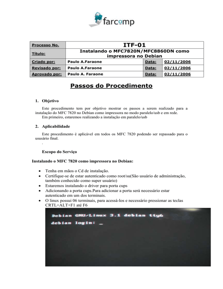 ITF-01 Processo No. Instalando o MFC7820N/MFC8860DN como impressora no Debian Título: Criado por: Paulo A.Faraone Data: 02/11/2006 Revisado por: Paulo A.Faraone Data: 02/11/2006 Aprovado por: Paulo A. Faraone Data: 02/11/2006 Passos do Procedimento 1. Objetivo Este procedimento tem por objetivo mostrar os passos a serem realizado para a instalação do MFC 7820 no Debian como impressora no modo paralelo/usb e em rede. Em primeiro, estaremos realizando a instalação em paralelo/usb 2. Aplicabilidade Este procedimento é aplicável em todos os MFC 7820 podendo ser repassado para o ususário final. . Escopo do Serviço Instalando o MFC 7820 como impressora no Debian: Tenha em mãos o Cd de instalação. Certifique-se de estar autenticado como root/su(São usuário de administração, também conhecido como super usuário) Estaremos instalando o driver para porta cups Adicionando a porta cups.Para adicionar a porta será necessário estar autenticado em um dos terminais. O linux possui 06 terminais, para acessá-los e necessário pressionar as teclas CRTL+ALT+F1 até F6 Entre com o usuário root, pressione a tecla enter e será solicitada a senha. apt-get install cupsys apt-get install cupsys-bsd cupsys-client apt-get install cupsomatic-ppd Após a instalação desses aplicativos, verifique se a porta cups está ativa. Abra o browser e digite http://localhost.localhost.localdomain:631 Após aparecer a tela, sua porta cups foi instalada com sucesso. Acesso o site http://solutions.brother.com/linux e faça download dos drivers para a porta cup´s e lpr. São eles: brmfc7820nlpr_1.1.2-4_i386.deb/cupswrappermfc7820n_1.0.12_i386.deb. Instale primeiro o driver lpr: brmfc7820nlpr_1.1.2-4_i386.deb Dpkg –i brmfc7820nlpr_1.1.2-4_i386.deb Instale agora o driver cups: cupswrappermfc7820n_1.0.1-2_i386.deb. Dpkg –i cupswrappermfc7820n_1.0.1-2_i386.deb. Feito isso, os driver estão instalados. Verificando a instalação e realizando um teste de impressão. Abra seu browser e digite http://localhost.localhost.localdomain:631 Aparecerá a tela abaixo: Clique em Manage printers Clique em Modify Printer Selecione a porta de impressão desejada Selecione o fabricante Selecione a porta de instalação do Linux Configuração realizada com sucesso Faça um teste de impressão A instalação da impressora ocorreu com sucesso. Vamos agora instalar a impressora em rede. Para instalar a impressora em rede, devemos seguir o mesmo passo acima descrito para uma instalação local. Após a instalação local, vamos alterar a porta de comunicação para TCP/ip. Clique em iniciar>configurações>gerenciador de impressão. (lembrando que esse caminho pode ser alterado, dependendo da instalação e customização realizada) Aparecerá a tela abaixo: Selecione a impressora desejada e clique em propriedades Selecione a opção interface seguido da tecla modificar.Aparecerá a opção “modificar impressora”, clique em impressora de rede(TCP) e próximo. Nessa tela, digite o IP do equipamento, o número da porta 9100(lembrando que para todos os equipamentos Brother será essa porta). Clique em configurações, aparecerá uma opção para você digitar. Entre com os dados solicitados: Sub-rede:192.168.0(exemplo).Não precisa digitar o último número, pois a opção [0-255] já o faz automático Porta: 9100 Clique em varrer Espere completar o processo O equipamento será localizado em rede Selecione o IP e clique em finalizar O equipamento está instalado em rede. Clique em instâncias e faça um reste de impressão ITF-02 Processo No. Título: Instalando o MFC7820n/MFC8860DN como escaner no Debian Criado por: Paulo A.Faraone Data: 02/11/2006 Revisado por: Paulo A.Faraone Data: 02/11/2006 Aprovado por: Paulo A. Faraone Data: 02/11/2006 Passos do Procedimento 3. Objetivo Este procedimento tem por objetivo mostrar os passos a serem realizado para a instalação do MFC 7820 no Debian como escaner em modo usb e em rede. Em primeiro, estaremos realizando a instalação em usb. OBS: A instalação local ocorre somente no modo USB. 4. Aplicabilidade Este procedimento é aplicável em todos os MFC 7820 podendo ser repassado para o ususário final. . Escopo do Serviço Instalando o MFC 7820 como escaner no Debian: Tenha em mãos o Cd de instalação. Certifique-se de estar autenticado como root/su(São usuário de administração, também conhecido como super usuário) Estaremos instalando o driver para porta cups Certifique-se de que a porta cups esteja instalada. Entre em um dos terminais, faça o login Instale o sane Apt-get install sane xsane Apt-get install gimp Acesse o site http://solutions.brother.com/linux Faça o download do driver:brscan2-0.2.1-0.i386.deb dpkg –i brscan2-0.2.1-0.i386.deb vi /etc/fstab Após digitado vi /etc/fstab, aparecerá a tela abaixo para inserir linha de comando Inserir as linhas faltantes. OBS: Tecla insert libera o texto para inserção de comando Tecla :x salva e fecha o texto. debian:/home/paulo* echo 'none /proc/bus/usb usbfs auto,devmode=0666 0 0' >> /etc/fstab debian:/home/paulo* cat /etc/fstab # /etc/fstab: static file system information. # # <file system> <mount point> <type> <options> <dump> <pass> proc /proc proc defaults 0 0 /dev/hda1 / ext3 defaults,errors=remount-ro 0 1 /dev/hda5 none swap sw 0 0 /dev/hdb /media/cdrom0 iso9660 ro,user,noauto 0 0 /dev/fd0 /media/floppy0 auto rw,user,noauto 0 0 none /proc/bus/usb usbfs auto,devmode=0666 0 0 debian:/home/paulo* umont /proc/bus/usb umont: /proc/bus/usb: not mounted debian:/home/paulo* mount /proc/bus/usb debian:/home/paulo* mknod -m 666 /dev/usbscanner c180 48 Para sair dessa tela e salvar as alterações, digite esc>:>x(esc:x). O driver está instalado e configurado. Para testar, clique em iniciar>gráficos>editor de imagem(gimp) Clique em capturar>xsane>brother:bus;dev1 REDE Para instalação em rede, deverá abrir um terminal e digitar o comando abaixo: Brsaneconfig2 –a name=house model=MFC-7820N ip=192.168.0.103 OBS: House - No