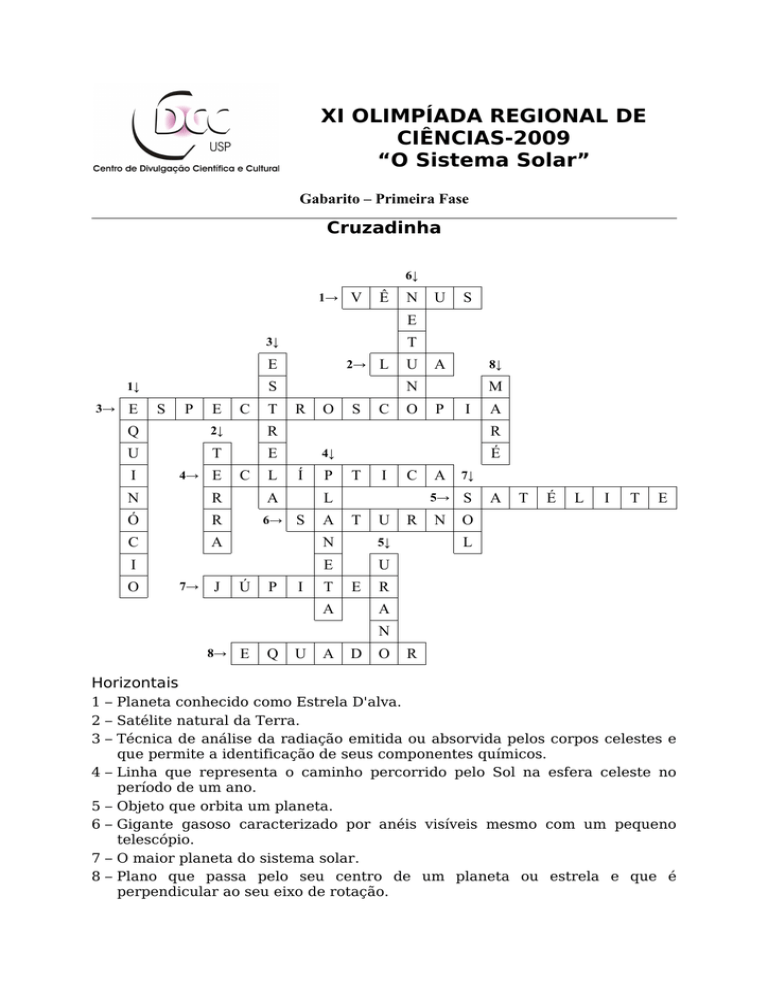 XI OLIMPÍADA REGIONAL DE CIÊNCIAS-2009 “O Sistema Solar” Gabarito – Primeira Fase Cruzadinha 6↓ 1→ V Ê N U S E T 3↓ E E L S 1↓ 3→ 2→ S P E C T Q 2↓ R U T E I 4→ E C L N R A Ó R 6→ C A 7→ J Ú P A 8↓ N R O S C O M P I A R É 4↓ Í P T I C L S I O U I A T U N 5↓ E U T E A R A 7↓ 5→ S N O A T É L I T E L R A N 8→ E Q U A D O R Horizontais 1 – Planeta conhecido como Estrela D'alva. 2 – Satélite natural da Terra. 3 – Técnica de análise da radiação emitida ou absorvida pelos corpos celestes e que permite a identificação de seus componentes químicos. 4 – Linha que representa o caminho percorrido pelo Sol na esfera celeste no período de um ano. 5 – Objeto que orbita um planeta. 6 – Gigante gasoso caracterizado por anéis visíveis mesmo com um pequeno telescópio. 7 – O maior planeta do sistema solar. 8 – Plano que passa pelo seu centro de um planeta ou estrela e que é perpendicular ao seu eixo de rotação. XI Olimpíada Regional de Ciências – 2009 Verticais 1 – Momento em que o Sol cruza o equador e que coincide com o início da primavera ou do outono. 2 – Planeta com atmosfera rica em oxigênio. 3 – Corpo gasoso que libera energia resultante de reações de fusão nuclear. 4 – Corpo que percorre uma órbita estável e limpa em torno de uma estrela e que possui massa suficiente para ter uma forma esférica. 5 – Planeta gasoso com eixo de rotação quase alinhado com o plano de sua órbita. 6 – O planeta gasoso mais distante do Sol. 7 – Estrela em torno da qual a Terra orbita. 8 – Variação periódica da altura dos oceanos devido à ação gravitacional combinada da Lua e do Sol. Questões Questão 1 É uma regra da União Astronômica Internacional (UAI) que para um astro ser chamado de PLANETA ele precisa: A) Girar ao redor de uma estrela (com ou sem luas ao seu redor, grande ou pequeno, não importa); B) Ser redondo como uma bola (ou quase redondo) (com ou sem anéis, não importa) C) Não pode ter vizinhos próximos dele, ou seja, ele tem que ser o “rei do pedaço”! “O manda chuva!” Mas para ser chamado de PLANETA ANÃO ele precisa atender aos itens A) e B) e não atender ao C). Sabendo isso, marque na tabela a classificação de cada um dos astros. Planeta Astro Planeta Anão Mercúrio (X) ( ) Vênus (X) ( ) Plutão ( ) (X) Júpiter (X) ( ) Urano (X) ( ) Netuno (X) ( ) Terra (X) ( ) Ceres ( ) (X) Marte (X) ( ) Éris ( ) (X) Saturno (X) ( ) Questão 2 Os planetas do Sistema Solar podem ser divididos em vários tipos de classificações. Uma delas refere-se à natureza da sua constituição material predominante no que diz respeito a sua superfície: Os planetas podem ser chamados de gasosos ou jovianos ou ser chamados de rochosos ou telúricos. No caso dos oito planetas do Sistema Solar classifique-os como: Planeta Joviano ( J ) ou Planeta Telúrico ( T ). Terra Saturno Júpiter Mércurio Marte Netuno Urano Vênus ( ( ( ( ( ( ( ( T) J) J) T) T) J) J) T) 2 XI Olimpíada Regional de Ciências – 2009 Questão 3 A figura representa o Sistema Sol – Terra – Lua. Quando a Lua está na fase nova, isto é, quando a chamamos de “Lua Nova”, ela não é visível no céu. Qual das cinco posições indicadas na figura corresponde à da Lua Nova? B Terra A C x Sol E D Considere o texto a seguir nas questões 4 e 5 A atmosfera é uma camada de gases que forma uma região de contato entre a superfície terrestre e o espaço "sem matéria" do universo. Desempenha um papel fundamental na interação da superfície terrestre com o espaço, absorvendo o bombardeamento de diversas partículas e também agindo como filtro das radiações solares incidentes. As radiações emitidas pelo Sol situam-se em praticamente todo o espectro conhecido das radiações eletromagnéticas. Uma parte da radiação incidente é absorvida pela superfície da Terra e reemitida sob forma de radiação infravermelha (ondas curtas – calor). Alguns gases presentes na atmosfera absorvem esta radiação infravermelha aumentando a sua temperatura. Podemos dizer que a atmosfera serve como “protetor” durante o dia e um “cobertor” durante a noite. Este fenômeno é conhecido como Efeito Estufa. A vida como conhecemos só existe devido ao papel que a atmosfera exerce, mantendo a temperatura no nosso planeta sem variações consideráveis. Na Lua, onde não existe atmosfera, as temperaturas na superfície durante o dia chegam a 100°C e durante a noite a –150°C. O aumento da quantidade de gases como CO2 (dióxido de carbono), CH4 (metano), N2O (óxido nitroso) entre outros, está aumentando a absorção da radiação infravermelha. Desse modo uma maior parte da radiação reemitida pela superfície da Terra é absorvida pela atmosfera e não retorna ao espaço, intensificando o Efeito Estufa. Isto faz com que a temperatura média aumente. Questão 4 Qual ou quais dos planetas a seguir apresentam efeito estufa. A) Marte B) Terra C) Mercúrio D) Vênus Questão 5 Qual dos processos a seguir contribui fortemente para o aumento da concentração de gases do efeito estufa na atmosfera da Terra? A) fotossíntese B) queima de combustíveis fósseis C) reflorestamento D) derretimento das calotas polares E) o uso de álcool de cana em automóveis 3 XI Olimpíada Regional de Ciências – 2009 Questão 6 Segundo a Teoria da Relatividade a velocidade máxima com que uma informação pode ser transmitida é a velocidade da luz. Isto pode dificultar a comunicação entre pessoas que se encontrem em planetas diferentes. Suponha que, daqui a alguns anos, você esteja na Terra conversando pelo telefone com um amigo que está em Marte. Sabendo que a velocidade da luz é de 300.000km/s e a distância Terra-Marte no momento da conversa é de 300 milhões de quilômetros, quanto tempo você teria que esperar entre o instante em que você termina de fazer uma pergunta e o instante em que você começa a ouvir a resposta do seu amigo? A) 33,3 minu