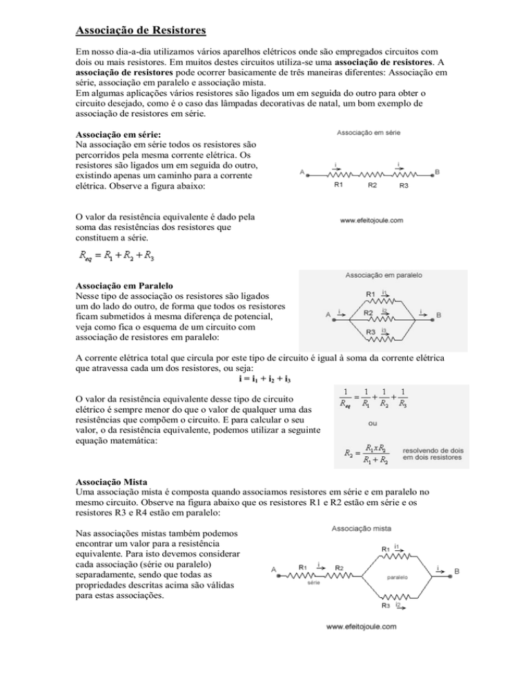 Associação de Resistores Em nosso dia-a-dia utilizamos vários aparelhos elétricos onde são empregados circuitos com dois ou mais resistores. Em muitos destes circuitos utiliza-se uma associação de resistores. A associação de resistores pode ocorrer basicamente de três maneiras diferentes: Associação em série, associação em paralelo e associação mista. Em algumas aplicações vários resistores são ligados um em seguida do outro para obter o circuito desejado, como é o caso das lâmpadas decorativas de natal, um bom exemplo de associação de resistores em série. Associação em série: Na associação em série todos os resistores são percorridos pela mesma corrente elétrica. Os resistores são ligados um em seguida do outro, existindo apenas um caminho para a corrente elétrica. Observe a figura abaixo: O valor da resistência equivalente é dado pela soma das resistências dos resistores que constituem a série. Associação em Paralelo Nesse tipo de associação os resistores são ligados um do lado do outro, de forma que todos os resistores ficam submetidos à mesma diferença de potencial, veja como fica o esquema de um circuito com associação de resistores em paralelo: A corrente elétrica total que circula por este tipo de circuito é igual à soma da corrente elétrica que atravessa cada um dos resistores, ou seja: i = i1 + i2 + i3 O valor da resistência equivalente desse tipo de circuito elétrico é sempre menor do que o valor de qualquer uma das resistências que compõem o circuito. E para calcular o seu valor, o da resistência equivalente, podemos utilizar a seguinte equação matemática: Associação Mista Uma associação mista é composta quando associamos resistores em série e em paralelo no mesmo circuito. Observe na figura abaixo que os resistores R1 e R2 estão em série e os resistores R3 e R4 estão em paralelo: Nas associações mistas também podemos encontrar um valor para a resistência equivalente. Para isto devemos considerar cada associação (série ou paralelo) separadamente, sendo que todas as propriedades descritas acima são válidas para estas associações. 1- O fusível é considerado um dispositivo que previne os circuitos elétricos. Eles são ligados em série, e a parte do circuito elétrico, deve ficar protegida. Eles são compostos por alguns condutores de baixo ponto de fusão, como por exemplo, o estanho e o chumbo. Quando uma corrente elétrica de intensidade maior do que a permitida passa por esse circuito, elas se fundem e interrompem o circuito. 2- O Disjuntor tem a mesma função do fusível que é proteger uma instalação elétrica contra os circuitos elétricos, ou seja, ele abre o circuito caso a corrente elétrica ultrapasse determinado valor. Vejamos como são os disjuntores: Potência elétrica Quando um trabalho é realizado num intervalo de tempo menor que a de outro, nos referimos à potência, estamos relacionando o trabalho com o tempo gasto para realizá-lo Se um guindaste A demora, por exemplo, 100s para elevar os blocos, enquanto o guindaste B gasta 150s, as potências dos dois guindastes são diferentes. Cálculo da Potência Elétrica Em Física o conceito de trabalho pode estar relacionado à transferência de energia. Assim podemos escrever a equação da potência da seguinte forma: Exemplo: Suponha que um resistor, submetido a uma determinada tensão e a uma intensidade de corrente, transforma 14.000J de energia elétrica em energia térmica, em 5s. Qual será a potência desse resistor? Podemos calcular o valor da potência, multiplicando o valor da tensão elétrica aplicada no circuito (U) pelo valor da intensidade da corrente (i) que percorre o resistor. Exemplo: Uma lâmpada incandescente apresenta os calores nominais 120V – 150W. Qual o valor da resistência elétrica dessa lâmpada? EXERCÍCIOS A figura abaixo está relacionada às questões 1, 2 e 3. 1) Observe os esquemas dos circuitos A, B e C. Indique o tipo de resistores: A= B= C= 2) Se a lâmpada R3 se queimar, o que irá acontecer nos circuitos com as demais lâmpadas: A= B= C= 3) Calcule a intensidade de cada circuito. R1=2Ω; R2=4Ω; R3=6Ω; R4=8;R5=10Ω 4) Em uma residência, na qual a voltagem é de 120V, está instalado um fusível de 27A. Nesta residência são utilizados eventualmente diversos aparelhos eletrodomésticos, nos quais encontra-se especificada a potência de cada um: Chuveiro: 20A ; Televisor: 1A; Liquidificador: 2A; Ebulidor: 7A; Lâmpadas: 0,5A(cada uma). O fusível queimará se forem ligados simultaneamente: ( ) chuveiro, o televisor e o liquidificador. ( ) O chuveiro e o ebulidor. ( ) O ebulidor, o liquidificador e o televisor. ( ) 10 lâmpadas, o televisor e o chuveiro. ( ) O ebulidor, o televisor, o liquidificador e 5 lâmpadas. 5)Quais dispositivos tem função que é proteger uma instalação elétrica contra os circuitos elétricos, ou seja, ele abre o circuito caso a corrente elétrica ultrapasse determinado valor.