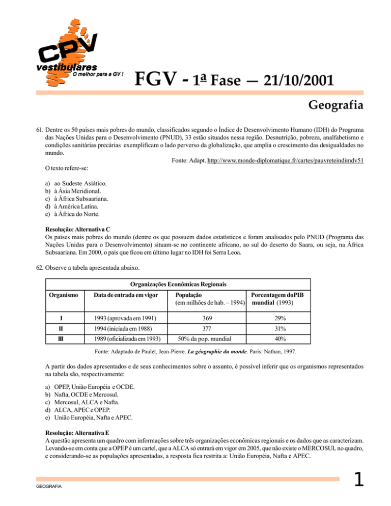 FGV - 1a Fase — 21/10/2001 Geografia 61. Dentre os 50 países mais pobres do mundo, classificados segundo o Índice de Desenvolvimento Humano (IDH) do Programa das Nações Unidas para o Desenvolvimento (PNUD), 33 estão situados nessa região. Desnutrição, pobreza, analfabetismo e condições sanitárias precárias exemplificam o lado perverso da globalização, que amplia o crescimento das desigualdades no mundo. Fonte: Adapt. http://www.monde-diplomatique.fr/cartes/pauvreteindimdv51 O texto refere-se: a) b) c) d) e) ao Sudeste Asiático. à Ásia Meridional. à África Subsaariana. à América Latina. à África do Norte. Resolução: Alternativa C Os países mais pobres do mundo (dentre os que possuem dados estatísticos e foram analisados pelo PNUD (Programa das Nações Unidas para o Desenvolvimento) situam-se no continente africano, ao sul do deserto do Saara, ou seja, na África Subsaariana. Em 2000, o país que ficou em último lugar no IDH foi Serra Leoa. 62. Observe a tabela apresentada abaixo. Organizações Econômicas Regionais Organismo Data de entrada em vigor População Porcentagem doPIB (em milhões de hab. – 1994) mundial (1993) I 1993 (aprovada em 1991) 369 29% II 1994 (iniciada em 1988) 377 31% III 1989 (oficializada em 1993) 50% da pop. mundial 40% Fonte: Adaptado de Paulet, Jean-Pierre. La géographie du monde. Paris: Nathan, 1997. A partir dos dados apresentados e de seus conhecimentos sobre o assunto, é possível inferir que os organismos representados na tabela são, respectivamente: a) b) c) d) e) OPEP, União Européia e OCDE. Nafta, OCDE e Mercosul. Mercosul, ALCA e Nafta. ALCA, APEC e OPEP. União Européia, Nafta e APEC. Resolução: Alternativa E A questão apresenta um quadro com informações sobre três organizações econômicas regionais e os dados que as caracterizam. Levando-se em conta que a OPEP é um cartel, que a ALCA só entrará em vigor em 2005, que não existe o MERCOSUL no quadro, e considerando-se as populações apresentadas, a resposta fica restrita a: União Européia, Nafta e APEC. GEOGRAFIA 1 2 FGV – 21/10/2001 O melhor cursinho especializado na GV 63. Dentre os cenários desenhados para o mundo a partir da aceleração do processo de globalização, destaca-se a idéia da superação do Estado-nação como principal unidade política e econômica de estruturação do espaço mundial. Como justificativa para a construção desse cenário, podem-se destacar, entre outros: a) o crescimento de instituições políticas e econômicas supranacionais, como a Organização Mundial de Comércio, e a relativa autonomia dos circuitos financeiros em escala mundial, caracterizada pela livre circulação de capitais. b) o aumento das migrações inter-regionais, facilitada pela abertura das fronteiras entre os países, e o crescente intercâmbio cultural entre os povos, possibilitado pela expansão dos meios de comunicação em todo o mundo. c) o aparecimento de organizações baseadas no princípio do desenvolvimento sustentável, como as ONGs, e a aceitação de grupos étnicos como entidades políticas e econômicas soberanas, a exemplo dos Curdos, na Turquia. d) a diminuição dos conflitos separatistas, como os ocorridos nos Bálcãs, e o crescente reconhecimento da ONU como fórum privilegiado para a solução de conflitos políticos e econômicos locais e regionais. e) a mundialização dos hábitos de consumo e comportamento, disseminados pelos meios de comunicação, e o crescente desinteresse das novas gerações pelas questões de política interna e externa de seus países. Resolução: Alternativa A A globalização com a expansão das relações capitalistas, ligadas ao Neoliberalismo, leva à criação do Estado-mínimo, no qual o mercado tem a responsabilidade de regular até mesmo as condições sociais. Como resultado, estamos vendo o aumento nas desigualdades sociais e nos índices de pobreza. 64. “Comparada à russa, cada nacionalidade da Ásia central parece cada vez mais apegada às suas tradições, à sua língua; seja porque existe pouca migração; seja porque, por razões religiosas, os casamentos interétnicos são raros; seja porque a maioria da população não fala russo (...) Como a população dessas repúblicas muçulmanas aumenta rapidamente e não emigra para outras regiões mais industrializadas, não é improvável que elas venham a reivindicar mudanças políticas que tornem possível um desenvolvimento mais eficaz e a própria direção de seus negócios. Enfim, coloca-se o problema do Islã nas repúblicas vizinhas do Irã e do Afeganistão, que estão em plena efervescência política e religiosa.” Fonte: Traduzido de Carrière, P. in Geographie – Classes Terminales. Paris: Fernand Nathan, 1983. Redigido na década de 1980, o texto já aponta vários aspectos importantes no atual quadro político interno e externo das seguintes ex-repúblicas soviéticas: a) Lituânia, Letônia e Estônia. c) Turcomenistão, Tadjiquistão e Uzbequistão. e) Geórgia, Armênia e Azerbaijão. b) Ucrânia e Belarus. d) Cazaquistão e Mongólia. Resolução: Alternativa C A questão, bastante atual, enfoca a região conflagrada que envolve o Afeganistão, que faz fronteira com três das antigas repúblicas da ex-URSS: Turcomenistão, Tadjiquistão e Uzbequistão. 65. No que diz respeito às mudanças climáticas, a importância da cooperação é clara, visto que não há como se isolar do sistema climático da Terra e, portanto, dos efeitos decorrentes de alterações de seus padrões. Além disso, nenhuma nação é capaz de, sozinha, mudar o curso ou mesmo desacelerar as prováveis transformações. Por maiores que sejam seus poderes político e econômico, são insuficientes para promover as mudanças necessárias na produção e no consumo mundial. Fonte: Pereira, André Santos. http://www.ivig.coppe.ufrj.br/arquivos/anpec.pdf Assinale a alternativa diretamente relacionada ao texto: a) Os esforços dos pa