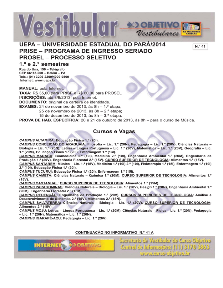 UEPA – UNIVERSIDADE ESTADUAL DO PARÁ/2014 PRISE – PROGRAMA DE INGRESSO SERIADO PROSEL – PROCESSO SELETIVO N.° 41 1.º e 2.° semestres Rua do Una, 156 – Telégrafo CEP 66113-200 – Belém – PA Tels.: (91) 3299-2200/4009-9500 Internet: www.uepa.br MANUAL: pela Internet. TAXA: R$ 35,00 para PRISE e R$ 60,00 para PROSEL INSCRIÇÕES: até 8/9/2013, pela Internet. DOCUMENTO: original da carteira de identidade. EXAMES: 24 de novembro de 2013, às 8h – 1.ª etapa; 25 de novembro de 2013, às 8h – 2.ª etapa; 15 de dezembro de 2013, às 8h – 3.ª etapa. PROVA DE HAB. ESPECÍFICA: 20 e 21 de outubro de 2013, às 8h – para o curso de Música. Cursos e Vagas CAMPUS ALTAMIRA: Educação Física 1.º (20I). CAMPUS CONCEIÇÃO DO ARAGUAIA: Filosofia – Lic. 1.º (20N), Pedagogia – Lic. 1.º (20V), Ciências Naturais – Biologia – Lic. 1.º (20N), Letras – Língua Portuguesa – Lic. 1.º (20V), Matemática – Lic. 1.º (20V), Geografia – Lic. 1.º (20M), Educação Física 1.º (20I), Enfermagem 1.º (13I). CAMPUS MARABÁ: Biomedicina 2.º (10I), Medicina 2.º (10I), Engenharia Ambiental 1.º (20M), Engenharia de Produção 1.º (20V), Engenharia Florestal 2.º (15V). CURSO SUPERIOR DE TECNOLOGIA: Alimentos 1.º (15V). CAMPUS SANTARÉM: Música – Lic. 1.º (15V), Medicina 1.º (10I) 2.º (10I), Fisioterapia 1.º (15I), Enfermagem 1.º (10I) 2.º (10I), Educação Física 1.º (20I). CAMPUS TUCURUÍ: Educação Física 1.º (20I), Enfermagem 1.º (15I). CAMPUS CAMETÁ: Ciências Naturais – Química 1.º (20M). CURSO SUPERIOR DE TECNOLOGIA: Alimentos 1.º (15V). CAMPUS CASTANHAL: CURSO SUPERIOR DE TECNOLOGIA: Alimentos 1.º (15M). CAMPUS PARAGOMINAS: Ciências Naturais – Biologia – Lic. 1.º (20V), Design 1.º (20N), Engenharia Ambiental 1.º (20M), Engenharia Florestal 2.º (15M). CAMPUS REDENÇÃO: Engenharia de Produção 1.º (20V). CURSOS SUPERIORES DE TECNOLOGIA: Análise e Desenvolvimento de Sistemas 2.º (15V), Alimentos 2.º (15N). CAMPUS SALVATERRA: Ciências Naturais – Biologia – Lic. 1.º (20V). CURSO SUPERIOR DE TECNOLOGIA: Alimentos 2.º (15V). CAMPUS MOJU: Letras – Língua Portuguesa – Lic. 1.º (20M), Ciências Naturais – Física – Lic. 1.º (20N), Pedagogia – Lic. 1.º (20N), Matemática – Lic. 1.º (20N). CAMPUS IGARAPÉ-AÇU: Pedagogia – Lic. 1.º (20V). CONTINUAÇÃO NO INFORMATIVO N.º 41 A UEPA – UNIVERSIDADE ESTADUAL DO PARÁ/2014 PRISE – PROGRAMA DE INGRESSO SERIADO PROSEL – PROCESSO SELETIVO N.° 41 A Cursos e Vagas CAMPUS BARCARENA: Geografia – Lic. 1.º (20M). CAMPUS VIGIA: Letras – Língua Portuguesa – Lic. 1.º (20M). CAMPUS SÃO MIGUEL DO GUAMÁ: Letras – Língua Portuguesa – Lic. 1.º (20M), Filosofia – Lic. 1.º (20V), Matemática – Lic. 1.º (20N), Pedagogia – Lic. 1.º (20V). CAMPUS CASTANHAL: Engenharia de Produção 1.º (20M). CURSOS SUPERIORES DE TECNOLOGIA: Alimentos 1.º (15V), Análise e Desenvolvimento de Sistemas 2.º (15V). CAMPUS BELÉM: Matemática 1.º (20M/20V/20N), Ciências Naturais – Física – Lic. 1.º (20M), Ciências Naturais – Química – Lic. 1.º (20V), Letras – Língua Portuguesa – Lic. 1.º (20V/20N), Letras – Língua Inglesa – Lic. 1.º (20V), Letras – Libras – Lic. 1.º (20N), Geografia – Lic. 1.º (20N), Filosofia – Lic. 1.º (20N), História – Lic. 2.º (20V), Música – Lic. 1.º (10M/10N), Pedagogia – Lic. 1.º (20M/20V/20N) 2.º (20V/20N), Ciências da Religião – Lic. 1.º (20V), Secretariado Executivo Trilíngue – Bach. 1.º (20V), Educação Física 1.º (13M/13V/13N) 2.º (12M/12V/12N), Enfermagem 1.º (13M/13V) 2.º (12M/12V), Fisioterapia 1.º (20I), Medicina 1.º (25I) 2.º (25I), Terapia Ocupacional 1.º (20I), Biomedicina 2.º (15I), Design 1.º (20V), Engenharia Ambiental 1.º (20V), Engenharia de Produção 1.º (20M), Engenharia Florestal 1.º (15M). CURSO SUPERIOR DE TECNOLOGIA: Alimentos 1.º (15M). Obs.: Obs.: M = Matutino V = Vespertino N = Noturno I = Integral 1.º = 1.º Semestre/2014 2.º = 2.º Semestre/2014 Obs.: Datas, cursos, número de vagas e períodos sujeitos a alterações pela Comissão de Vestibulares da Instituição. Data: 13/8/2013.