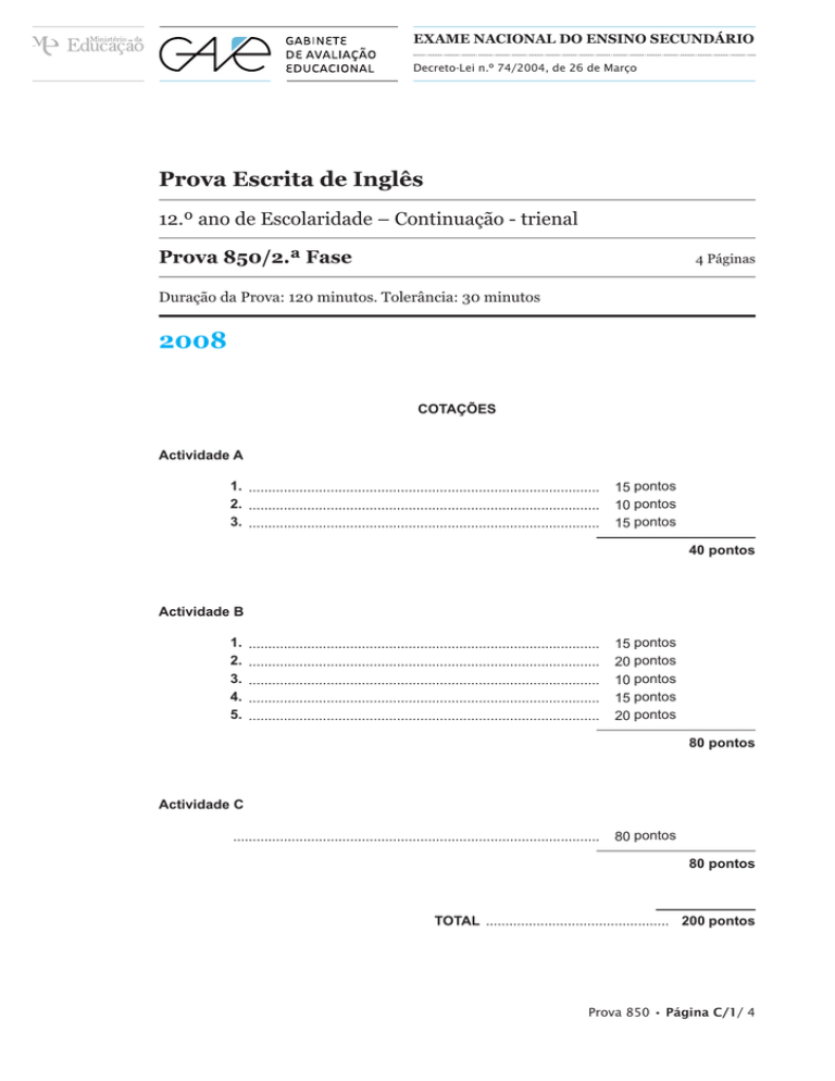 EXAME NACIONAL DO ENSINO SECUNDÁRIO Decreto-Lei n.º 74/2004, de 26 de Março Prova Escrita de Inglês 12.º ano de Escolaridade – Continuação - trienal Prova 850/2.ª Fase 4 Páginas Duração da Prova: 120 minutos. Tolerância: 30 minutos 2008 COTAÇÕES Actividade A 1. .......................................................................................... 2. .......................................................................................... 3. .......................................................................................... 15 pontos 10 pontos 15 pontos 40 pontos Actividade B 1. 2. 3. 4. 5. .......................................................................................... .......................................................................................... .......................................................................................... .......................................................................................... .......................................................................................... 15 pontos 20 pontos 10 pontos 15 pontos 20 pontos 80 pontos Actividade C .............................................................................................. 80 pontos 80 pontos TOTAL ............................................... 200 pontos Prova 850 • Página C/1/ 4 CRITÉRIOS GERAIS DE CLASSIFICAÇÃO Os critérios de classificação estão organizados por níveis de desempenho. As cotações correspondentes a esses níveis são fixas, não podendo ser atribuídas cotações diferentes das indicadas. Para a generalidade dos itens, são considerados de um a três níveis (N3, N2 e N1); para a tarefa final, são considerados cinco níveis em cada parâmetro – competência pragmática e competência linguística (N5, N4, N3, N2 e N1). São previstos níveis intercalares de cotação que não se encontram descritos, de modo a que sejam contempladas possíveis variações nas respostas dos examinandos. Qualquer resposta que não corresponda ao nível mais alto descrito é integrada nos níveis inferiores, de acordo com o nível de desempenho observado. No caso de a resposta apresentar um nível de desempenho inferior ao mais baixo descrito, é classificada com zero pontos. Nos itens de resposta fechada, qualquer resposta indicada de forma equívoca, por exemplo, fornecendo mais respostas do que a(s) pedida(s), é classificada com zero pontos ou, caso o item seja constituído por várias alíneas, de acordo com o nível de desempenho observado na sua totalidade. Nos itens de resposta aberta, é atribuída a classificação de zero pontos a respostas que não correspondam ao solicitado, independentemente da qualidade do texto produzido. Qualquer resposta que contenha elementos não incluídos nos exemplos apresentados nos critérios específicos do respectivo item, e que seja cientificamente correcta, deve também ser classificada de acordo com os diferentes níveis de desempenho. Sempre que o examinando apresente mais do que uma resposta para o mesmo item, apenas a primeira é classificada. Na tarefa final, a competência linguística só é avaliada se o examinando tiver tratado o tema proposto e se tiver obtido, pelo menos, a classificação mínima na competência pragmática. Os itens são todos classificados independentemente. CRITÉRIOS ESPECÍFICOS Actividade A 1. N3 Escolhe uma das expressões e explica adequadamente o seu significado. Escreve com correcção linguística, utilizando vocabulário adequado. N2 15 10 N1 Escolhe uma das expressões e explica de uma forma pouco clara o seu significado. Usa vocabulário nem sempre adequado. Comete erros que não impedem a compreensão. 5 10 N3 Selecciona correctamente as 3 expressões que apelam à leitura da obra. Chave: a. Chave: c. Chave: f. 2. N2 7 N1 Selecciona correctamente apenas 1 expressão. Erra ou omite as restantes. N3 Completa correctamente as 4 frases com os adjectivos/advérbios dados. Chave: a. – better Chave: b. – the more Chave: c. – more and more interesting/more interesting Chave: d. – the best 3. comparativos/superlativos 4 dos N2 N1 15 10 Completa correctamente apenas 1 frase com o respectivo comparativo/superlativo do adjectivo/advérbio dado. Erra ou omite as restantes. 5 Prova 850 • Página C/2/ 4 Actividade B 1. N3 Associa correctamente as 3 partes do texto aos títulos correspondentes. Chave: 1. – b. Chave: 2. – e. Chave: 3. – c. 15 N2 2. 10 N1 Associa correctamente apenas 1 parte do texto ao título correspondente. Erra ou omite as restantes associações. 5 N3 Explica adequadamente e por palavras suas as ideias expressas em cada uma das frases. Escreve com correcção gramatical, utilizando vocabulário adequado. 20 N2 14 Explica de forma vaga ou confusa a ideia de apenas 1 frase. Revela domínio linguístico suficiente, utilizando vocabulário nem sempre adequado. Comete erros que não impedem a compreensão. 8 N1 10 N3 Identifica correctamente 3 palavras/expressões que descrevem reacções positivas. Não é penalizado por incorrecções de grafia não impeditivas da compreensão. Ex.: – excellent Ex: – highly positive Ex: – destined to outlast our time 3. N2 7 N1 Identifica correctamente apenas 1 palavra/expressão. Não é penalizado por incorrecções de grafia não impeditivas da compreensão. 4 15 N3 Associa correctamente 5 ou 6 conectores à sua função. Chave: 1. – c. Chave: 2. – d. Chave: 3. – a. Chave: 4. – a. Chave: 5. – c. Chave: 6. – a. 4. N2 5. 10 N1 Associa correctamente apenas 2 conectores à sua função. Erra ou omite as restantes associações. 5 N3 Indica a sua posição, explicando-a de forma clara. Escreve com correcção gramatical, utilizando vocabulário adequado. 20 N2 N1 14 Indica a sua posição, explicando-a de forma vaga ou confusa. Revela domínio linguístico suficiente, utilizando vocabulário nem sempre adequado. Comete erros que não impedem a compreensão. 8 Prova