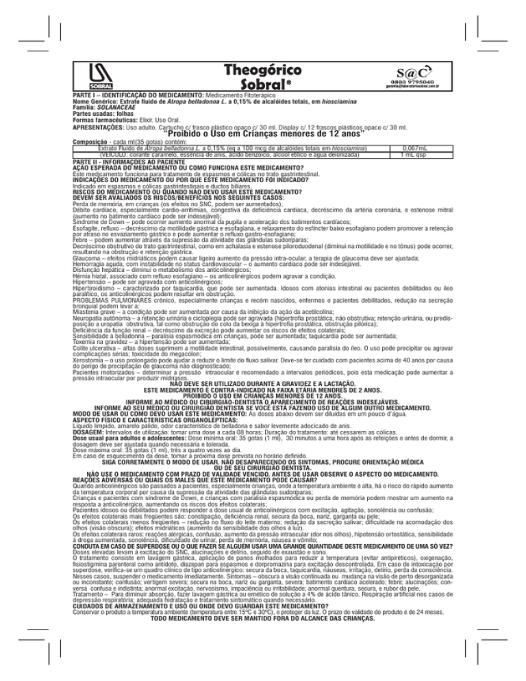 PARTE I – IDENTIFICAÇÃO DO MEDICAMENTO: Medicamento Fitoterápico Nome Genérico: Extrato fluido de Atropa belladonna L. a 0,15% de alcalóides totais, em hiosciamina Família: SOLANACEAE Partes usadas: folhas Formas farmacêuticas: Elixir. Uso Oral. APRESENTAÇÕES: Uso adulto. Cartucho c/ frasco plástico opaco c/ 30 ml. Display c/ 12 frascos plásticos opaco c/ 30 ml. “Proibido o Uso em Crianças menores de 12 anos” Composição - cada ml(35 gotas) contém: Extrato Fluido de Atropa belladonna L. a 0,15% (eq a 100 mcg de alcalóides totais em hiosciamina) 0,067mL (VEÍCULO: corante caramelo, essência de anis, ácido benzóico, álcool etílico e água deionizada) 1 mL qsp PARTE II - INFORMAÇÕES AO PACIENTE AÇÃO ESPERADA DO MEDICAMENTO OU COMO FUNCIONA ESTE MEDICAMENTO? Este medicamento funciona para tratamento de espasmos e cólicas no trato gastrintestinal. INDICAÇÕES DO MEDICAMENTO OU POR QUE ESTE MEDICAMENTO FOI INDICADO? Indicado em espasmos e cólicas gastrintestinais e ductos biliares. RISCOS DO MEDICAMENTO OU QUANDO NÃO DEVO USAR ESTE MEDICAMENTO? DEVEM SER AVALIADOS OS RISCOS/BENEFÍCIOS NOS SEGUINTES CASOS: Perda de memória, em crianças (os efeitos no SNC, podem ser aumentados); Débito cardíaco, especialmente cardio-arritimias, congestiva da deficiência cardíaca, decréscimo da artéria coronária, e estenose mitral (aumento no batimento cardíaco pode ser indesejável); Síndrome de Down – pode ocorrer aumento anormal da pupila e aceleração dos batimentos cardíacos; Esofagite, refluxo – decréscimo da motilidade gástrica e esofagiana, e relaxamento do esfíncter baixo esofagiano podem promover a retenção por atraso no esvaziamento gástrico e pode aumentar o refluxo gastro-esofagiano; Febre – podem aumentar através da supressão da atividade das glândulas sudoríparas; Decréscimo obstrutivo do trato gastrintestinal, como em achalasia e estenose piloroduodenal (diminui na motilidade e no tônus) pode ocorrer, resultando na obstrução e retenção gástrica. Glaucoma – efeitos midriáticos podem causar ligeiro aumento da pressão intra-ocular; a terapia de glaucoma deve ser ajustada; Hemorragia aguda, com instabilidade no status cardiovascular – o aumento cardíaco pode ser indesejável. Disfunção hepática – diminui o metabolismo dos anticolinérgicos; Hérnia hiatal, associado com refluxo esofagiano – os anticolinérgicos podem agravar a condição. Hipertensão – pode ser agravada com anticolinérgicos; Hipertiroidismo – caracterizado por taquicardia, que pode ser aumentada. Idosos com atonias intestinal ou pacientes debilitados ou íleo paralítico, os anticolinérgicos podem resultar em obstrução. PROBLEMAS PULMONARES crônico, especialmente crianças e recém nascidos, enfermos e pacientes debilitados, redução na secreção bronquial podem levar a: Miastenia grave – a condição pode ser aumentada por causa da inibição da ação da acetilcolina; Neuropatia autônoma – a retenção urinária e cicloplegia pode ser agravada (hipertrofia prostática, não obstrutiva; retenção urinária, ou predisposição a uropatia obstrutiva, tal como obstrução do colo da bexiga à hipertrofia prostática, obstrução pilórica); Deficiência da função renal – decréscimo da excreção pode aumentar os riscos de efeitos colaterais; Sensibilidade à belladonna – paralisia espasmódica em crianças, pode ser aumentada; taquicardia pode ser aumentada; Toxemia na gravidez – a hipertensão pode ser aumentada; Colite ulcerativa – altas doses suprimem a motilidade intestinal, possivelmente, causando paralisia do íleo. O uso pode precipitar ou agravar complicações sérias; toxicidade do megacólon; Xerostomia – o uso prolongado pode ajudar a reduzir o limite do fluxo salivar. Deve-se ter cuidado com pacientes acima de 40 anos por causa do perigo de precipitação de glaucoma não diagnosticado; Pacientes motorizados – determinar a pressão intraocular é recomendado a intervalos periódicos, pois esta medicação pode aumentar a pressão intraocular por produzir midríases. NÃO DEVE SER UTILIZADO DURANTE A GRAVIDEZ E A LACTAÇÃO. ESTE MEDICAMENTO É CONTRA-INDICADO NA FAIXA ETÁRIA MENORES DE 2 ANOS. PROIBIDO O USO EM CRIANÇAS MENORES DE 12 ANOS. INFORME AO MÉDICO OU CIRURGIÃO-DENTISTA O APARECIMENTO DE REAÇÕES INDESEJÁVEIS. INFORME AO SEU MÉDICO OU CIRURGIÃO DENTISTA SE VOCÊ ESTÁ FAZENDO USO DE ALGUM OUTRO MEDICAMENTO. MODO DE USAR OU COMO DEVO USAR ESTE MEDICAMENTO: As doses abaixo devem ser diluídas em um pouco d’água. ASPECTO FÍSICO E CARACTERÍSTICAS ORGANOLÉPTICAS: Líquido límpido, amarelo pálido, odor característico de belladona e sabor levemente adocicado de anis. DOSAGEM: Intervalos de utilização: tomar uma dose a cada 08 horas; Duração do tratamento: até cessarem as cólicas. Dose usual para adultos e adolescentes: Dose mínima oral: 35 gotas (1 ml), 30 minutos a uma hora após as refeições e antes de dormir, a dosagem deve ser ajustada quando necessária e tolerada. Dose máxima oral: 35 gotas (1 ml), três a quatro vezes ao dia. Em caso de esquecimento da dose, tomar a próxima dose prevista no horário definido. SIGA CORRETAMENTE O MODO DE USAR. NÃO DESAPARECENDO OS SINTOMAS, PROCURE ORIENTAÇÃO MÉDICA OU DE SEU CIRURGIÃO DENTISTA. NÃO USE O MEDICAMENTO COM PRAZO DE VALIDADE VENCIDO. ANTES DE USAR OBSERVE O ASPECTO DO MEDICAMENTO. REAÇÕES ADVERSAS OU QUAIS OS MALES QUE ESTE MEDICAMENTO PODE CAUSAR? Quando anticolinérgicos são passados a pacientes, especialmente crianças, onde a temperatura ambiente é alta, há o risco do rápido aumento da temperatura corporal por causa da supressão da atividade das glândulas sudoríparas; Crianças e pacientes com síndrome de Down, e crianças com paralisia espasmódica ou perda de memória podem mostrar um aumento na resposta a anticolinérgico, aumentando os riscos dos efeitos colaterais; Pacientes idosos ou debilitados pode