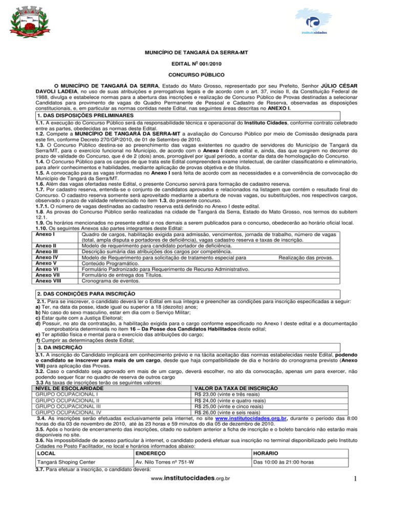 MUNICÍPIO DE TANGARÁ DA SERRA-MT EDITAL No 001/2010 CONCURSO PÚBLICO O MUNICÍPIO DE TANGARÁ DA SERRA, Estado do Mato Grosso, representado por seu Prefeito, Senhor JÚLIO CÉSAR DAVOLI LADEIA, no uso de suas atribuições e prerrogativas legais e de acordo com o art. 37, inciso II, da Constituição Federal de 1988, divulga e estabelece normas para a abertura das inscrições e realização de Concurso Público de Provas destinadas a selecionar Candidatos para provimento de vagas do Quadro Permanente de Pessoal e Cadastro de Reserva, observadas as disposições constitucionais, e, em particular as normas contidas neste Edital, nas seguintes áreas descritas no ANEXO I. 1. DAS DISPOSIÇÕES PRELIMINARES 1.1. A execução do Concurso Público será da responsabilidade técnica e operacional do Instituto Cidades, conforme contrato celebrado entre as partes, obedecidas as normas deste Edital. 1.2. Compete a MUNICÍPIO DE TANGARÁ DA SERRA-MT a avaliação do Concurso Público por meio de Comissão designada para este fim, conforme Decreto 270/GP/2010, de 01 de Setembro de 2010. 1.3. O Concurso Público destina-se ao preenchimento das vagas existentes no quadro de servidores do Município de Tangará da Serra/MT, para o exercício funcional no Município, de acordo com o Anexo I deste edital e, ainda, das que surgirem no decorrer do prazo de validade do Concurso, que é de 2 (dois) anos, prorrogável por igual período, a contar da data de homologação do Concurso. 1.4. O Concurso Público para os cargos de que trata este Edital compreenderá exame intelectual, de caráter classificatório e eliminatório, para aferir conhecimentos e habilidades, mediante aplicação de provas objetiva e de títulos. 1.5. A convocação para as vagas informadas no Anexo I será feita de acordo com as necessidades e a conveniência de convocação do Município de Tangará da Serra/MT. 1.6. Além das vagas ofertadas neste Edital, o presente Concurso servirá para formação de cadastro reserva. 1.7. Por cadastro reserva, entenda-se o conjunto de candidatos aprovados e relacionados na listagem que contém o resultado final do Concurso. O cadastro reserva somente será aproveitado mediante a abertura de novas vagas, ou substituições, nos respectivos cargos, observado o prazo de validade referenciado no item 1.3, do presente concurso. 1.7.1. O número de vagas destinadas ao cadastro reserva está definido no Anexo I deste edital. 1.8. As provas do Concurso Público serão realizadas na cidade de Tangará da Serra, Estado do Mato Grosso, nos termos do subitem 12.1. 1.9. Os horários mencionados no presente edital e nos demais a serem publicados para o concurso, obedecerão ao horário oficial local. 1.10. Os seguintes Anexos são partes integrantes deste Edital: Anexo I Quadro de cargos, habilitação exigida para admissão, vencimentos, jornada de trabalho, número de vagas (total, ampla disputa e portadores de deficiência), vagas cadastro reserva e taxas de inscrição. Anexo II Modelo de requerimento para candidato portador de deficiência. Anexo III Descrição sumária das atribuições dos cargos por competência. Anexo IV Modelo de Requerimento para solicitação de tratamento especial para Realização das provas. Anexo V Conteúdo Programático. Anexo VI Formulário Padronizado para Requerimento de Recurso Administrativo. Anexo VII Formulário de entrega dos Títulos. Anexo VIII Cronograma de eventos. 2. DAS CONDIÇÕES PARA INSCRIÇÃO 2.1. Para se inscrever, o candidato deverá ler o Edital em sua íntegra e preencher as condições para inscrição especificadas a seguir: a) Ter, na data da posse, idade igual ou superior a 18 (dezoito) anos; b) No caso do sexo masculino, estar em dia com o Serviço Militar; c) Estar quite com a Justiça Eleitoral; d) Possuir, no ato da contratação, a habilitação exigida para o cargo conforme especificado no Anexo I deste edital e a documentação comprobatória determinada no item 16 – Da Posse dos Candidatos Habilitados deste edital; e) Ter aptidão física e mental para o exercício das atribuições do cargo; f) Cumprir as determinações deste Edital; 3. DA INSCRIÇÃO 3.1. A inscrição do Candidato implicará em conhecimento prévio e na tácita aceitação das normas estabelecidas neste Edital, podendo o candidato se inscrever para mais de um cargo, desde que haja compatibilidade de dia e horário do cronograma previsto (Anexo VIII) para aplicação das Provas. 3.2. Caso o candidato seja aprovado em mais de um cargo, deverá escolher, no ato da convocação, apenas um para exercer, não podendo sequer ficar no quadro de reserva de outros cargo 3.3 As taxas de inscrições terão os seguintes valores: NÍVEL DE ESCOLARIDADE VALOR DA TAXA DE INSCRIÇÃO GRUPO OCUPACIONAL I R$ 23,00 (vinte e três reais) GRUPO OCUPACIONAL II R$ 24,00 (vinte e quatro reais) GRUPO OCUPACIONAL III R$ 25,00 (vinte e cinco reais) GRUPO OCUPACIONAL IV R$ 26,00 (vinte e seis reais) 3.4. As inscrições serão efetuadas exclusivamente pela internet, no site www.institutocidades.org.br, durante o período das 8:00 horas do dia 03 de novembro de 2010, até às 23 horas e 59 minutos do dia 05 de dezembro de 2010. 3.5. Após o horário de encerramento das inscrições, citado no subitem anterior a ficha de inscrição e o boleto bancário não estarão mais disponíveis no site. 3.6. Na impossibilidade de acesso particular à internet, o candidato poderá efetuar sua inscrição no terminal disponibilizado pelo Instituto Cidades no Posto Facilitador, no local e horários informados abaixo: LOCAL ENDEREÇO HORÁRIO Tangará Shoping Center Av. Nilo Torres nº 751-W 3.7. Para efetuar a inscrição, o candidato deverá: www.institutocidades.org.br Das 10:00 às 21:00 horas 1 a) Acessar o site www.institutocidades.org.br, durante o período de inscrição; b) Localizar no site o “link” correlato ao Concurso (Concurso Tangará da Serra); c) Ler atentamente o respectivo Edital e pre