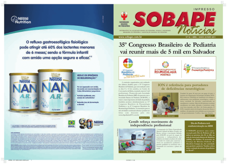 IMPRESSO INFORMATIVO DA SOCIEDADE BAIANA DE PEDIATRIA, FILIADA À SOCIEDADE BRASILEIRA DE PEDIATRIA E ASSOCIAÇÃO BAHIANA DE PEDIATRIA www.sobape.com.br Nº 56 | ABRIL | MAIO| JUNHO 2011 35º Congresso Brasileiro de Pediatria vai reunir mais de 5 mil em Salvador ION é referência para portadores de deficiências neurológicas Fundado há quase 44 anos por um grupo de pais, o Instituto de Organização Neurológica da Bahia (IONBA) tornou-se referência no tratamento de crianças e adolescentes com problemas neurológicos, sendo a única entidade de Salvador especializada no atendimento a autistas. Mais de 600 pacientes recebem atendimento em saúde, educação e assistência social, com hora marcada, sem filas e de forma gratuita. O ION é mantido através de doações de pessoas físicas e jurídicas e de parcerias com entidades governamentais e não-governamentais. Confira e faça suas doações. Foto: ION/Divulgação A comissão organizadora está cuidando dos últimos detalhes para o 35º Congresso Brasileiro de Pediatria, que será realizado entre os dias 8 e 12 de outubro, no Centro de Convenções da Bahia, reunindo mais de 5 mil profissionais. Promovida pela Sociedade Brasileira de Pediatria (SBP) em parceria com a Sociedade Baiana de Pediatria (SOBAPE), a maior e mais importante atividade da pediatria brasileira acontece simultaneamente ao 13º Congresso Brasileiro de Pneumologia Pediátrica e ao 8º Congresso Brasileiro de Reumatologia Pediátrica. As inscrições para as três atividades continuam abertas e podem ser feitas com desconto pelo site: www.cbpediatria2011.com.br. Páginas 4 e 5 Atendimento em fisioterapia Cemib reforça movimento de independência profissional Foto: Max Haack JORNAL 2011 ABRIL MAIO JUNHO.pmd 1 Dia do Pediatra terá confraternização na ABM A inauguração da Clínica Especializada Materno Infantil da Bahia (Cemib), em Brotas, reforça o movimento liderado pela SOBAPE em prol do resgate da autonomia e independência dos pediatras em relação aos planos de saúde. A Cemib foi criada para aumentar a oferta do atendimento pediátrico e garantir qualidade na assistência sem o intermédio de convênios e planos de saúde. Recepção da Cemib, em Brotas 21/07/2011, 11:42 Página 3 Página 6 A SOBAPE promove uma comemoração pelo Dia do Pediatra (27 de julho) no próximo dia 29, às 20h, na sede da Associação Baiana de Medicina (ABM), em Ondina. O secretário da Criança do Distrito Federal, dr. Dioclécio Campos Jr., foi convidado para proferir a palestra “Análise crítica sobre a redução do número de pediatras no Brasil”. 7 1ª Vice-presidente: Délia Cerviño Peleteiro 2ª Vice-presidente: Nadya Fernanda Modesto Habib (Vitória da Conquista) Secretária Geral: Maria de Lourdes Santiago Costa Leite 1º Secretário: José Carlos Junqueira Ayres Neto 2ª Secretária: Larissa Gaudenzi Lisboa de Oliveira 1ª Tesoureira: Kátia Machado Baptista Falcão 2º Tesoureiro: Gervásio Fernandes dos Santos (Feira de Santana) Diretora Científica: Helita Regina Freitas Cardoso de Azevedo Diretor de Defesa Profissional: Fernando Antonio Castro Barreiro Diretor de Patrimônio: Ivan Paulo Campos Guerra Diretora de Marketing e Eventos: Nilcéa de Moura Freire Comissão de Sindicância: Edazima Ferrari Bulhões Leuser Americano da Costa Hermila Tavares Villar Guedes Lara de Araújo Torreão Conselho Fiscal: Romilda Castro de Andrade Cairo Círia Santana e Sant’Anna Isa Menezes Lyra Órgão Informativo Oficial da Sociedade Baiana de Pediatria (SOBAPE) Edição: Ana Cristina Barreto | DRT/BA 1719 Tiragem: 1.500 exemplares Impressão: P&A Gráfica e Editora Ltda. O conteúdo dos artigos publicados neste informativo é de responsabilidade exclusiva dos autores. A Sociedade Baiana de Pediatria não se responsabiliza pelas opiniões emitidas em textos assinados. JORNAL 2011 ABRIL MAIO JUNHO.pmd 2 Junaura Barretto* ARTIGO Presidente: Hans Walter Ferreira Greve Dois assuntos merecem destaque especial nesta edição. O primeiro é a eleição de Núbia Mendonça e Luciana Silva para vice-presidente e mais nova acadêmica, respectivamente, da Academia Brasileira de Pediatria. Motivo de orgulho para a pediatria da Bahia, mostra também importância e prestígio em nível nacional principalmente quando somamos três representantes em um fórum de 30 pediatras oriundos dos 27 estados da federação. Ressaltamos que esta eleição nada mais fez senão justiça a duas defensoras de grandes causas relacionadas à infância brasileira, e que, ao longo de suas vidas, muito contribuíram para a formação das novas gerações de pediatras que hoje atuam nos mais variados rincões do nosso país. O segundo, como não poderia deixar de ser, refere-se ao 35º Congresso Brasileiro de Pediatria que este ano virá acompanhado dos congressos brasileiros de Pneumologia e Reumatologia Pediátrica. Desnecessário enfatizar a importância desses eventos para nossa cidade e também para o nosso estado, não só pela visibilidade que trazem, mas, sobretudo, pela qualidade dos palestrantes e temas que por eles serão discutidos. Será uma oportunidade ímpar para os pediatras baianos participarem de eventos de tão alto nível sem ter que se deslocarem, além, é claro, de poderem exercer a nossa tradicional hospitalidade perante os colegas de todo o Brasil. Portanto, em nome da SOBAPE, convoco a todos para participar e também incentivar a participação dos colegas nesses congressos que, com toda certeza, ficarão indelevelmente marcados na história da pediatria brasileira. Hans Greve Presidente Academia Brasileira conta com duas novas representantes baianas A Academia Brasileira de Pediatria (ABP) ganhou mais duas representantes baianas em maio. A oncologista pediátrica Núbia Mendonça foi eleita vice-presidente da ABP e a gastroenterologista pediátrica Luciana Silva tornou-se membro da academia, com 30 representantes no Brasil. O próximo fórum da ABP, quando haverá a posse do