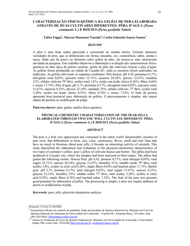 Revista Brasileira de Produtos Agroindustriais, Campina Grande, v.11, n.1, p.21-25, 2009 ISSN 1517-8595 CARACTERIZAÇÃO FÍSICO-QUÍMICA DA GELÉIA DE PERA ELABORADA ATRAVÉS DE DUAS CULTIVARES DIFERENTES: PÊRA D’ÁGUA (Pyrus communis L.) E HOUSUI (Pyrus pyrifolia Nakai) Talize Foppa1, Marcos Massanao Tsuzuki2, Carlos Eduardo Soares Santos3 RESUMO A pêra é uma fruta muito apreciada e consumida no mundo inteiro. Existem inúmeras variedades de pêra, que se diferenciam em forma, tamanho, cor, consistência, sabor, aroma e casca. Dado que há pouco na literatura sobre geléia de pêra, ela tornou-se uma interessante atividade de pesquisa. Este trabalho objetivou a elaboração e avaliação das características físicoquímicas de dois tipos de geléias caseiras: geléia de pêra das cultivares housui e pêra d’água. As geléias foram produzidas na cidade de Caçador-SC, onde as amostras foram analisadas em triplicatas. As geléias obtiveram os seguintes resultados: Pêra housui: pH 4,42; proteínas 0,17%; nitrogênio total 0,03%; açúcares totais 32,71%; sacarose 20,24%; glicose 12,47%; umidade 21%; sólidos solúveis 79º Brix; acidez total 3,8%; acidez em ácido cítrico 0,26%; fibras 0,64% e cinzas 17,75%. Pêra d’água: pH 3,75; proteínas 0,17%; nitrogênio total 0,03%; açúcares totais 31,67%; sacarose 8,53%; glicose 23,14%; umidade 23%; sólidos solúveis 77º Brix; acidez total 5,20%; acidez em ácido cítrico 0,35%; fibras 0,76% e cinzas 7,55%. O fruto da pereira apresenta bom potencial para elaboração de geléias. O processamento é simples, não requer adição de pectina ou acidificação da polpa. Palavras-chaves: pêra, geléia, analise físico-química. PHYSICAL-CHEMISTRY CHARACTERIZATION OF THE PEAR JELLY ELABORATED THROUGH TWO YOU WILL CULTIVATE DIFFERENT: PÊRA D’ÁGUA (Pyrus communis L.) E HOUSUI (Pyrus pyrifolia Nakai) ABSTRACT The pear is a fruit very appreciated and consumed in the entire world. Innumerable varieties of pear exist, that differentiate in form, size, color, consistency, flavor, smell and rind. Data that have no much in literature about pear jelly; it became an interesting activity of research. This study objectified the elaboration and evaluation of the physicist-chemistries characteristics of two types of caretaker’s jellies: pear’s jellies of cultivate housui and bartlet. The jellies had been produced in Caçador city, where the samples had been analyzed in third copies. The jellies had gotten the following results: Housui Pear: pH 4,42; proteins 0,17%; total nitrogen 0,03%; total sugars 32,71%; sucrose 20,24%; glucose 12,47%; humidity 21%; soluble solids 79º Brix; total acidity 3,8%; acidity in citric acid 0,26%; staple fibres 0,64% and leached ashes 17,75%. Bartlet pear: pH 3,75; proteins 0,17%; total nitrogen 0,03%; total sugars 31,67%; sucrose 8,53%; glucose 23,14%; humidity 23%; soluble solids 77º Brix; total acidity 5,20%; acidity in citric acid 0,35%; staple fibres 0,76% and leached ashes 7,55%. The fruit of the pear tree presents good potential for elaboration of jellies. The processing is simple; it does not require addition of pectin or acidification of pulp. Keywords: pear, jelly, physicist-chemistries analysis. _____________________ Protocolo 1125 de 22 /08/2008 1 Farmacêutica Mestre em controle de qualidade, titular da disciplina de Química Industrial de Alimentos do Curso de Química Industrial de Alimentos da Universidade do Contestado Caçador/SC; Amantino Burg, 110 centro, fone (49) 3563-6663, [email protected]; 2, 3 Alunos de Graduação do Curso de Química Industrial de Alimentos da Universidade do Contestado. Victor batista Adami, 800, centro fone: 35616200 [email protected], [email protected] 21 22 Caracterização físico-química da geléia de pêra elaborada através de duas cultivares diferentes:..... Foppa et al. INTRODUÇÃO Trabalhos científicos sobre nutrientes em alimentos foram bastante desenvolvidos entre as décadas de quarenta e cinqüenta e início dos anos sessenta Porém, após este período, esse tipo de pesquisa perdeu interesse no campo de investigação, cedendo lugar para as pesquisas na área de toxicologia. O resultado foi que nos últimos anos pouco se fez no Brasil para conhecer melhor nossos alimentos do ponto de vista nutricional. Recentemente, em virtude de novos conceitos científicos surgidos em nutrição e ciências dos alimentos, e do reconhecimento da importância do assunto, o interesse começou a renovar-se (Lajolo, 1995). Assim, a obtenção de dados referentes à composição de alimentos brasileiros tem sido estimulado com o objetivo de reunir informações atualizadas, confiáveis e adequadas à realidade nacional. Dados sobre composição de alimentos são importantes para inúmeras atividades: avaliar o suprimento e o consumo alimentar de um país, verificar a adequação nutricional da dieta de indivíduos e de populações, avaliar o estado nutricional, para desenvolver pesquisas sobre as relações entre dieta e doença, em planejamento agropecuário, na indústria de alimentos, além de outras (Holden, 1997). Apesar da importância evidente desta necessidade, pode-se dizer que não existem no Brasil informações ou tabelas completas e atualizadas sobre a composição em nutrientes e não nutrientes com ação fisiológica dos nossos alimentos. Dentre esses produtos destacam-se a geléia de pêra, com raríssimas referências. O Brasil é um dos três maiores produtores de frutas do mundo e consome grande quantidade das frutas que produz (Lago et al., 2006). Dentre a inúmera quantidade de variedades frutíferas produzidas no país, uma delas é a produção de pêra. O estado do Rio Grande do Sul é o principal produtor do país, juntamente com São Paulo, Santa Catarina, Paraná e Rio de Janeiro (Fioravanço, 2007). As pêras possuem algumas variedades naturais e outras desenvolvidas pelo homem, como por exemplo, a pêra housui, conhecida com pêra japones