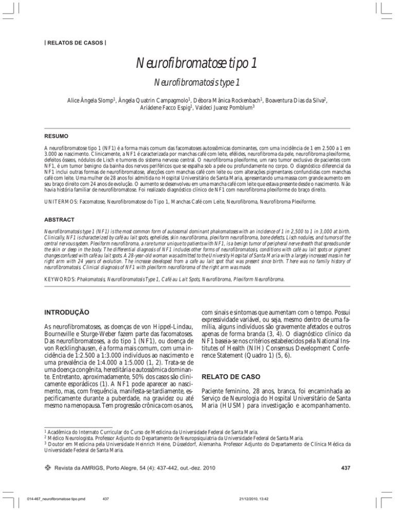 |NEUROFIBROMATOSE RELATOS DE CASOS |TIPO 1 Slomp et al. RELATOS DE CASOS Neurofibromatose tipo 1 Neurofibromatosis type 1 Alice Ângela Slomp1, Ângela Quatrin Campagmolo1, Débora Mânica Rockenbach1, Boaventura Dias da Silva2, Ariádene Facco Espig1, Valdeci Juarez Pomblum3 RESUMO A neurofibromatose tipo 1 (NF1) é a forma mais comum das facomatoses autossômicas dominantes, com uma incidência de 1 em 2.500 a 1 em 3.000 ao nascimento. Clinicamente, a NF1 é caracterizada por manchas café com leite, efélides, neurofibroma da pele, neurofibroma plexiforme, defeitos ósseos, nódulos de Lisch e tumores do sistema nervoso central. O neurofibroma plexiforme, um raro tumor exclusivo de pacientes com NF1, é um tumor benigno da bainha dos nervos periféricos que se espalha sob a pele ou profundamente no corpo. O diagnóstico diferencial da NF1 inclui outras formas de neurofibromatose, afecções com manchas café com leite ou com alterações pigmentares confundidas com manchas café com leite. Uma mulher de 28 anos foi admitida no Hospital Universitário de Santa Maria, apresentando uma massa com grande aumento em seu braço direito com 24 anos de evolução. O aumento se desenvolveu em uma mancha café com leite que estava presente desde o nascimento. Não havia história familiar de neurofibromatose. Foi realizado diagnóstico clínico de NF1 com neurofibroma plexiforme do braço direito. UNITERMOS: Facomatose, Neurofibromatose do Tipo 1, Manchas Café com Leite, Neurofibroma, Neurofibroma Plexiforme. ABSTRACT Neurofibromatosis type 1 (NF1) is the most common form of autosomal dominant phakomatoses with an incidence of 1 in 2,500 to 1 in 3,000 at birth. Clinically, NF1 is characterized by café au lait spots, ephelides, skin neurofibroma, plexiform neurofibroma, bone defects, Lisch nodules, and tumors of the central nervous system. Plexiform neurofibroma, a rare tumor unique to patients with NF1, is a benign tumor of peripheral nerve sheath that spreads under the skin or deep in the body. The differential diagnosis of NF1 includes other forms of neurofibromatosis, conditions with café au lait spots or pigment changes confused with café au lait spots. A 28-year-old woman was admitted to the University Hospital of Santa Maria with a largely increased mass in her right arm with 24 years of evolution. The increase developed from a cafe au lait spot that was present since birth. There was no family history of neurofibromatosis. Clinical diagnosis of NF1 with plexiform neurofibroma of the right arm was made. KEYWORDS: Phakomatosis, Neurofibromatosis Type 1, Café au Lait Spots, Neurofibroma, Plexiform Neurofibroma. INTRODUÇÃO As neurofibromatoses, as doenças de von Hippel-Lindau, Bourneville e Sturge-Weber fazem parte das facomatoses. Das neurofibromatoses, a do tipo 1 (NF1), ou doença de von Recklinghausen, é a forma mais comum, com uma incidência de 1:2.500 a 1:3.000 indivíduos ao nascimento e uma prevalência de 1:4.000 a 1:5.000 (1, 2). Trata-se de uma doença congênita, hereditária e autossômica dominante. Entretanto, aproximadamente, 50% dos casos são clinicamente esporádicos (1). A NF1 pode aparecer ao nascimento, mas, com frequência, manifesta-se tardiamente, especificamente durante a puberdade, na gravidez ou até mesmo na menopausa. Tem progressão crônica com os anos, com sinais e sintomas que aumentam com o tempo. Possui expressividade variável, ou seja, mesmo dentro de uma família, alguns indivíduos são gravemente afetados e outros apenas de forma branda (3, 4). O diagnóstico clínico da NF1 baseia-se nos critérios estabelecidos pela National Institutes of Health (NIH) Consensus Development Conference Statement (Quadro 1) (5, 6). RELATO DE CASO Paciente feminino, 28 anos, branca, foi encaminhada ao Serviço de Neurologia do Hospital Universitário de Santa Maria (HUSM) para investigação e acompanhamento. 1 Acadêmica do Internato Curricular do Curso de Medicina da Universidade Federal de Santa Maria. Médico Neurologista. Professor Adjunto do Departamento de Neuropsiquiatria da Universidade Federal de Santa Maria. 3 Doutor em Medicina pela Universidade Heinrich Heine, Düsseldorf, Alemanha. Professor Adjunto do Departamento de Clínica Médica da Universidade Federal de Santa Maria. 2 Revista da AMRIGS, Porto Alegre, 54 (4): 437-442, out.-dez. 2010 014-467_neurofibromatose tipo.pmd 437 437 21/12/2010, 13:42 NEUROFIBROMATOSE TIPO 1 Slomp et al. RELATOS DE CASOS QUADRO 1 – Critérios diagnósticos da neurofibromatose tipo 1 (NF1)* 1. Seis ou mais manchas café com leite a) > 5 mm em crianças ou b) > 15 mm em adultos 2. Dois ou mais neurofibromas cutâneos/subcutâneos ou um neurofibroma plexiforme 3. Efélides nas regiões axilares ou inguinais 4. Glioma óptico 5. Dois ou mais nódulos de Lisch (hamartomas da íris vistos ao exame com lâmpada de fenda) 6. Displasia óssea (displasia da asa do esfenoide ou afilamento dos ossos longos ± pseudoartrose) 7. Parente de primeiro grau com NF1 riores, costas, nádegas (Figura 1 e Figura 2), tumorações amolecidas em toda extensão do membro superior direito, de grandes proporções (Figura 3 e Figura 4), e tumorações em nádega esquerda e dorso. Apresenta nódulos menores que 5 mm principalmente em face e abdome e escoliose dorsal à direita. Na mensuração dos sinais vitais, sua frequência cardíaca era de 72/min, frequência respiratória de 16/min, temperatura axilar de 36,7oC e pressão arterial de 115/75 mmHg. Estatura de 1,51 m e peso de 58 kg. O exame neurológico, incluindo avaliação da sensibilidade, motricidade e coordenação, não revelou alterações. Exames oftalmológico com lâmpada de fenda e fundo de olho foram normais. * Dois ou mais dos critérios são necessários para a confirmação diagnóstica. Fonte: Ferner et al. J Med Genet 2007; 44:81-88. Nasceu com inúmeras manchas café com leite maiores que 5 mm espalhadas pelo corpo e pequeno aumento do diâmetro do membro superior direi