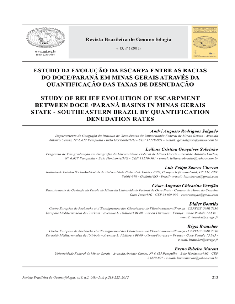 Revista Brasileira de Geomorfologia www.ugb.org.br v. 13, nº 2 (2012) ISSN 2236-5664 ESTUDO DA EVOLUÇÃO DA ESCARPA ENTRE AS BACIAS DO DOCE/PARANÁ EM MINAS GERAIS ATRAVÉS DA QUANTIFICAÇÃO DAS TAXAS DE DESNUDAÇÃO STUDY OF RELIEF EVOLUTION OF ESCARPMENT BETWEEN DOCE /PARANÁ BASINS IN MINAS GERAIS STATE - SOUTHEASTERN BRAZIL BY QUANTIFICATION DENUDATION RATES André Augusto Rodrigues Salgado Departamento de Geografia do Instituto de Geociências da Universidade Federal de Minas Gerais - Avenida Antônio Carlos, N° 6.627 Pampulha - Belo Horizonte/MG - CEP 31270-901 - e-mail: [email protected] Leilane Cristina Gonçalves Sobrinho Programa de Pós-graduação em Geografia da Universidade Federal de Minas Gerais - Avenida Antônio Carlos, N° 6.627 Pampulha - Belo Horizonte/MG - CEP 31270-901 - e-mal: [email protected] Luís Felipe Soares Cherem Instituto de Estudos Sócio-Ambientais da Universidade Federal de Goiás - IESA, Campus II (Samambaia), CP 131, CEP 74001-970 - Goiânia/GO - Brasil - e-mail: [email protected] César Augusto Chicarino Varajão Departamento de Geologia da Escola de Minas da Universidade Federal de Ouro Preto - Campus do Morro do Cruzeiro - Ouro Preto/MG - CEP 35400-000 - [email protected] Didier Bourlès Centre Européen de Recherche et d’Enseignement des Géosciences de l’Environnement/França - CEREGE UMR 7330 Europôle Méditerrennéen de l´Airbois – Avennue L. Phillibert BP80 - Aix-en-Provence – França - Code Postale 13.545 e-mail: [email protected] Régis Braucher Centre Européen de Recherche et d’Enseignement des Géosciences de l’Environnement/França - CEREGE UMR 7330 Europôle Méditerrennéen de l´Airbois – Avennue L. Phillibert BP80 - Aix-en-Provence – França - Code Postale 13.545 e-mail: [email protected] Breno Ribeiro Marent Universidade Federal de Minas Gerais - Avenida Antônio Carlos, N° 6.627 Pampulha - Belo Horizonte/MG - CEP 31270-901 - e-mail: [email protected] Revista Brasileira de Geomorfologia, v.13, n.2, (Abr-Jun) p.213-222, 2012 213 Salgado, A. A. R. et al Informações sobre o Artigo Data de Recebimento: 06/06/2011 Data de Aprovação: 25/05/2012 Palavras-chave: Recuo de escarpamento, evolução do relevo, isótopo cosmogênico 10 Be, captura fluvial. Keywords: Escarpment retreat, relief evolution, 10 Be cosmogenic nuclide, stream capture. Resumo Escarpamentos na forma de degraus do relevo e que limitam duas diferentes bacias hidrográficas são comuns no leste de Minas Gerais. O presente trabalho investigou a evolução do que delimita as bacias hidrográficas do rio Doce (porção leste e inferior da escarpa) com a bacia hidrográfica do rio Paraná (porção oeste e superior da escarpa) via mensuração das taxas quaternárias de desnudação através do isótopo cosmogênico 10Be. Os resultados obtidos demonstram que as taxas de desnudação mensuradas possuem íntima relação com a compartimentação do relevo, sendo baixas no planalto superior (bacia hidrográfica do rio Paraná), médias na porção deste planalto superior que foi capturado para a bacia hidrográfica do rio Doce e altas na escarpa. Permitem ainda compreender que o relevo regional evoluí através de um duplo front de regressão: o primeiro se caracteriza pelo recuo da escarpa e o segundo, localizado mais a oeste, pelas capturas fluviais. Neste contexto, comprova-se a retração do escarpamento para oeste, fato que faz com que a bacia hidrográfica do rio Doce ganhe área em detrimento da bacia hidrográfica do rio Paraná. Abstract Escarpments that presents form of steps in relief and that limit two different basins are common in eastern of Minas Gerais State in Brazil. This paper investigated the evolution of the escarpment that delimits the Doce catchments (the lower and the eastern portion of the escarpment) from the Paraná catchments (the higher and the western portion of the escarpment) by measurement of the quaternary denudation rates by 10Be cosmogenic nuclide. The results demonstrate that denudation rates measured are closely related to the relief: (i) lower rates in the upper plateau (Paraná catchments); (ii) middle rates on the upper plateau that was captured into the Doce catchments and; (iii) higher rates on the escarpment. It was also possible to understand that the regional relief evolved by double front: the first front is characterized by escarpment backwearing and the second, located further west, by the river captures and downwearing. In this context, it is proved the retraction of the escarpment into the west and, for consequence, the Rio Doce catchments is gaining area at the expense of the Paraná catchments. Introdução A margem passiva brasileira, especialmente na região sudeste, tem sua paisagem marcada por uma série de serras e conjuntos de elevações como, por exemplo, a Serra do Mar, a Serra da Mantiqueira e a Serra do Espinhaço Meridional (Valadão, 1998). Este fato faz com que a paisagem da porção leste do Brasil possua uma série de degraus no relevo, visto que muitas destas serras são na verdade escarpas que delimitam um planalto inferior – normalmente localizado a leste do escarpamento - de um planalto superior – a oeste. A gênese de muitos destes escarpamentos é relacionada com a tectônica (Almeida & Carneiro, 1998; Valadão, 1998; Riccomini et al., 2004; Saadi et al., 2005). Entretanto, alguns deles não parecem estar, diretamente, relacionados a esse processo, visto que mapeamentos geológicos não demarcam neles ou na regiões próximas, sistemas de falhas. Este é, parcialmente, o caso dos escarpamentos na forma de degrau no relevo que delimitam as bacias hidrográficas dos rios Doce, Paraíba do Sul, São 214 Francisco e Paraná no leste de Minas Gerais. Os mesmos podem ter sua gênese inicial relacionada a uma escarpa de falha e, neste caso, constituirem-se como escarpas de falha que graças a erosão recuaram de sua posição original. Entretanto, mesmo que seja esse o caso, as mesm