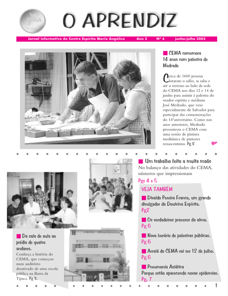 Jornal informativo do Centro Espírita Maria Angélica Ano 2 Nº 6 junho-julho 2003 ■ CEMA comemora 14 anos com palestra de Medrado C erca de 1600 pessoas lotaram o salão, as salas e até o terreno ao lado da sede do CEMA nos dias 12 e 14 de junho para assistir à palestra do orador espírita e médium José Medrado, que veio especialmente de Salvador para participar das comemorações do 14ºaniversário. Como nos anos anteriores, Medrado presenteou o CEMA com uma sessão de pintura mediúnica de pintores renascentistas. Pg 8 ■ Um trabalho feito a muita maõs No balanço das atividades do CEMA, números que impressionam Pgs 4 e 5 VEJA TAMBÉM ■ Divaldo Pereira Franco, um grande divulgador da Doutrina Espírita. Pg2 ■ Os verdadeiros prazeres da alma. Pg 6 ■ Da sala de aula ao prédio de quatro andares. Conheça a história do CEMA, que começou num auditório desativado de uma escola pública na Barra da Tijuca. Pg 3. ■ Novo horário de palestras públicas. Pg 6 ■ Arraiá do CEMA vai ser 12 de julho. Pg 6 ■ Pneumonia Asiática Porque estão aparecendo novas epidemias. Pg. 7 1 Personalidade do Mês EDITORIAL onhecido em todo Brasil como um dos maiores divulgadores da Doutrina Espírita da atualidade, Divaldo Pereira Franco nasceu em Feira de Santana , na Bahia, em 5 de maio de 1927. Orador espírita com mais de 8.500 conferências, Divaldo já se apresentou em mais de mil cidades e em 52 países. Desde jovem, Divaldo apresentou diversas faculdades mediúnicas de efeitos físicos e intelectuais. Espírita convicto, fundou o Centro Espírita Caminho da Redenção, em 7 de Setembro de 1947. Dois anos depois, iniciou a sua tarefa de psicografia. Várias mensagens foram escritas por seu intermédio, assinadas por diversos Espíritos, dentre eles, Joanna de Ângelis, que durante muito tempo apresentava-se como um Espírito Amigo, ocultandose no anonimato à espera do instante oportuno para se apresentar. Joanna revelou-se como sua orientadora espiritual e en 1964 selecionou várias mensagens de sua autoria e enfeixou-as no livro Messe de Amor, que se tornou o primeiro livro psicografado por Divaldo. Atualmente, Divaldo Franco conta com 175 obras publicadas, incluindo os biográficos que retratam sua vida e obra. Estante Espírita R J unho foi um mês de festa no CEMA, quando comemoramos 14 anos dedicados ao estudo do Espiritismo e ao trabalho no bem. Mais um integrante desta festa de luz, o nosso jornal O APRENDIZ está completando seu primeiro aniversário. Com a ajuda de prestimosos colaboradores encarnados e desencarnados, O APRENDIZ é mais um meio de divulgação da Doutrina Espírita. Aos nossos colaboradores, o nosso muito obrigado e o convite para que continuem a fazer parte de nossa equipe. Neste número, trazemos o retrospecto de nossa história ao longo destes quatorze anos. Olhando para o passado, recordamos as boas lembranças e contamos como tudo começou. O GEEIMA, um projeto que estava escrito nas estrelas, cresceu, amadureceu e se tornou o CEMA. Nossa Casa Espírita é o resultado de muitas lutas, que foram sendo vencidas graças ao trabalho valioso da nossa mentora Irmã Maria Angélica, incansável à frente da equipe espiritual que coordena o CEMA. Olhando para o presente, paramos para um balanço e surpreendemo-nos com os números já alcançados em nossas diversas atividades doutrinárias, mediúnicas e assistenciais, resultado da união de mais de 300 voluntários que foram chegando, somando esforços e multiplicando as possibilidades de expandirmos ainda mais as nossas frentes de trabalho. Olhando para o futuro, seguiremos confiantes, com a certeza de que a espiritualidade amiga nos conduzirá na ampliação de nossas atividades. Sabemos que ainda temos muito a realizar, mas, como um rio que segue sereno em direção ao mar, continuaremos firmes em nossa caminhada, com a certeza de que o Pai, que nunca nos abandona, também espera que abracemos a nossa missão na seara do Cristo. Divaldo Pereira Franco C Autor espiritual: Emmanuel Psicografia: Francisco Cândido Xavier FEB omance apontado por Chico Xavier como um dos mais belos e emocionantes livros por ele psicografados. Mostra a grandeza de Paulo de Tarso, figura de alto prestígio na sociedade judaica da época de Jesus e perseguidor dos cristãos que se converteu ao Cristianismo após receber o chamado de Jesus no caminho de Damasco. O livro recorda, com riqueza de detalhes, as lutas e testemunhos de Paulo no seu apostolado de divulgação do Cristianismo. CAMPANHA DO COBERTOR O frio chegou e com ele a oportuni-dade de sermos solidários com os nossos irmãos moradores de rua. Colabore conosco doando cobertores, meias, agasalhos, que também serão distribuídos às famílias assistidas. Mais do que a sua contribuição, o seu calor humano é o que conta. Escute uma rádio de boa qualidade: RÁDIO ESPÍRITA RIO DE JANEIRO A EMISSORA DA FRATERNIDADE - 1400 AM Veja a programação da rádio no site: http://www.radioriodejaneiro.am.br/ EXPEDIENTE O jornal O APRENDIZ é uma publicação bimestral do CEMA - Centro Espírita Maria Angélica Rua Odilon Duarte Braga, nº 240 - Recreio dos Bandeirantes Rio de Janeiro - CEP 22.790-220 - CNPJ - 35.799.030/00001-94 Telefone: (21) 2437-5947 - Este jornal foi impresso gratuitamente. Distribuição interna 3.000 exemplares - Jornalista responsável: Gustavo Poli - DRT/RJ: 9019198 2 ESTAVA ESCRITO NAS ESTRELAS... A história de um sonho que começou num pequeno auditório abandonado de uma escola pública e se transformou no CEMA P arece que foi ontem que... ... com o apoio da direção da Escola Municipal República da Colômbia, no Condomínio Riviera dei Fiori, um pequeno grupo de professoras, coordenado por Vera Marsillac, iniciou o estudo do Evangelho Segundo o Espiritismo. Foi assim que começou um trabalho que cresceu e se No alto à esquerda, foto da primeira reunião do GEEIMA. Acima a atual diretoria do multiplicou rapidamente, com a chegada de voluntário