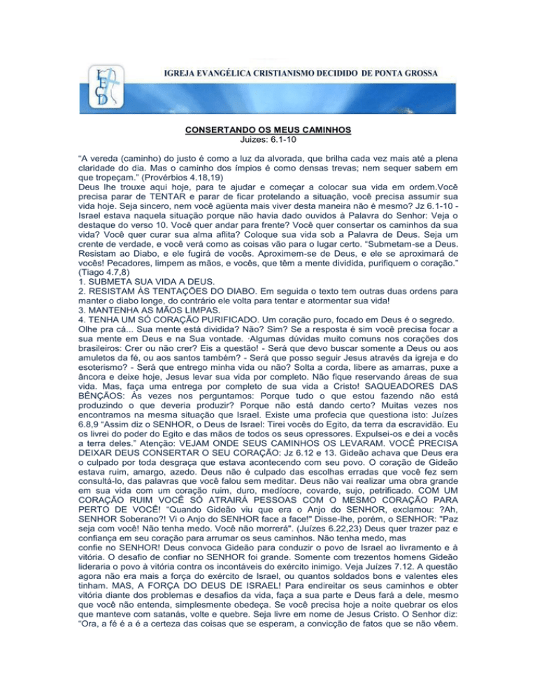 CONSERTANDO OS MEUS CAMINHOS Juizes: 6.1-10 “A vereda (caminho) do justo é como a luz da alvorada, que brilha cada vez mais até a plena claridade do dia. Mas o caminho dos ímpios é como densas trevas; nem sequer sabem em que tropeçam.” (Provérbios 4.18,19) Deus lhe trouxe aqui hoje, para te ajudar e começar a colocar sua vida em ordem.Você precisa parar de TENTAR e parar de ficar protelando a situação, você precisa assumir sua vida hoje. Seja sincero, nem você agüenta mais viver desta maneira não é mesmo? Jz 6.1-10 Israel estava naquela situação porque não havia dado ouvidos à Palavra do Senhor: Veja o destaque do verso 10. Você quer andar para frente? Você quer consertar os caminhos da sua vida? Você quer curar sua alma aflita? Coloque sua vida sob a Palavra de Deus. Seja um crente de verdade, e você verá como as coisas vão para o lugar certo. “Submetam-se a Deus. Resistam ao Diabo, e ele fugirá de vocês. Aproximem-se de Deus, e ele se aproximará de vocês! Pecadores, limpem as mãos, e vocês, que têm a mente dividida, purifiquem o coração.” (Tiago 4.7,8) 1. SUBMETA SUA VIDA A DEUS. 2. RESISTAM ÀS TENTAÇÕES DO DIABO. Em seguida o texto tem outras duas ordens para manter o diabo longe, do contrário ele volta para tentar e atormentar sua vida! 3. MANTENHA AS MÃOS LIMPAS. 4. TENHA UM SÓ CORAÇÃO PURIFICADO. Um coração puro, focado em Deus é o segredo. Olhe pra cá... Sua mente está dividida? Não? Sim? Se a resposta é sim você precisa focar a sua mente em Deus e na Sua vontade. ·Algumas dúvidas muito comuns nos corações dos brasileiros: Crer ou não crer? Eis a questão! - Será que devo buscar somente a Deus ou aos amuletos da fé, ou aos santos também? - Será que posso seguir Jesus através da igreja e do esoterismo? - Será que entrego minha vida ou não? Solta a corda, libere as amarras, puxe a âncora e deixe hoje, Jesus levar sua vida por completo. Não fique reservando áreas de sua vida. Mas, faça uma entrega por completo de sua vida a Cristo! SAQUEADORES DAS BÊNÇÃOS: Às vezes nos perguntamos: Porque tudo o que estou fazendo não está produzindo o que deveria produzir? Porque não está dando certo? Muitas vezes nos encontramos na mesma situação que Israel. Existe uma profecia que questiona isto: Juízes 6.8,9 “Assim diz o SENHOR, o Deus de Israel: Tirei vocês do Egito, da terra da escravidão. Eu os livrei do poder do Egito e das mãos de todos os seus opressores. Expulsei-os e dei a vocês a terra deles.” Atenção: VEJAM ONDE SEUS CAMINHOS OS LEVARAM. VOCÊ PRECISA DEIXAR DEUS CONSERTAR O SEU CORAÇÃO: Jz 6.12 e 13. Gideão achava que Deus era o culpado por toda desgraça que estava acontecendo com seu povo. O coração de Gideão estava ruim, amargo, azedo. Deus não é culpado das escolhas erradas que você fez sem consultá-lo, das palavras que você falou sem meditar. Deus não vai realizar uma obra grande em sua vida com um coração ruim, duro, medíocre, covarde, sujo, petrificado. COM UM CORAÇÃO RUIM VOCÊ SÓ ATRAIRÁ PESSOAS COM O MESMO CORAÇÃO PARA PERTO DE VOCÊ! “Quando Gideão viu que era o Anjo do SENHOR, exclamou: ?Ah, SENHOR Soberano?! Vi o Anjo do SENHOR face a face!" Disse-lhe, porém, o SENHOR: "Paz seja com você! Não tenha medo. Você não morrerá". (Juízes 6.22,23) Deus quer trazer paz e confiança em seu coração para arrumar os seus caminhos. Não tenha medo, mas confie no SENHOR! Deus convoca Gideão para conduzir o povo de Israel ao livramento e à vitória. O desafio de confiar no SENHOR foi grande. Somente com trezentos homens Gideão lideraria o povo à vitória contra os incontáveis do exército inimigo. Veja Juízes 7.12. A questão agora não era mais a força do exército de Israel, ou quantos soldados bons e valentes eles tinham. MAS, A FORÇA DO DEUS DE ISRAEL! Para endireitar os seus caminhos e obter vitória diante dos problemas e desafios da vida, faça a sua parte e Deus fará a dele, mesmo que você não entenda, simplesmente obedeça. Se você precisa hoje a noite quebrar os elos que manteve com satanás, volte e quebre. Seja livre em nome de Jesus Cristo. O Senhor diz: “Ora, a fé é a é a certeza das coisas que se esperam, a convicção de fatos que se não vêem. De fato, sem fé é impossível agradar a Deus, porquanto é necessário que aquele que se aproxima de Deus creia que ele existe e que se torna galardoador dos que o buscam." (Hebreus 11.1,6) Amigo(a), nesta história Gideão consertou sua vida, endireitou seu caminho e venceu com Deus! Você deseja ser um fracassado ou um medroso? Você precisa agora decidir confiar toda a sua vida a Jesus Cristo, entregando todo o seu ser a Ele. Você deseja ser soldado de Cristo ou Cavalo do Inimigo? De que lado você está? Hoje sua vida pode dar uma virada de 180º. Graus!!! Sabe qual é a chave para começar a mudança? Sl 34.18-19. “O senhor está perto dos que tem coração quebrantado e salva os de espírito abatido. O justo passa por muitas adversidades, mas o SENHOR o livra de todas;” Decida hoje endireitar os seus caminhos colocando sua vida totalmente nas mãos do Senhor Jesus Cristo. Confie somente a Jesus o perdão de seus pecados e a sua salvação. Reconheça a necessidade de mudança, de entrega total a Cristo, pois só assim terás um novo recomeço em sua vida. Somente com um viver debaixo da Palavra de Deus, em submissão e obediência a Ele, teremos forças para resistir ás tentações do Diabo, da nossa carne e deste mundo perdido, e vencer os problemas e desafios que se levantam contra nós dia a dia. Amém! De seu pastor e amigo Reinaldo Figueiredo Leareno.