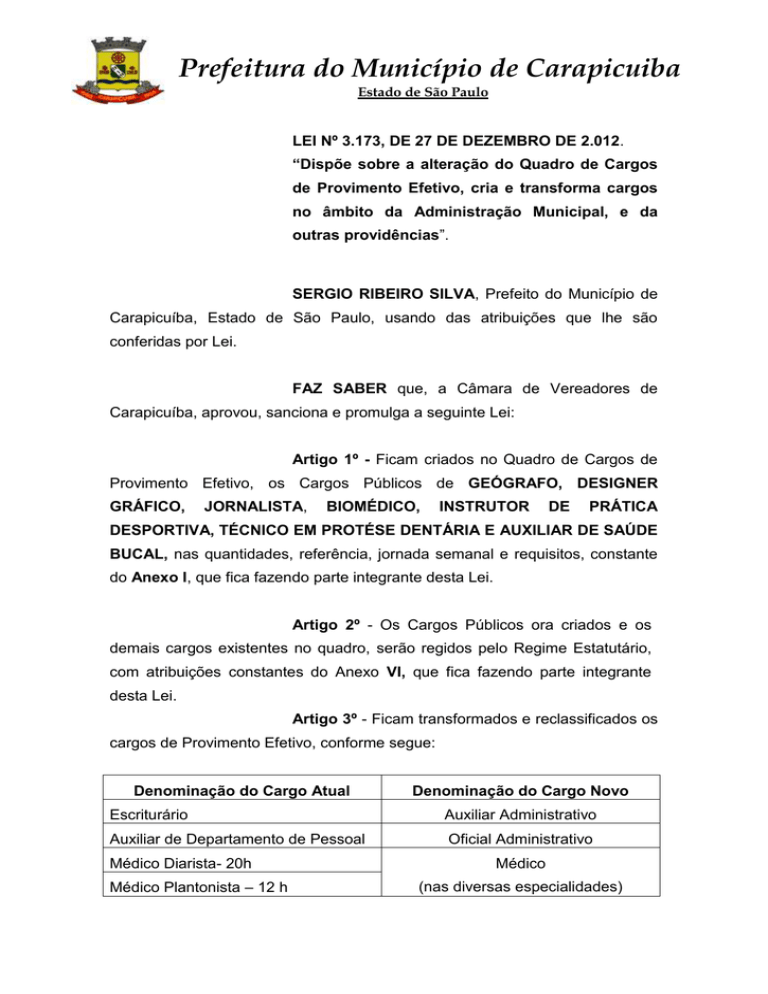 Prefeitura do Município de Carapicuiba Estado de São Paulo LEI Nº 3.173, DE 27 DE DEZEMBRO DE 2.012. “Dispõe sobre a alteração do Quadro de Cargos de Provimento Efetivo, cria e transforma cargos no âmbito da Administração Municipal, e da outras providências”. SERGIO RIBEIRO SILVA, Prefeito do Município de Carapicuíba, Estado de São Paulo, usando das atribuições que lhe são conferidas por Lei. FAZ SABER que, a Câmara de Vereadores de Carapicuíba, aprovou, sanciona e promulga a seguinte Lei: Artigo 1º - Ficam criados no Quadro de Cargos de Provimento Efetivo, os Cargos Públicos de GEÓGRAFO, DESIGNER GRÁFICO, JORNALISTA, BIOMÉDICO, INSTRUTOR DE PRÁTICA DESPORTIVA, TÉCNICO EM PROTÉSE DENTÁRIA E AUXILIAR DE SAÚDE BUCAL, nas quantidades, referência, jornada semanal e requisitos, constante do Anexo I, que fica fazendo parte integrante desta Lei. Artigo 2º - Os Cargos Públicos ora criados e os demais cargos existentes no quadro, serão regidos pelo Regime Estatutário, com atribuições constantes do Anexo VI, que fica fazendo parte integrante desta Lei. Artigo 3º - Ficam transformados e reclassificados os cargos de Provimento Efetivo, conforme segue: Denominação do Cargo Atual Denominação do Cargo Novo Escriturário Auxiliar Administrativo Auxiliar de Departamento de Pessoal Oficial Administrativo Médico Diarista- 20h Médico Plantonista – 12 h Médico (nas diversas especialidades) Prefeitura do Município de Carapicuiba Estado de São Paulo § 1º - A jornada de trabalho referente ao Cargo de Médico ficará alterada de mensalista para “horista”, conforme valor e referência estabelecida na Tabela de Vencimento, constante no Anexo IV, desta Lei. § 2º - A jornada mensal de trabalho do Cargo de Médico na função de Plantonista será de no mínimo de 12 horas semanais ou de 24 horas quinzenalmente, em escala montada em conformidade com as necessidades da unidade onde está lotado. § 3º - O valor correspondente a hora trabalhada do Médico, na função Plantonista, nos plantões médicos realizados aos sábados, domingos e feriados, será acrescido de 75% (sessenta por cento), sendo estabelecido no máximo 2 (dois) Plantões por mês. § 4º - Em decorrência das transformações e reclassificações a que se refere o caput deste artigo, os ocupantes dos cargos transformados e reclassificados, serão enquadrados, mediante apostilas de seus títulos de nomeação. Artigo 4º - Aos servidores admitidos no Cargo de Auxiliar de Consultório Odontológico, que se encontra no Quadro Suplementar Extinto na vacância, terão direito a optar por assumir o Cargo de Auxiliar de Saúde Bucal, desde que preencham os requisitos exigidos pela Lei Estadual nº 11.889/24 de Dezembro de 2008, que regulamenta a profissão, tendo em vista a peculiaridade das atividades. Artigo 5º. Ficam alterados os valores de Gratificação de Assiduidade, constantes do anexo V da Lei 2.969 de 29 de dezembro de 2.009, criadas para atender única e exclusivamente os Cargos de Médico e Dentista, constante do Anexo V desta Lei. Prefeitura do Município de Carapicuiba Estado de São Paulo Artigo 6º - Fica criado junto ao Quadro Permanente de Cargos do Magistério Municipal, o cargo de AUXILIAR DE DESENVOLVIMENTO DA EDUCAÇÃO BÁSICA (ADEB), nas quantidades, referência de vencimento e jornada de trabalho, constante do Anexo II, desta Lei. Parágrafo único - As atribuições e requisitos do cargo ora criado encontram-se descritos no Anexo VII, desta Lei. Artigo 7º - Ficam alteradas as quantidades de vagas descritas no Anexo III da Lei 3.116/2011, conforme segue: Função Gratificada Quantidade Atual Quantidade Nova Assistente Pedagógico 12 15 Vice-Diretor de Escola 60 80 Coordenador 60 80 Pedagógico Artigo 8º - O Quadro de Referências e Vencimento dos Cargos de Provimento Efetivo da Administração Municipal passa a ser o constante do Anexo III, desta Lei. Artigo 9º - Fica criada a Função de Confiança de livre nomeação e exoneração do Executivo, exercida, exclusivamente por servidores ocupantes de Cargos de Provimento Efetivo da Prefeitura Municipal de Carapicuíba. Artigo 10 - A Função de Confiança são vantagens acessórias ao vencimento do Servidor e não constituem emprego, é atribuída pelo exercício de Direção, Chefia e Assessoramento, cujo desempenho não justifique respectivamente a criação de cargo em comissão. Prefeitura do Município de Carapicuiba Estado de São Paulo Artigo 11 - Fica o Poder Executivo autorizado a conceder ao servidor que vier a desempenhar a Função de Confiança, na forma do artigo anterior, um acréscimo salarial de até 100% (cem por cento) incidente sobre o respectivo padrão salarial. Parágrafo único- O pagamento de acréscimo salarial decorrente do exercício de Função de Confiança será realizado, em parcela destacada, não incorporável, sobre a qual não incidirão quaisquer direitos ou vantagens, excetuando-se pagamento de Férias e 13º Salário, respeitando sua proporcionalidade no exercício da Função. Artigo 12 - O servidor não poderá exercer, simultaneamente, mais de uma Função de Confiança bem como receber cumulativamente vantagens pecuniárias da mesma natureza ou cargo em comissão. Artigo 13 - Extinto qualquer órgão da estrutura, automaticamente extinguir-se-ão os cargos de Função de Confiança, correspondente à Direção, Chefia e Assessoramento. Artigo 14 - Os cargos públicos vagos existentes no Quadro de Cargos da Prefeitura de Carapicuíba e que não sejam de interesse da Administração antes da data da vigência desta Lei ficarão automaticamente extintos. Artigo 15 - As despesas decorrentes da implantação desta Lei correrão á conta de dotação orçamentária vigente, suplementada se necessário. Artigo 16 - São partes integrantes da presente Lei os Anexos de I a VII que a acompanham. Prefeitura do Município de Carapicuiba Estado de São Paulo Artigo 17 - Esta Lei entra em vig