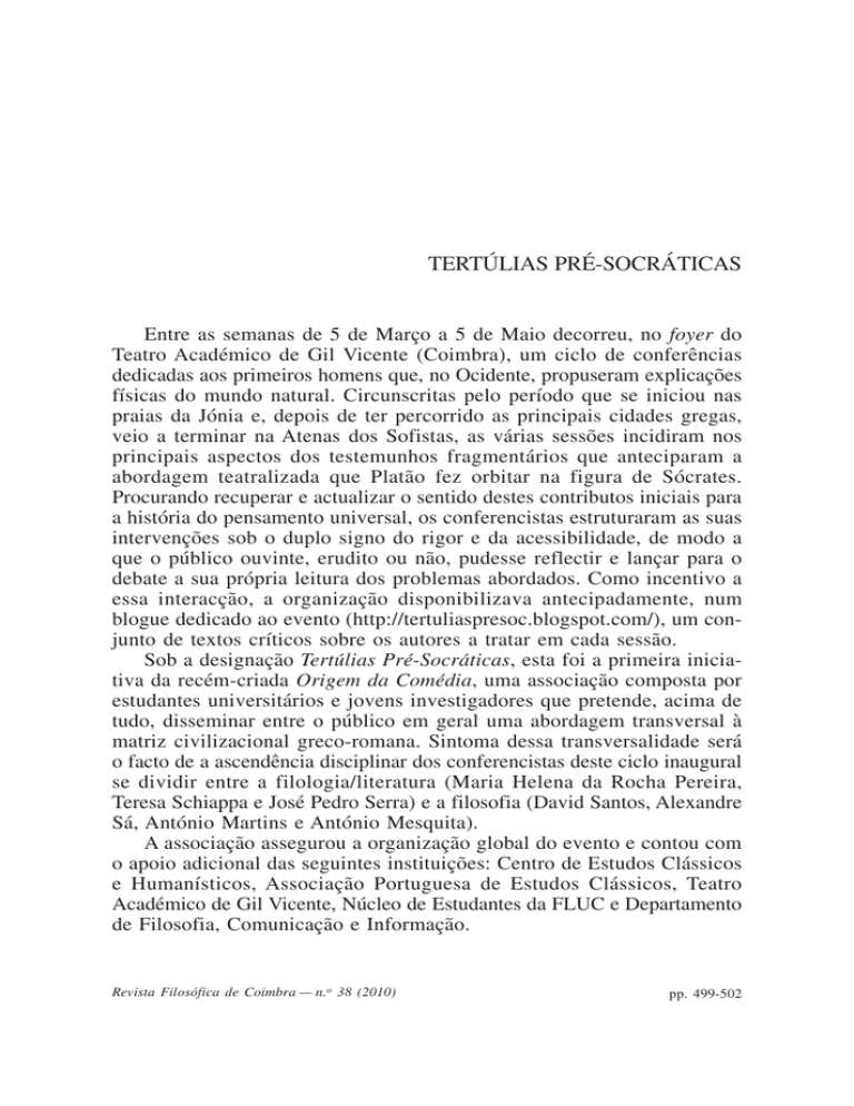 Notícias 499 TERTÚLIAS PRÉ-SOCRÁTICAS Entre as semanas de 5 de Março a 5 de Maio decorreu, no foyer do Teatro Académico de Gil Vicente (Coimbra), um ciclo de conferências dedicadas aos primeiros homens que, no Ocidente, propuseram explicações físicas do mundo natural. Circunscritas pelo período que se iniciou nas praias da Jónia e, depois de ter percorrido as principais cidades gregas, veio a terminar na Atenas dos Sofistas, as várias sessões incidiram nos principais aspectos dos testemunhos fragmentários que anteciparam a abordagem teatralizada que Platão fez orbitar na figura de Sócrates. Procurando recuperar e actualizar o sentido destes contributos iniciais para a história do pensamento universal, os conferencistas estruturaram as suas intervenções sob o duplo signo do rigor e da acessibilidade, de modo a que o público ouvinte, erudito ou não, pudesse reflectir e lançar para o debate a sua própria leitura dos problemas abordados. Como incentivo a essa interacção, a organização disponibilizava antecipadamente, num blogue dedicado ao evento (http://tertuliaspresoc.blogspot.com/), um conjunto de textos críticos sobre os autores a tratar em cada sessão. Sob a designação Tertúlias Pré-Socráticas, esta foi a primeira iniciativa da recém-criada Origem da Comédia, uma associação composta por estudantes universitários e jovens investigadores que pretende, acima de tudo, disseminar entre o público em geral uma abordagem transversal à matriz civilizacional greco-romana. Sintoma dessa transversalidade será o facto de a ascendência disciplinar dos conferencistas deste ciclo inaugural se dividir entre a filologia/literatura (Maria Helena da Rocha Pereira, Teresa Schiappa e José Pedro Serra) e a filosofia (David Santos, Alexandre Sá, António Martins e António Mesquita). A associação assegurou a organização global do evento e contou com o apoio adicional das seguintes instituições: Centro de Estudos Clássicos e Humanísticos, Associação Portuguesa de Estudos Clássicos, Teatro Académico de Gil Vicente, Núcleo de Estudantes da FLUC e Departamento de Filosofia, Comunicação e Informação. Revista Filosófica de Coimbra — n.o 38 (2010) pp. 499-502 500 Rodolfo Lopes Neste sentido de projectar o saber consolidado e fundamentado para fora do círculo académico, tornando-o acessível a todos quantos partilhem do mínimo interesse por estas questões, cada uma das sessões contou com uma intervenção inicial de um especialista convidado, a cuja conferência se seguiu um período de discussão. Na maior parte dos casos, esteve também incluído um momento artístico tematicamente relacionado com o assunto a tratar, garantindo-se assim um toque de actualidade e versatilidade estética a cada um dos tópicos milenares em debate. Pensando também na sua perenidade e difusão mais ampla, a organização foi recolhendo o registo audiovisual das conferências e momentos artísticos para deles fazer memória e também com a intenção de os disponibilizar num canal de vídeo online acessível através do blogue da associação (http:// origemdacomedia.blogspot.com/) – um espaço dedicado ao Mundo Antigo diariamente actualizado. No que respeita às sessões, a sua estruturação global deveu-se essencialmente a um critério cronológico. Assim, a inaugural (5 de Março), vocacionada para uma contextualização geral, foi protagonizada por Maria Helena da Rocha Pereira que abordou as principais questões histórico-culturais da época em que floresceram os autores em análise. A preceder a conferência, teve lugar a antestreia do recital “Pintar com Vinho as Setas do Amor” a cargo do grupo Thíasos da FLUC. Passando aos filósofos “pré-socráticos” propriamente ditos, o percurso iniciou-se na Jónia com o trio Tales, Anaximandro e Anaxímenes, apresentado por David Santos e previamente introduzido por uma declamação de alguns excertos do Fausto de Goethe pela Oficina de Poesia – nomeadamente do episódio da Noite de Walpurgis Clássica, em que também “participam” Tales e Anaximandro. De Mileto para Éfeso, a terceira sessão (17 de Março), centrada na figura de Heraclito, iniciou-se com a leitura de um conto de Gonçalo M. Tavares à qual se seguiu a conferência de Alexandre Sá sobre aquela figura tutelar da filosofia ocidental. Na semana seguinte (24 de Março), a pluralidade deu lugar à unidade do monismo eleático representado por Parménides e Zenão e explicado por António Martins – a preceder a conferência houve lugar à declamação dos fragmentos conhecidos por Poema de Parménides. A quinta sessão (14 de Abril), a mais ambiciosa em termos temáticos, começou com a encenação de A Morte de Empédocles pelo TEUC, à qual se seguiu uma visão conjunta e sistemática das doutrinas de Empédocles, Anaxágoras e Demócrito (representando os atomistas), apresentada por António Mesquita. Na penúltima etapa (28 de Abril), as atenções centraram-se na misteriosa figura de Pitágoras, e respectivos seguidores, cujo pensamento foi sintetizado por José Pedro Serra. O percurso terminou na ágora de Atenas com a intervenção de Teresa Schiappa sobre os Sofistas, pp. 499-502 Revista Filosófica de Coimbra — n.o 38 (2010) Notícias 501 acompanhada da leitura performativa de alguns fragmentos destes autores pelo grupo Aranhiças & Elefantes. Em virtude de ter conseguido transportar para o espaço público uma forma de cultura alicerçada no saber académico, promovendo um ambiente de debate descomprometido e transversal, por ter apostado numa visão interdisciplinar e actual de um assunto desta natureza, a iniciativa foi bastante pertinente e proveitosa. Resta apenas felicitar a associação organizadora do evento, que, apesar de jovem, conseguiu uma boa prestação. Rodolfo Lopes Revista Filosófica de Coimbra — n.o 38 (2010) pp. 499-502