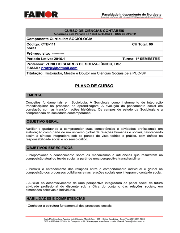 Faculdade Independente do Nordeste Credenciada pela Portaria MEC 1.393, de 04/07/2001 publicada no D.O.U. de 09/07/2001. CURSO DE CIÊNCIAS CONTÁBEIS Autorizado pela Portaria no 1.393 de 04/07/01 – DOU de 09/07/01 Componente Curricular: SOCIOLOGIA Código: CTB-111 horas CH Total: 60 Pré-requisito: ---------Período Letivo: 2016.1 Turma: 1º SEMESTRE Professor: ZENILDO SOARES DE SOUZA JÚNIOR, DSc. E-MAIL: [email protected] Titulação: Historiador, Mestre e Doutor em Ciências Sociais pela PUC-SP PLANO DE CURSO EMENTA Conceitos fundamentais em Sociologia. A Sociologia como instrumento de integração transdisciplinar no processo de aprendizagem. A evolução do pensamento social em correlação com as transformações históricas. Os campos de estudo da Sociologia e a compreensão da sociedade contemporânea. OBJETIVO GERAL Auxiliar o graduando a compreender suas competências e atividades profissionais em elaboração como parte de um universo global de relações humanas e sociais, favorecendo assim a síntese integradora sob os pontos de vista teórico e prático, com ênfase na responsabilidade social e no senso crítico. OBJETIVOS ESPECÍFICOS - Proporcionar o conhecimento sobre os mecanismos e influências que resultaram na composição atual do tecido social, a partir de uma perspectiva transdisciplinar; - Permitir o entendimento das relações entre o comportamento individual e grupal na composição dos processos cotidianos e nas relações sociais que integram o contexto social; - Auxiliar no desenvolvimento de uma perspectiva integradora do papel social da futura atividade profissional do discente sob a ótica do conjunto das relações sociais, em dimensões coletivas e individuais. HABILIDADES E COMPETÊNCIAS - Conhecer a estrutura fundamental dos processos sociais; Sede/Mantenedora: Avenida Luiz Eduardo Magalhães, 1305 – Bairro Candeias – Fone/Fax: (77) 3161-1000 CEP: 45028-440 / Vitória da Conquista – BA / Homepage: www.fainor.com.br E-mail: [email protected] Faculdade Independente do Nordeste Credenciada pela Portaria MEC 1.393, de 04/07/2001 publicada no D.O.U. de 09/07/2001. - Entender os mecanismos básicos de formação das relações sociais; - Apreender o significado de práticas, costumes e regras de organização da sociedade, em suas diversas acepções; - Possibilitar a análise básica de processos, discursos e relações de poder; - Compreender a imbricação entre poder, saber e subjetivação; - Perceber os indícios elementares indicativos do processo de transformação social. CONTEÚDO PROGRAMÁTICO UNIDADE I - Conceitos introdutórios à Sociologia; - A evolução do pensamento científico – estatutos de “Verdade”; - As duas revoluções e a revolução científica - O pensamento sobre a sociedade – Saint-Simon e Comte UNIDADE II - Sociedade e transformação social – perspectiva do consenso e perspectiva do conflito - O surgimento da Sociologia Científica - Durkheim - O industrialismo e os conflitos de classes – Marx e marxismos - O anti-cientificismo e a crítica ao historicismo - A sociologia compreensiva de Max Weber UNIDADE III - As guerras mundiais e a crise do saber científico; - Sociologia contemporânea; - O construtivismo sociológico: Foucault, Elias, Giddens, Baumann; - A globalização – processos e mudanças; - Aspectos sociológicos da vida contemporânea: comportamento, consumo, tribos urbanas, normas sociais. METODOLOGIA Aulas expositivas, trabalhos em grupo e individuais, análise de filmes e obras literárias, dinâmicas de grupo. AVALIAÇÃO Testes de conhecimento individual e grupal; pesquisa em fontes referenciais; debates em sala. Sede/Mantenedora: Avenida Luiz Eduardo Magalhães, 1305 – Bairro Candeias – Fone/Fax: (77) 3161-1000 CEP: 45028-440 / Vitória da Conquista – BA / Homepage: www.fainor.com.br E-mail: [email protected] Faculdade Independente do Nordeste Credenciada pela Portaria MEC 1.393, de 04/07/2001 publicada no D.O.U. de 09/07/2001. RECURSOS Quadro branco e pincéis; Data-show; DVD e vídeo. BIBLIOGRAFIA BÁSICA - LAKATOS, Eva Maria e MARCONI, Marina de A. – Sociologia Geral. Ed. Atlas, 1999. - VILA NOVA, Sebastião – Introdução à Sociologia. Ed. Atlas, 2000 - OLIVEIRA, Pérsio Santos de – Introdução à Sociologia. Atica, 2007 - FERREIRA, Delson – Manual de Sociologia: dos Clássicos à Sociedade da Informação. Atlas, 2001 - QUINTANEIRO, Tânia, BARBOSA, M. L. de O., OLIVEIRA, Márcia G. M. – Um toque de clássicos: Marx, Durkheim, Weber. Editora UFMG, 2003 - GIDDENS, Anthony – Sociologia (6ª Edição). Revisado e atualizado juntamente com Phillip W. Sutton. Penso Editora Ltda. Porto Alegre, 2012. BIBLIOGRAFIA COMPLEMENTAR - Baumann, Zygmunt e MAY, Tim – Aprendendo a pensar com a Sociologia. Zahar, RJ, 2010 - SENNETT, Richard – A cultura do novo Capitalismo. Record, SP, 2006 - ________________A corrosão do caráter: conseqüências pessoais do trabalho no novo Capitalismo. Record, SP, 2005 - ARRIGHI, Giovanni – O longo Século XX. Editora UNESP/Contraponto. SP, 2006 - ELIAS, Norbert – O Processo Civlizador (Vol. 2) – Jorge Zahar Editor, RJ, 1993 - ______________ A Sociedade dos Indivíduos – Jorge Zahar Editor, RJ, 1994 - ______________ Os estabelecidos e os Outsiders (com John L. Scotson) - Jorge Zahar Editor, RJ, 2000 - BOURDIEU, Pierre – A economia das trocas simbólicas. Perspectiva, SP, 2005 _________________ A distinção. Crítica social do julgamento. ZOUK/EDUSP, RS/SP, 2006 - ARENDT, Hannah – A promessa da política. Bertrand Brasil/DIFEL, RJ, 2008 - GIDDENS, Anthony – Política, Sociologia e Teoria Social. Editora UNESP, SP, 1998 Sede/Mantenedora: Avenida Luiz Eduardo Magalhães, 1305 – Bairro Candeias – Fone/Fax: (77) 3161-1000 CEP: 45028-440 / Vitória da Conquista – BA / Homepage: www.fainor.com.br E-mail: [email protected] Faculdade Independente do Nordeste Credenciada pela Portaria MEC 1.393, de 04/07/2001 publicada no D.O.U.