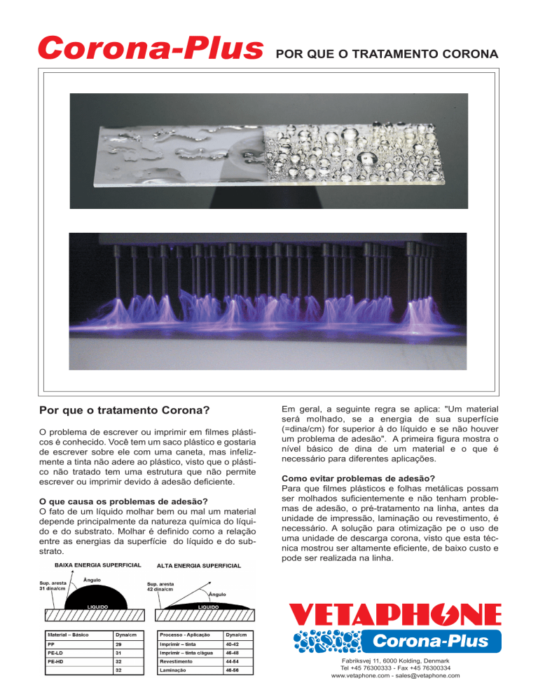 Corona-Plus Por que o tratamento Corona? O problema de escrever ou imprimir em filmes plásticos é conhecido. Você tem um saco plástico e gostaria de escrever sobre ele com uma caneta, mas infelizmente a tinta não adere ao plástico, visto que o plástico não tratado tem uma estrutura que não permite escrever ou imprimir devido à adesão deficiente. O que causa os problemas de adesão? O fato de um líquido molhar bem ou mal um material depende principalmente da natureza química do líquido e do substrato. Molhar é definido como a relação entre as energias da superfície do líquido e do substrato. POR QUE O TRATAMENTO CORONA Em geral, a seguinte regra se aplica: "Um material será molhado, se a energia de sua superfície (=dina/cm) for superior à do líquido e se não houver um problema de adesão". A primeira figura mostra o nível básico de dina de um material e o que é necessário para diferentes aplicações. Como evitar problemas de adesão? Para que filmes plásticos e folhas metálicas possam ser molhados suficientemente e não tenham problemas de adesão, o pré-tratamento na linha, antes da unidade de impressão, laminação ou revestimento, é necessário. A solução para otimização pe o uso de uma unidade de descarga corona, visto que esta técnica mostrou ser altamente eficiente, de baixo custo e pode ser realizada na linha. Fabriksvej 11, 6000 Kolding, Denmark Tel +45 76300333 - Fax +45 76300334 www.vetaphone.com - [email protected] Corona-Plus O que é o tratamento Corona Resumindo, Corona é uma descarga elétrica de alta freqüência direcionada a uma superfície. O resultado é uma melhoria da conexão química (dina/cm) entre as moléculas no plástico e o meio/líquido aplicado. Este tratamento superficial não reduz nem modifica a resistência e aparência do material. Durabilidade Com o tempo o nível de dina obtido cairá e pode ser necessário submeter o material novamente ao tratamento corona antes de seu uso. O nível de dina cairá mais rápido se o material contiver agentes de deslizamento. Estoques de file mais espesso e mais velho são mais difíceis de tratar, visto que os agentes de deslizamento podem ter migrado para a superfície. O tratamento posterior de material que não tiver sido tratado sob extrusão pode ser difícil. Assim, recomendamos o uso de filme pré-tratado, que só requer uma reconstituição corona. Determinação do nível de tratamento A eficácia do tratamento corona depende do material utilizado. Não existem limites para os materiais que podem receber o tratamento corona, mas o nível de tratamento/intensidade (watt/min/m2) pode variar muito. O nível de tratamento depende do material utilizado, nível necessário de dina/cm, velocidade da máquina e número de lados que devem ser tratados. Em relação ao material, deve-se considerar o seguinte: a idade e largura do material e se o material foi pré-tratado. O nível de tratamento pode ser calculado usando a seguinte fórmula: Potência (watt) = T * S * W * M Manutenção Para obter o nível desejado de dina, é importante que o isolador seja mantido limpo. A última inovação importante para otimizar o e set-up de eletrodos e a manutenção pe o sistema de Troca Rápida (QC). O eletrodo Corona completo é montado em um cartucho de inserção/extração especialmente projetado. O operador pode realizar a manutenção diária facilmente, sem a remoção do material de tratamento. A possibilidade de se manter a manutenção em um nível mínimo é comprovadamente muito popular. M P = Potência Total (Watt) necessária T = Número de lados a tratar (único/dois) S = Velocidade da Linha (em metros/minuto) W = Largura do filme (em metros) M = Fator material (Watt necessário por m² por minuto) O valor exato pode ser melhor determinado testando uma amostra do filme real, usado em uma aplicação específica. Regulagem automática de potência A unidade de tratamento Corona Plus da Vetaphone é equipada com regulagem automática de potência. Quando o nível necessário de tratamento (watt/min/m²) for determinado, a unidade é ajustada e devido à regulagem automática de potência, o file é influenciado pela mesma energia, independente da velocidade ou largura do filme. A estação da unidade de tratamento Corona-Plus também se destaca pela vantagem de se trabalhar em ambientes muito úmidos e extremos. Gerador Os geradores Corona-Plus da Vetaphone, com uma faixa de potência que varia de 1 a 80 kW são equipados com um sistema único de ressonância que garante o gerador mais eficiente do mercado. Fabriksvej 11, 6000 Kolding, Denmark Tel +45 76300333 - Fax +45 76300334 www.vetaphone.com - [email protected]