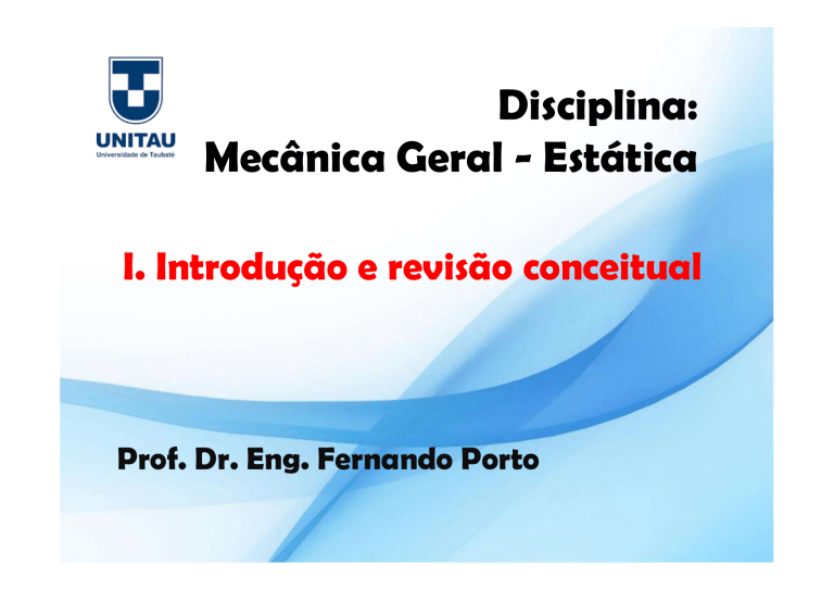 Disciplina: Mecânica Geral - Estática I. Introdução e revisão conceitual Prof. Dr. Eng. Fernando Porto 1. Conceitos gerais • Pode ser definida como a ciência que descreve e prevê as condições de repouso ou movimento dos corpos sob a ação de forças. • Divide-se em 3 partes: mecânica dos corpos rígidos (estática e dinâmica), mecânica dos corpos deformáveis e mecânica dos fluidos. 1. Conceitos gerais Aristóteles 384-322 A.C. Jean d'Alembert 1717-1783 Arquimedes 287-212 A.C. Joseph-Louis Lagrange 1733-1813 Issac Newton 1642-1727 William Hamilton 1805-1865 2. Conceitos Básicos • Conceitos básicos: espaço, tempo, massa e força. • Espaço está associado à noção de posição, definida por 3 dimensões em relação à uma referência (coordenadas). • Tempo deve ser informado para a caracterização de eventos (mudança de posição, p.ex.). • Massa é associada à comparação entre corpos. • Força, representa a ação de um corpo sobre outro. • Newton: Espaço, tempo e massa são conceitos absolutos e independentes entre si. 2. Conceitos Básicos • O estudo da mecânica elementar repousa em 6 princípios fundamentais: • A lei do paralelograma para adição de forças. • O princípio da transmissibilidade. • 3 leis fundamentais de Newton: • Primeira lei: força resultante nula -> repouso ou velocidade constante. 2. Conceitos Básicos • Segunda lei: força resultante não nula -> movimento acelerado, direção da aplicação da resultante F=m.a • Terceira lei: ação e reação entre corpos em contato tem a mesma intensidade, mesma linha de ação e sentidos opostos. • Lei de Newton da gravitação: duas partículas de massa M e m são mutuamente atraídas com forças iguais e opostas. 2. Conceitos Básicos • Sistema Internacional de Unidades (unidades SI). • Unidades cinéticas: comprimento (metro, m); tempo (segundo, s); massa (kilograma, kg) e força (newton, N). • Unidades básicas: comprimento, tempo e massa. • Unidade derivada: força. Prefixos do SI ** O uso destes prefixos deve ser evitado, exceto para medição de áreas e volumes e para o uso não técnico do centímetro (corpo e roupas, p.ex.) 2. Conceitos Básicos • A precisão da solução de um problema depende de 2 itens: a precisão dos dados e precisão dos cálculos efetuados. • A solução não pode ser mais precisa que o menos preciso destes dois itens. • Em problemas de engenharia, os dados raramente são conhecidos com precisão maior que 0,2%. 2. Conceitos Básicos • Regra prática: • 40 N -> 4,00 x 101 N -> 40,0 N • 15 N -> 1,500 x 101 N -> 15,00 N 3. Momento de uma Força • Momento de uma força em relação a um ponto é o produto vetorial entre o raio vetor posição e a força, onde o raio vetor posição tem origem no ponto referência para o cálculo, e extremidade em qualquer ponto sobre a linha de ação da força. Linha de ação da Vetor força P aplicado sobre um sólido, no ponto F. força é sobreposta à linha FC No caso, o ponto de referência é o ponto A. Assim, o vetor posição tem sua origem neste ponto. O vetor posição tem origem em A e extremidade em F (origem do vetor força P. Relembrando: Produto Vetorial Intensidade Vetores P e Q no mesmo plano V=P´Q Q q P Direção e sentido • A linha de ação de V é perpendicular ao plano que contém P e Q. • A direção e sentido de V são obtidos pela regra da mão direita. Feche a mão direita e posicione-a de modo que seus dedos se curvem no mesmo sentido da rotação em q que leva o vetor P a ficar alinhado com o vetor Q: seu polegar irá indicar a direção e sentido do vetor V. A B a A B a • Sabe-se que a intensidade do vetor momento será M = F . R . sena A b a2 C B a • • • • • Seja um triângulo retângulo disposto simultaneamente sobre a linha de ação do vetor F e do vetor R (linha AB). a + a 2 = 180° (I) a 2 + b + 90° = 180° (soma dos ângulos internos do triângulo) (II) Substituindo (I) em (II): (180° - a) + b + 90° = 180° Chega-se em: b + 90° = a (III) A b C B a a = b + 90° • Da trigonometria: sen(a+b) = sen(a).cos(b) + cos(a).sen(b) • Então: sen(a) = sen(b+90°) = senb.cos90° + cosb.sen90° (III) A b C B a sen(a) = sen(b+90°) = senb.cos90° + cosb.sen90° sen(a) = 0 + cos(b) sen(a) = cos(b) cos 90° = 0 sen 90° = 1 A d b B Intensidade do vetor momento: M = F . R . sena M = F . R . cosb C a • • Entretanto, verifica-se que R . cosb tem o mesmo valor que a menor distância (d) entre o ponto A (origem do vetor R) e a linha de ação do vetor F. Deste modo, a intensidade do vetor momento fica: M=F.d A direção da distância d é perpendicular à linha de ação da força F 4. Binário • É uma maneira utilizada na ciência mecânica para definir momento através de duas forças com as seguintes características: • • • • Paralelas Não colineares Opostas Mesma intensidade (iguais em módulo) • intensidade do binário: M=F.d · d · SM = F . d/2 + F . d/2 SM = F . d Bibliografia BEER, FERDINAND P.; JOHNSTON, E. RUSSELL; EISENBERG, ELLIOT R. Mecânica Vetorial Para Engenheiros - Estática Editora: MCGRAW HILL – BOOKMAN; 2010 ISBN: 8580550467