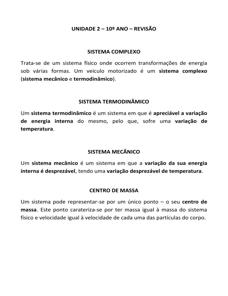 UNIDADE 2 – 10º ANO – REVISÃO SISTEMA COMPLEXO Trata-se de um sistema físico onde ocorrem transformações de energia sob várias formas. Um veículo motorizado é um sistema complexo (sistema mecânico e termodinâmico). SISTEMA TERMODINÂMICO Um sistema termodinâmico é um sistema em que é apreciável a variação de energia interna do mesmo, pelo que, sofre uma variação de temperatura. SISTEMA MECÂNICO Um sistema mecânico é um sistema em que a variação da sua energia interna é desprezável, tendo uma variação desprezável de temperatura. CENTRO DE MASSA Um sistema pode representar-se por um único ponto – o seu centro de massa. Este ponto carateriza-se por ter massa igual à massa do sistema físico e velocidade igual à velocidade de cada uma das partículas do corpo. TRABALHO REALIZADO POR FORÇAS CONSTANTES O trabalho realizado por uma força constante é dado pela expressão: W Fd cos W – trabalho realizado pela força F . F – intensidade da força F . d – módulo do vetor deslocamento d . α – ângulo entre os vetores d e F . Este trabalho pode ser positivo, negativo ou nulo, de acordo com as seguintes situações: Se α < 900, o trabalho é positivo (trabalho potente). Se α > 900, o trabalho é negativo (trabalho resistente). Se α = 900, o trabalho é nulo (força perpendicular ao deslocamento). Exercício Sobre um corpo de massa 0,5 kg, inicialmente em repouso, atuam as F F forças 1 e 2 , de intensidades 30 N e 20 N, respetivamente, fazendo com que o corpo se desloque 50 m. A intensidade da força de atrito existente entre as superfícies em contacto é de 5,0 N. F2 600 F1 300 Sentido do deslocamento a) Calcule o trabalho realizado pela força F1 . b) Calcule o trabalho realizado pela força F2 . c) Calcule o trabalho realizado pela força de atrito. d) Calcule o trabalho realizado pela força peso. e) Classifique em potente, resistente ou nulo, o trabalho realizado por cada uma das forças ( F1 , F2 , força de atrito e peso). FORÇA EFICAZ A expressão: W Fd cos Pode apresentar-se na forma: W Fef d Sendo: Fef F cos Fef representa a intensidade da força eficaz. A força eficaz, Fef , indica a componente da força, F , segundo a direção do deslocamento. EXERCÍCIO A figura representa uma esfera de massa 25 kg, a descer um plano inclinado de comprimento 20 m que faz um ângulo de 30 o com a horizontal. 300 a) Calcule a intensidade da componente eficaz do peso. b) Calcule o trabalho realizado pelo peso durante a descida da esfera no plano. POTÊNCIA DE UMA FORÇA A potência de uma força que realiza o trabalho W num intervalo de tempo Δt é dada por: P W t LEI DO TRABALHO-ENERGIA OU TEOREMA DE ENERGIA CINÉTICA A soma dos trabalhos realizados por todas as forças que atuam num corpo é igual à variação da energia cinética do corpo. Wtotal Ec Como a soma dos trabalhos realizados por todas as forças é igual ao trabalho da força resultante: Wtotal WFres Conclui-se: WFres Ec Exercício Num folheto promocional está indicado que um automóvel, de massa 800 kg, vai dos zero aos 100 km/h em 10,8 s. a) Qual o trabalho útil realizado. b) Determine a potência média útil nesse arranque. FORÇAS CONSERVATIVAS E FORÇAS NÃO CONSERVATIVAS O trabalho realizado por uma força conservativa entre quaisquer dois pontos é sempre o mesmo, independentemente da trajetória seguida. O trabalho realizado por uma força não conservativa entre quaisquer duas posições depende da trajetória seguida. Se considerarmos, como exemplo, o lançamento vertical de uma bola, entre os pontos A e C, existem duas trajetórias possíveis. O trabalho realizado pelo peso da bola em ambas as trajetórias é igual, por o trabalho entre C e D (negativo) é simétrico do trabalho entre D e C (positivo). Assim, o peso é uma força conservativa. O trabalho realizado pela força de resistência do ar é diferente nas duas trajetórias, porque é sempre resistente (negativo). Assim, a força de resistência do ar é uma força não conservativa. CONSERVAÇÃO DA ENERGIA MECÂNICA A energia mecânica de um sistema é igual à soma das suas energias cinética e potencial: Em Ec E p Quando num corpo apenas atuam apenas forças conservativas (fc) o trabalho dessas forças é simétrico da variação da energia potencial: W fc E p Atendendo à Lei do trabalho energia, este trabalho também é igual à variação de energia cinética: W fc Ec Destas duas expressões conclui-se: Ec E p Ec E p 0 ( Ec E p ) 0 Em 0 Em constante Quando atuam apenas forças conservativas num sistema, a energia mecânica conserva-se (sistema conservativo). Exercício A figura ao lado representa uma montanha russa dum parque de diversões, onde desliza um carro com pessoas de massa total 200 kg. Considere o atrito desprezável e g = 10 m/s2. Sabendo que o carro passa em A com uma velocidade de valor 10 m/s, calcule: a) A energia mecânica no ponto A. b) O valor da velocidade do corpo em B. c) A energia cinética em C. d) A altura do ponto D, sabendo que o carro lá passa com um valor de velocidade de 2,0 m/s. e) O trabalho da força gravítica desde B até D. FORÇAS NÃO CONSERVATIVAS E VARIAÇÃO DE ENERGIA MECÂNICA Aplicando a Lei do Trabalho-Energia a um sistema onde atuam forças conservativas (fc) e forças não conservativas (fnc), obtém-se: W fc W fnc Ec Por outro lado: W fc E p Substituindo: E p W fnc Ec W fnc E p Ec W fnc ( E p Ec ) W fnc Em Quando atuam forças não conservativas num sistema, a energia mecânica varia (sistema não conservativo). EXERCÍCIO Um corpo de peso 200 N desce, com velocidade constante, o plano inclinado de comprimento 2,5 m, representado na figura, onde o atrito não é desprezável. 300 Determine: a) O trabalho realizado pelo peso do corpo durante a descida. b) A variação de energia mecânica. c) A intensidade da força de atrito entre as superfícies de contacto. RENDIMENTO EM SISTEMAS MECÂNICOS Embora a energia total do Universo se mantenha constante, não é po