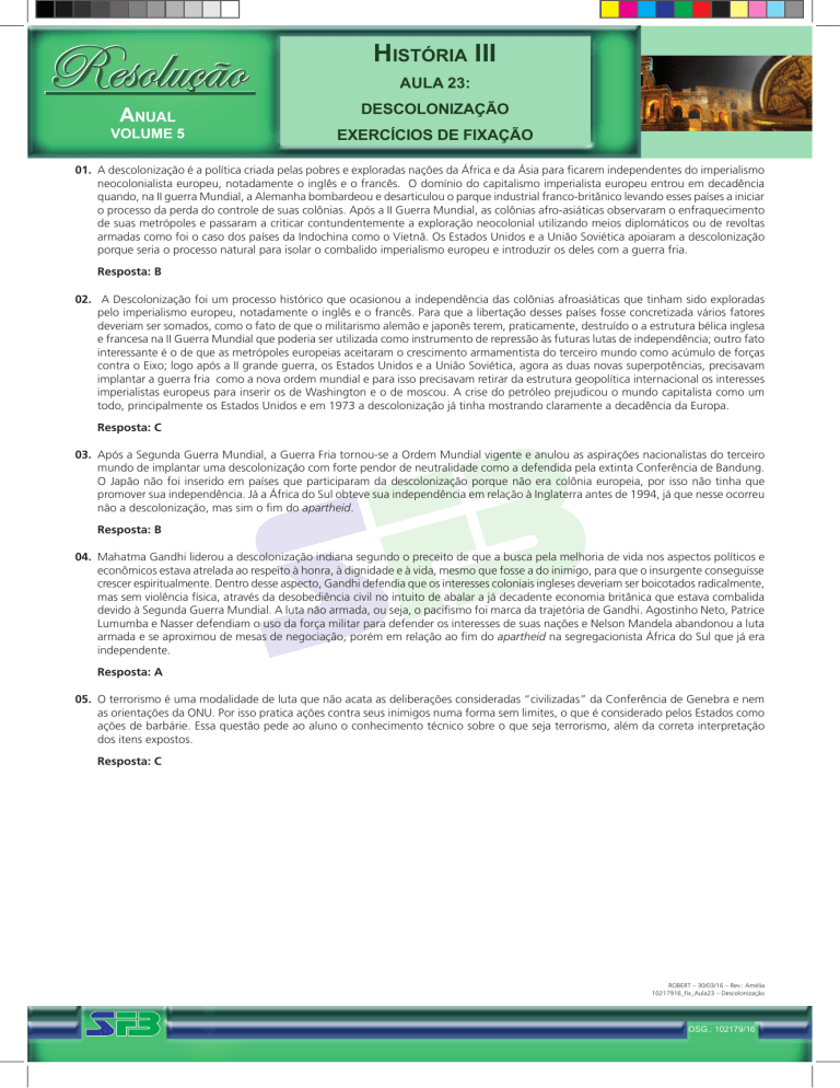 HISTÓRIA III AULA 23: ANUAL VOLUME 5 DESCOLONIZAÇÃO EXERCÍCIOS DE FIXAÇÃO 01. A descolonização é a política criada pelas pobres e exploradas nações da África e da Ásia para ficarem independentes do imperialismo neocolonialista europeu, notadamente o inglês e o francês. O domínio do capitalismo imperialista europeu entrou em decadência quando, na II guerra Mundial, a Alemanha bombardeou e desarticulou o parque industrial franco-britânico levando esses países a iniciar o processo da perda do controle de suas colônias. Após a II Guerra Mundial, as colônias afro-asiáticas observaram o enfraquecimento de suas metrópoles e passaram a criticar contundentemente a exploração neocolonial utilizando meios diplomáticos ou de revoltas armadas como foi o caso dos países da Indochina como o Vietnã. Os Estados Unidos e a União Soviética apoiaram a descolonização porque seria o processo natural para isolar o combalido imperialismo europeu e introduzir os deles com a guerra fria. Resposta: B 02. A Descolonização foi um processo histórico que ocasionou a independência das colônias afroasiáticas que tinham sido exploradas pelo imperialismo europeu, notadamente o inglês e o francês. Para que a libertação desses países fosse concretizada vários fatores deveriam ser somados, como o fato de que o militarismo alemão e japonês terem, praticamente, destruído o a estrutura bélica inglesa e francesa na II Guerra Mundial que poderia ser utilizada como instrumento de repressão às futuras lutas de independência; outro fato interessante é o de que as metrópoles europeias aceitaram o crescimento armamentista do terceiro mundo como acúmulo de forças contra o Eixo; logo após a II grande guerra, os Estados Unidos e a União Soviética, agora as duas novas superpotências, precisavam implantar a guerra fria como a nova ordem mundial e para isso precisavam retirar da estrutura geopolítica internacional os interesses imperialistas europeus para inserir os de Washington e o de moscou. A crise do petróleo prejudicou o mundo capitalista como um todo, principalmente os Estados Unidos e em 1973 a descolonização já tinha mostrando claramente a decadência da Europa. Resposta: C 03. Após a Segunda Guerra Mundial, a Guerra Fria tornou-se a Ordem Mundial vigente e anulou as aspirações nacionalistas do terceiro mundo de implantar uma descolonização com forte pendor de neutralidade como a defendida pela extinta Conferência de Bandung. O Japão não foi inserido em países que participaram da descolonização porque não era colônia europeia, por isso não tinha que promover sua independência. Já a África do Sul obteve sua independência em relação à Inglaterra antes de 1994, já que nesse ocorreu não a descolonização, mas sim o fim do apartheid. Resposta: B 04. Mahatma Gandhi liderou a descolonização indiana segundo o preceito de que a busca pela melhoria de vida nos aspectos políticos e econômicos estava atrelada ao respeito à honra, à dignidade e à vida, mesmo que fosse a do inimigo, para que o insurgente conseguisse crescer espiritualmente. Dentro desse aspecto, Gandhi defendia que os interesses coloniais ingleses deveriam ser boicotados radicalmente, mas sem violência física, através da desobediência civil no intuito de abalar a já decadente economia britânica que estava combalida devido à Segunda Guerra Mundial. A luta não armada, ou seja, o pacifismo foi marca da trajetória de Gandhi. Agostinho Neto, Patrice Lumumba e Nasser defendiam o uso da força militar para defender os interesses de suas nações e Nelson Mandela abandonou a luta armada e se aproximou de mesas de negociação, porém em relação ao fim do apartheid na segregacionista África do Sul que já era independente. Resposta: A 05. O terrorismo é uma modalidade de luta que não acata as deliberações consideradas “civilizadas” da Conferência de Genebra e nem as orientações da ONU. Por isso pratica ações contra seus inimigos numa forma sem limites, o que é considerado pelos Estados como ações de barbárie. Essa questão pede ao aluno o conhecimento técnico sobre o que seja terrorismo, além da correta interpretação dos itens expostos. Resposta: C ROBERT – 30/03/16 – Rev.: Amélia 10217916_fix_Aula23 – Descolonização OSG.: 102179/16
