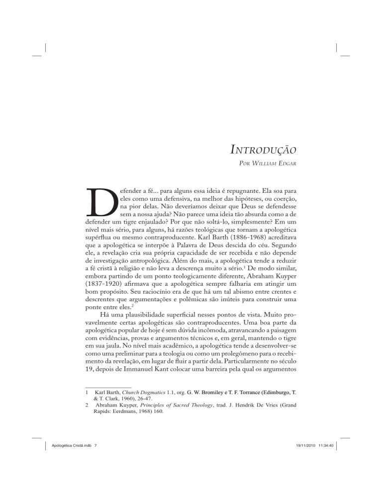 INTRODUÇÃO POR WILLIAM EDGAR D efender a fé... para alguns essa ideia é repugnante. Ela soa para eles como uma defensiva, na melhor das hipóteses, ou coerção, na pior delas. Não deveríamos deixar que Deus se defendesse sem a nossa ajuda? Não parece uma ideia tão absurda como a de defender um tigre enjaulado? Por que não soltá-lo, simplesmente? Em um nível mais sério, para alguns, há razões teológicas que tornam a apologética supérflua ou mesmo contraproducente. Karl Barth (1886-1968) acreditava que a apologética se interpõe à Palavra de Deus descida do céu. Segundo ele, a revelação cria sua própria capacidade de ser recebida e não depende de investigação antropológica. Além do mais, a apologética tende a reduzir a fé cristã à religião e não leva a descrença muito a sério.1 De modo similar, embora partindo de um ponto teologicamente diferente, Abraham Kuyper (1837-1920) afirmava que a apologética sempre falharia em atingir um bom propósito. Seu raciocínio era de que há um tal abismo entre crentes e descrentes que argumentações e polêmicas são inúteis para construir uma ponte entre eles.2 Há uma plausibilidade superficial nesses pontos de vista. Muito provavelmente certas apologéticas são contraproducentes. Uma boa parte da apologética popular de hoje é sem dúvida incômoda, atravancando a paisagem com evidências, provas e argumentos técnicos e, em geral, mantendo o tigre em sua jaula. No nível mais acadêmico, a apologética tende a desenvolver-se como uma preliminar para a teologia ou como um prolegômeno para o recebimento da revelação, em lugar de fluir a partir dela. Particularmente no século 19, depois de Immanuel Kant colocar uma barreira pela qual os argumentos Karl Barth, Church Dogmatics 1.1, org. G. W. Bromiley e T. F. Torrance (Edimburgo, T. & T. Clark, 1960), 26-47. 2 Abraham Kuyper, Principles of Sacred Theology, trad. J. Hendrik De Vries (Grand Rapids: Eerdmans, 1968) 160. 1 Apologética Cristã.indb 7 19/11/2010 11:34:40 8 APOLOGÉTICA CRISTÃ racionais para a existência de Deus eram considerados impossíveis, os apologistas se lançaram à tarefa de encontrar maneiras de atingir o conhecimento de Deus, que não dependessem da revelação por meio da razão. Dentre eles destacava-se Friedrich Schleiermacher (1768-1834), argumentando que, embora Kant estivesse certo, não temos de nos fiar na razão, podemos conhecer a Deus por um sentimento de dependência. Ao longo daquelas décadas, a teologia se confundiu cada vez mais com a antropologia e a ética. Jesus Cristo era frequentemente reconstruído de acordo com a imagem de uma busca por demais humana da verdade. Ele era o grande professor de ética, o ser humano ideal, o profeta do reino de Deus, etc. Quando Karl Barth respondeu com seu Deus absolutamente soberano, que chega até nós por Jesus Cristo em uma experiência de crise, tornou-se natural para ele questionar a propriedade da apologética. Ele estava, sem dúvida, reagindo ao tipo de teologia centrada no homem proposta por Schleiermacher e seus seguidores. Mas o encontro com Cristo a partir de uma crise, como proposto por Barth, acaso fornecia uma base mais sólida para o conhecimento de Deus do que a teologia antropológica dos seus antecessores? Ele estava, de fato, perdendo a parte mais importante da questão. Pois quem pode saber ao certo se Cristo foi ou não encontrado? Mas e quanto a Abraham Kuyper, que defende uma tradição muito mais ortodoxa do que a de Barth? Por que a visão de que a crena e a descrença estão em dois campos diferentes torna inútil toda apologética? A simples antítese entre crença e descrença é suficiente para pôr em dúvida toda a empresa de defesa da fé? Naturalmente, Kuyper está atento a algo importante. É verdade que um abismo separa os dois tipos de visão de mundo, tornando impossível estabelecer um terreno neutro comum. Mas não existe outra base para entendimento, que não exija que o apologista recue de sua própria posição para se comunicar com seu amigo incrédulo? É nesse ponto que Cornelius Van Til, cujo volume apresentamos mais uma vez ao público, mostra uma terceira via, que permite o diálogo apologético sem abrir mão de qualquer antítese entre duas visões de mundo opostas. Cornelius Van Til (1895-1987) foi sem dúvida um dos apologistas mais originais do século 20. No tocante à disciplina, ele foi um reformador, passando boa parte de seu tempo em desafiar as escolas existentes e articular a abordagem apologética que se tornou conhecida como pressuposicionalismo. Apesar de suas raízes distantes estarem no axioma anselmiano, o “entendimento pela busca da fé”, no contexto mais contemporâneo, está na teologia holandesa e presbiteriana de seu horizonte imediato. Seus ossos foram preenchidos com a medula da visão reformada do mundo e da vida. Ele cresceu com ela e jamais a abandonou. Mas, como ele argumenta na cartilha Por que creio em Deus, embora seja perfeitamente verdade que ele foi alimentado por esse tipo Apologética Cristã.indb 8 19/11/2010 11:34:41 INTRODUÇÃO 9 particular de teísmo desde a juventude, na idade adulta ele lhe foi confirmado e reafirmado. Nesse mesmo livreto, um instrumento para evangelização digno de seu autor, Van Til sucintamente estabelece toda a sua filosofia em termos simples, mas profundos: “Hoje, de fato, estou convencido de que toda a história e a civilização seriam ininteligíveis para mim, não fosse pela minha crença em Deus. Isso é tão verdade, que me proponho a argumentar que se Deus não estiver na base de tudo, não se pode encontrar sentido em nada”.3 Dito desta forma, parece não haver nada de particularmente original em seu ponto de vista. Um olhar mais atento revela, no entanto, que uma coisa é a pretenção de começar com Deus, outra coisa é colcoar essa pretenção de a serviço de forma completa e consistente. A originalidade de Van Til consiste nisto: que ele procurou