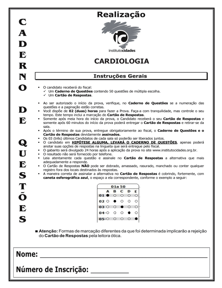 CARDIOLOGIA CARDIOLOGIA 04. Mulher, 48 anos, fazendo uso de atenolol e varfarina nos últimos 04 meses para tratamento de fibrilação atrial está no seu consultório por causa de claudicação em MMII nos últimos 06 meses. Antecedentes pessoais é significante para vertigem posicional benigno diagnosticado há 09 anos e tratado com meclizina ocasionalmente. Exame cardíaco e respiratório normal com edema I/IV em tornozelo bilateralmente e pulsos periféricos diminuídos. Índice tornozelo-braquial é 0.8 e você tomou a decisão de suspender atenolol. Uma vez que o Paciente não tem nenhuma anormalidade estrutural cardíaca, foi iniciado imediatamente amiodarona. O procedimento adequado é: 01. Homem, 59 anos, branco vem ao ambulatório queixando-se de palpitações há 02 semanas. Ele refere que sente o coração “pular uma batida de vez em quando”. Antecedentes pessoais significantes para hipertensão tratado com metoprolol 50mg 2x/dia e DPOC tratado com salbutamol e ipatrópio. Admite consumir 4-6 cervejas/dia nos últimos meses e aumento progressivo do estresse no seu trabalho. Durante o exame, Paciente não se encontra em estresse agudo. Sinais vitais: T: 37.1ºC, Pulso: 65bpm; FR: 14ipm; PA: 135/78mmHg, Oximetro: 93%. ECG é realizado e mostra ritmo sinusal. O próximo passo no diagnóstico deste Paciente é: A) Angiografia. B) Diminuir a dose da varfarina. C) Nenhuma alteração é necessária. D) Solicitar testes de função renal. E) Encaminhar para avaliação cirúrgica. A) Solicitar ecocardiograma. B) Solicitar teste ergométrico. C) Solicitar Holter 72hs. D) Solicitar enzimas cardíacas. E) Informar ao Paciente para retornar em 01 mês. 05. Mulher, 33 anos, vem ao consultório para avaliação médica necessária para novo emprego. Refere se sentir saudável, entretanto sentiu palpitações associado a um quadro de fraqueza e leve tontura ocasionalmente. Ao exame, ele sentiu um episodio de palpitação. Sinais vitais: PA: 115/70mmHg, Pulso: 178bpm; FR: 16ipm. ECG revelou intervalo PR curto e complexo QRS alargado com leve alteração na deflexão inicial. O tratamento inicial em Pacientes com esta condição é: 02. Homem, 41 anos, vem a Emergência com história de febre, anorexia, perda de peso e fadiga por 02 semanas. Ele sente-se saudável e não tem ido ao consultório médico nos últimos meses, apesar de ter tido tratamento dentário recentemente. Não faz uso de medicação e não apresenta alergias. Admite consumir álcool apenas ocasionalmente e nega uso de drogas intravenosas. Ao exame, aparenta doente (T: 38.9ºC) e algumas petéquias nos olhos. Ausculta cardíaca revelou sopro panssistólico III/VI em ápice e irradiando para axila e atrito pericárdico. Exames laboratoriais são colhidos para cultura. Assinale a opção correta. A) Adenosina. B) Amiodarona. C) Metoprolol. D) Procainamida. E) Ablação por cateter com radiofrequência. 06. Mulher, 63 anos, vem à Emergência com dor torácica, náusea, dispnéia e disfagia de início súbito. A dor irradia para a mandíbula e dorso; não se altera com posição corporal. Nega febre, calafrios e hemoptise. Ela foi diagnosticada há 07 anos com hipertensão tratada com hidroclorotiazida. Sinais vitais: 36.5ºC; PA: 160/92mmHg; Pulso: 115/min; FR: 26/min. Ao exame, revelou mulher idosa em agitação intensa devido à dor. Exame físico demonstrou ritmo regular, ausência de atrito e de pulsos assimétricos em MMSS. MV diminuído à esquerda. ECG revelou hipertrofia de VE e ausência de alteração do segmento ST. RX de tórax mostrou aumento do mediastino de 09 cm. Assinale a ação correta a ser tomada. A) Eletrocardiograma. B) Ecocardiograma transtorácico. C) Teste de estresse. D) Ecocardiograma transesofágico. E) Cateterismo cardíaco. 03. Homem, 58 anos, obeso, diabético com história de alcoolismo vem à Emergência de ambulância queixando-se de dispnéia que iniciou enquanto assistia à televisão em casa. Na ambulância, apresentou tosse com secreção. Nega dor torácica. Admite tabagismo e consumo excessivo de álcool. Ao exame, o Paciente encontrava-se agitado e respirando 60% O2 com máscara facial. É incapaz de se comunicar adequadamente. Não há dor à palpação da parede torácica, entretanto ausculta revelou crepitações finas no tórax. Não apresenta sopros. Eletrocardiograma não revelou alteração do segmento ST. Paciente não apresenta melhora após administração de furosemida EV, dinitrato de isossorbida SL e morfina. É iniciado dobutamina EV. Após 10 minutos, quadro permanece inalterado. PA: 126/79mmHg. O procedimento adequado no presente caso é: A) Metoprolol. B) Nitroprussiato. C) TC espiral com contraste. D) TC espiral sem contraste. E) Ecocardiograma transtorácico. 07. Mulher, 33 anos, foi trazida para Emergência após perda de consciência no trabalho. Testemunhas falaram que ela esteve inconsciente por menos de 01 minuto e recuperou-se normalmente. Negaram movimentos tônicoclônicos ou incontinência esfincteriana. Paciente admitiu desorientação e diaforese com náusea antes do evento. Esse foi o primeiro episódio. Sinais vitais: T: 36.7oC; PA: 113/70mmHg; Pulso: 90/min e FR: 15/min. Ausência de turgência jugular. Refere moderada dor em região temporal esquerda e ombro, ausculta cardíaca e respiratória normal e exame neurológico sem alterações. O diagnóstico mais provável é? A) Dopamina. B) Ecocardiografia. C) Hidralazina. D) Verapamil. E) Cardioversão sincronizada. A) Síncope cardiogênica. B) Reflexo Jarisch-Bezold. C) Síncope neurocardiogênica. D) Síncope neurogênica. E) Hipotensão ortostática. CARDIOLOGIA 2 08. Homem, 55 anos, chega à Emergência queixando-se de palpitação recente e fadiga. Refere que tosse vem progressivamente piorando nos últimos dias. Apresenta história para DPOC e diabetes mellitus tratada com ipatrópio, salbutamol e metiformina, respectivamente. Nega consumo de álcool, mas fuma 01 carteira/dia. Sinais vitais: