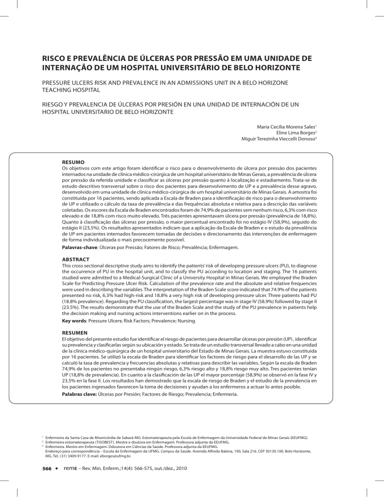 RISCO E PREVALÊNCIA DE ÚLCERAS POR PRESSÃO EM UMA UNIDADE DE INTERNAÇÃO DE UM HOSPITAL UNIVERSITÁRIO DE BELO HORIZONTE PRESSURE ULCERS RISK AND PREVALENCE IN AN ADMISSIONS UNIT IN A BELO HORIZONE TEACHING HOSPITAL RIESGO Y PREVALENCIA DE ÚLCERAS POR PRESIÓN EN UNA UNIDAD DE INTERNACIÓN DE UN HOSPITAL UNIVERSITARIO DE BELO HORIZONTE Maria Cecília Moreira Sales1 Eline Lima Borges2 Miguir Terezinha Vieccelli Donoso3 RESUMO Os objetivos com este artigo foram identificar o risco para o desenvolvimento de úlcera por pressão dos pacientes internados na unidade de clínica médico-cirúrgica de um hospital universitário de Minas Gerais, a prevalência de úlcera por pressão da referida unidade e classificar as úlceras por pressão quanto à localização e estadiamento. Trata-se de estudo descritivo transversal sobre o risco dos pacientes para desenvolvimento de UP e a prevalência desse agravo, desenvolvido em uma unidade de clínica médico-cirúrgica de um hospital universitário de Minas Gerais. A amostra foi constituída por 16 pacientes, sendo aplicada a Escala de Braden para a identificação de risco para o desenvolvimento de UP e utilizado o cálculo da taxa de prevalência e das frequências absoluta e relativa para a descrição das variáveis coletadas. Os escores da Escala de Braden encontrados foram de 74,9% de pacientes sem nenhum risco, 6,3% com risco elevado e de 18,8% com risco muito elevado. Três pacientes apresentavam úlcera por pressão (prevalência de 18,8%). Quanto à classificação das úlceras por pressão, o maior percentual encontrado foi no estágio IV (58,9%), seguido do estágio II (23,5%). Os resultados apresentados indicam que a aplicação da Escala de Braden e o estudo da prevalência de UP em pacientes internados favorecem tomadas de decisões e direcionamento das intervenções de enfermagem de forma individualizada o mais precocemente possível. Palavras-chave: Úlceras por Pressão; Fatores de Risco; Prevalência; Enfermagem. ABSTRACT This cross sectional descriptive study aims to identify the patients’ risk of developing pressure ulcers (PU), to diagnose the occurrence of PU in the hospital unit, and to classify the PU according to location and staging. The 16 patients studied were admitted to a Medical-Surgical Clinic of a University Hospital in Minas Gerais. We employed the Braden Scale for Predicting Pressure Ulcer Risk. Calculation of the prevalence rate and the absolute and relative frequencies were used in describing the variables. The interpretation of the Braden Scale score indicated that 74.9% of the patients presented no risk, 6.3% had high-risk and 18.8% a very high risk of developing pressure ulcer. Three patients had PU (18.8% prevalence). Regarding the PU classification, the largest percentage was in stage IV (58.9%) followed by stage II (23.5%). The results demonstrate that the use of the Braden Scale and the study of the PU prevalence in patients help the decision making and nursing actions interventions earlier on in the process. Key words: Pressure Ulcers; Risk Factors; Prevalence; Nursing. RESUMEN El objetivo del presente estudio fue identificar el riesgo de pacientes para desarrollar úlceras por presión (UP) , identificar su prevalencia y clasificarlas según su ubicación y estado. Se trata de un estudio transversal llevado a cabo en una unidad de la clínica médico-quirúrgica de un hospital universitario del Estado de Minas Gerais. La muestra estuvo constituida por 16 pacientes. Se utilizó la escala de Braden para identificar los factores de riesgo para el desarrollo de las UP y se calculó la tasa de prevalencia y frecuencias absolutas y relativas para describir las variables. Según la escala de Braden 74,9% de los pacientes no presentaba ningún riesgo, 6,3% riesgo alto y 18,8% riesgo muy alto. Tres pacientes tenían UP (18,8% de prevalencia). En cuanto a la clasificación de las UP el mayor porcentaje (58,9%) se observó en la fase IV y 23,5% en la fase II. Los resultados han demostrado que la escala de riesgo de Braden y el estudio de la prevalencia en los pacientes ingresados favorecen la toma de decisiones y ayudan a los enfermeros a actuar lo antes posible. Palabras clave: Úlceras por Presión; Factores de Riesgo; Prevalencia; Enfermería. 1 2 3 Enfermeira da Santa Casa de Misericórdia de Sabará-MG. Estomaterapeuta pela Escola de Enfermagem da Universidade Federal de Minas Gerais (EEUFMG). Enfermeira estomaterapeuta (TiSOBEST). Mestre e doutora em Enfermagem. Professora adjunta da EEUFMG. Enfermeira. Mestre em Enfermagem. Ddoutora em Ciências da Saúde. Professora adjunta da EEUFMG. Endereço para correspondência – Escola de Enfermagem da UFMG. Campus da Saúde. Avenida Alfredo Balena, 190, Sala 216. CEP 30130.100. Belo Horizonte, MG. Tel.: (31) 3409-9177. E-mail: [email protected]. 566 remE – Rev. Min. Enferm.;14(4): 566-575, out./dez., 2010 INTRODUÇÃO A busca pela melhoria da qualidade da assistência prestada ao paciente hospitalizado não depende unicamente dos avanços tecnológicos e científicos, mas, principalmente, da utilização do conhecimento dos profissionais que o assistem, em especial a equipe de enfermagem. 1 Um dos desafios da equipe de enfermagem diante do paciente hospitalizado refere-se à prevenção das úlceras por pressão (UPs), bem como ao cuidado daqueles acometidos por esse agravo. As UPs sempre demandaram grande preocupação aos serviços de saúde, quer pela elevada incidência, prevalência e diversidade de medidas profiláticas e terapêuticas demandadas, quer pelo aumento da mortalidade, morbidade e custos delas provenientes.2 Úlceras por pressão são definidas pelo National Pressure Ulcer Advisory Panel (NPUAP) como “áreas localizadas de tecido necrótico que tendem a se desenvolver quando um tecido é comprimido entre uma proeminência óssea e uma superfície externa por tempo prolongado.”3 São agravos comuns que aumentam o risco de infecção, d