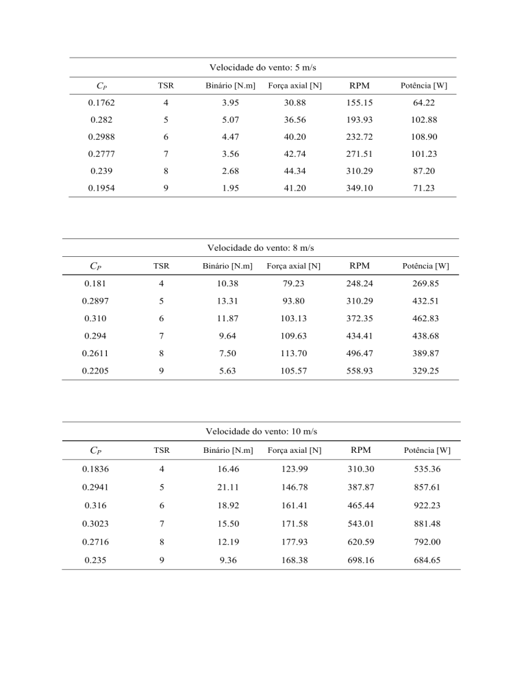 Velocidade do vento: 5 m/s CP TSR Binário [N.m] Força axial [N] RPM Potência [W] 0.1762 4 3.95 30.88 155.15 64.22 0.282 5 5.07 36.56 193.93 102.88 0.2988 6 4.47 40.20 232.72 108.90 0.2777 7 3.56 42.74 271.51 101.23 0.239 8 2.68 44.34 310.29 87.20 0.1954 9 1.95 41.20 349.10 71.23 Velocidade do vento: 8 m/s CP TSR Binário [N.m] Força axial [N] RPM Potência [W] 0.181 4 10.38 79.23 248.24 269.85 0.2897 5 13.31 93.80 310.29 432.51 0.310 6 11.87 103.13 372.35 462.83 0.294 7 9.64 109.63 434.41 438.68 0.2611 8 7.50 113.70 496.47 389.87 0.2205 9 5.63 105.57 558.93 329.25 Velocidade do vento: 10 m/s CP TSR Binário [N.m] Força axial [N] RPM Potência [W] 0.1836 4 16.46 123.99 310.30 535.36 0.2941 5 21.11 146.78 387.87 857.61 0.316 6 18.92 161.41 465.44 922.23 0.3023 7 15.50 171.58 543.01 881.48 0.2716 8 12.19 177.93 620.59 792.00 0.235 9 9.36 168.38 698.16 684.65 Velocidade do vento: 13 m/s CP TSR Binário [N.m] Força axial [N] RPM Potência [W] 0.1876 4 28.45 210.10 403.40 1201.60 0.3003 5 36.44 248.74 504.23 1923.90 0.324 6 32.76 273.54 605.07 2075.40 0.3105 7 26.91 298.82 705.92 1989.40 0.2815 8 21.35 285.61 806.76 1803.50 0.2516 9 16.96 290.85 907.61 1611.70 Velocidade do vento: 15 m/s CP TSR Binário [N.m] Força axial [N] RPM Potência [W] 0.1903 4 38.42 280.20 465.44 1872.40 0.304 5 49.10 331.79 581.80 2991.20 0.330 6 44.44 372.13 698.16 3248.70 0.316 7 36.51 400.72 814.52 3114.00 0.2882 8 29.09 382.70 930.88 2835.80 0.258 9 23.18 388.63 1047.20 2541.60