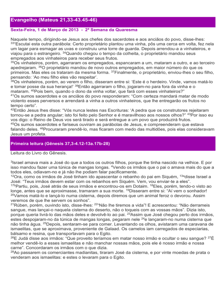 Evangelho (Mateus 21,33-43.45-46) Sexta-Feira, 1 de Março de 2013 - 2ª Semana da Quaresma Naquele tempo, dirigindo-se Jesus aos chefes dos sacerdotes e aos anciãos do povo, disse-lhes: 33“Escutai esta outra parábola: Certo proprietário plantou uma vinha, pôs uma cerca em volta, fez nela um lagar para esmagar as uvas e construiu uma torre de guarda. Depois arrendou-a a vinhateiros, e viajou para o estrangeiro. 34Quando chegou o tempo da colheita, o proprietário mandou seus empregados aos vinhateiros para receber seus frutos. 35Os vinhateiros, porém, agarraram os empregados, espancaram a um, mataram a outro, e ao terceiro apedrejaram. 36O proprietário mandou de novo outros empregados, em maior número do que os primeiros. Mas eles os trataram da mesma forma. 37Finalmente, o proprietário, enviou-lhes o seu filho, pensando: ‘Ao meu filho eles vão respeitar’. 38Os vinhateiros, porém, ao verem o filho, disseram entre si: ‘Este é o herdeiro. Vinde, vamos matá-lo e tomar posse da sua herança!’ 39Então agarraram o filho, jogaram-no para fora da vinha e o mataram. 40Pois bem, quando o dono da vinha voltar, que fará com esses vinhateiros?” 41Os sumos sacerdotes e os anciãos do povo responderam: “Com certeza mandará matar de modo violento esses perversos e arrendará a vinha a outros vinhateiros, que lhe entregarão os frutos no tempo certo”. 42Então Jesus lhes disse: “Vós nunca lestes nas Escrituras: ‘A pedra que os construtores rejeitaram tornou-se a pedra angular; isto foi feito pelo Senhor e é maravilhoso aos nossos olhos?” 43Por isso eu vos digo: o Reino de Deus vos será tirado e será entregue a um povo que produzirá frutos. 45Os sumos sacerdotes e fariseus ouviram as parábolas de Jesus, e compreenderam que estava falando deles. 46Procuraram prendê-lo, mas ficaram com medo das multidões, pois elas consideravam Jesus um profeta. Primeira leitura (Gênesis 37,3-4.12-13a.17b-28) Leitura do Livro do Gênesis. 3Israel amava mais a José do que a todos os outros filhos, porque lhe tinha nascido na velhice. E por isso mandou fazer uma túnica de mangas longas. 4Vendo os irmãos que o pai o amava mais do que a todos eles, odiavam-no e já não lhe podiam falar pacificamente. 12Ora, como os irmãos de José tinham ido apascentar o rebanho do pai em Siquém, 13adisse Israel a José: “Teus irmãos devem estar com os rebanhos em Siquém. Vem, vou enviar-te a eles”. 17bPartiu, pois, José atrás de seus irmãos e encontrou-os em Dotaim. 18Eles, porém, tendo-o visto ao longe, antes que se aproximasse, tramaram a sua morte. 19Disseram entre si: “Aí vem o sonhador! 20Vamos matá-lo e lançá-lo numa cisterna, depois diremos que um animal feroz o devorou. Assim veremos de que lhe servem os sonhos”. 21Rúben, porém, ouvindo isto, disse-lhes: 22“Não lhe tiremos a vida”! E acrescentou: “Não derrameis sangue, mas lançai-o naquela cisterna do deserto, não o toqueis com as vossas mãos”. Dizia isto, porque queria livrá-lo das mãos deles e devolvê-lo ao pai. 23Assim que José chegou perto dos irmãos, estes despojaram-no da túnica de mangas longas, pegaram nele 24e lançaram-no numa cisterna que não tinha água. 25Depois, sentaram-se para comer. Levantando os olhos, avistaram uma caravana de ismaelitas, que se aproximava, proveniente de Galaad. Os camelos iam carregados de especiarias, bálsamo e resina, que transportavam para o Egito. 26E Judá disse aos irmãos: “Que proveito teríamos em matar nosso irmão e ocultar o seu sangue? 27É melhor vendê-lo a esses ismaelitas e não manchar nossas mãos, pois ele é nosso irmão e nossa carne”. Concordaram os irmãos com o que dizia. 28Ao passarem os comerciantes madianitas, tiraram José da cisterna, e por vinte moedas de prata o venderam aos ismaelitas: e estes o levaram para o Egito. Salmo (Salmos 104,6-21) — Lembrai sempre as maravilhas do Senhor! — Mandou vir, então, a fome sobre a terra e os privou de todo pão que os sustentava; um homem enviara à sua frente, José que foi vendido como escravo. — Apertaram os seus pés entre grilhões e amarraram seu pescoço com correntes, até que se cumprisse o que previra, e a palavra do Senhor lhe deu razão. — Ordenou, então, o rei que o libertassem, o soberano das nações mandou soltá-lo; fez dele o senhor de sua casa, e de todos os seus bens o despenseiro. Evangelho (Lucas 15,1-3.11-32) Sábado, 2 de Março de 2013 - 2ª Semana da Quaresma Naquele tempo, 1os publicanos e pecadores aproximaram-se de Jesus para o escutar. 2Os fariseus, porém, e os mestres da Lei criticavam Jesus: “Este homem acolhe os pecadores e faz refeição com eles”. 3Então Jesus contou-lhes esta parábola: 11“Um homem tinha dois filhos. 12O filho mais novo disse ao pai: ‘Pai, dá-me a parte da herança que me cabe’. E o pai dividiu os bens entre eles. 13Poucos dias depois, o filho mais novo juntou o que era seu e partiu para um lugar distante. E ali esbanjou tudo numa vida desenfreada. 14Quando tinha gasto tudo o que possuía, houve uma grande fome naquela região, e ele começou a passar necessidade. 15Então foi pedir trabalho a um homem do lugar, que o mandou para seu campo cuidar dos porcos. 16O rapaz queira matar a fome com a comida que os porcos comiam, mas nem isto lhe davam. 17Então caiu em si e disse: ‘Quantos empregados do meu pai têm pão com fartura, e eu aqui, morrendo de fome’. 18Vou-me embora, vou voltar para meu pai e dizer-lhe: ‘Pai, pequei contra Deus e contra ti; 19já não mereço ser chamado teu filho. Trata-me como a um dos teus empregados’. 20Então ele partiu e voltou para seu pai. Quando ainda estava longe, seu pai o avistou e sentiu compaixão. Correu-lhe ao encontro, abraçou-o e cobriu-o de beijos. 21O filho, então, lhe disse: ‘Pai, pequei contra Deus e contra ti. Já não mereço ser chamado teu filho’. 22Mas o pai disse aos empregados: ‘Trazei depressa a melhor túnica para vestir meu filho. E colocai