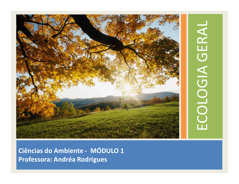 ECOLOGIA GERAL Ciências do Ambiente - MÓDULO 1 Professora: Andréa Rodrigues O que é Ecologia? Algumas definições: 1. Ciência que estuda as relações entre os seres vivos e o meio ambiente (Haeckel, 1866). 2. Ciência que estuda a estrutura e funcionamento da Natureza, considerando que a humanidade é uma parte dela (Odum, 1972). 4. A ecologia é a ciência da sinfonia da vida, é a ciência da sobrevivência (Lutzenberger). 5. Ciência que estuda as relações entre os seres vivos e o meio ambiente em que vivem, bem como as suas recíprocas influências (Atlas do Meio Ambiente do Brasil, 1994). O que é Meio Ambiente? Conjunto de condições que afetam a existência, desenvolvimento e bemestar dos seres vivos, incluindo não apenas o lugar no espaço, mas todas as condições físicas, químicas e biológicas (ambientes naturais e artificiais). (Atlas do meio ambiente do Brasil, 1994) Ciência Ambiental é o estudo de como a Terra funciona, de como interagir com ela e de como lidar com os problemas ambientais. (Miller, 2008) MEIO AMBIENTE ♦Conjunto de condições físicas, químicas e biológicas que cercam o ser vivo, resultando num conjunto de limitações e possibilidades para uma dada espécie. ♦O meio ambiente é heterogêneo e continua variando de um local para outro dando origem a agrupamentos de seres diferentes. ♦Tais agrupamentos interferem na composição do meio e são beneficiados ou prejudicados com essas transformações. SELEÇÃO NATURAL ♦O meio ambiente está sempre mudando e evoluindo. ♦O clima, os seres vivos e as próprias atividades humanas modificam o ambiente e são influenciadas por essas alterações. Esta é a essência da evolução. ♦Alguns seres vivos se extinguem outros se adaptam e evoluem. ♦O meio ambiente é seletivo (processo de seleção natural). SELEÇÃO ARTIFICIAL ♦A seleção nem sempre é natural. ♦O homem aprendeu a utilizar a mutação para produzir organismos que atendam a algum propósito útil ou desejável. ♦Criou-se assim o processo de seleção artificial. ♦Os organismos assim obtidos sobrevivem no ambiente sob a proteção humana. HABITAT E NICHO ECOLÓGICO HABITAT área física/geográfica (endereço) onde se encontra o ser vivo. É o ambiente que oferece um conjunto de condições favoráveis ao desenvolvimento de suas necessidades básicas. No habitat, as condições ambientais atingem o ponto ótimo para o desenvolvimento de uma determinada espécie. NICHO ECOLÓGICO conjunto de atividades desenvolvidas (profissão) pelos seres vivos para a satisfação das suas necessidades básicas. POTENCIAL BIÓTICO X RESISTÊNCIA AMBIENTAL Potencial biótico é a capacidade que possuem os organismos de reproduzir-se sob condições ótimas. Resistência ambiental compreende todos os fatores que se opõem ao desenvolvimento do potencial biótico. NÍVEIS DE ORGANIZAÇÃO Átomos →Moléculas →Célula →Tecido → Órgão →Sistema → ORGANISMO →POPULAÇÃO →COMUNIDADE →ECOSSISTEMA →BIOSFERA ORGANISMO é o conjunto de órgãos que constituem um ser vivo POPULAÇÃO conjunto de indivíduos de uma mesma espécie que ocupa uma determinada área COMUNIDADE conjunto de populações que interagem de forma organizada, vivendo numa mesma área ECOSSISTEMA conjunto resultante da interação entre a comunidade e o ambiente inerte BIOSFERA sistema que inclui todos os seres vivos da Terra, interagindo com o ambiente físico como um todo RESUMO ECOLOGIA MEIO AMBIENTE SELEÇÃO NATURAL E ARTIFICIAL HABITAT E NICHO ECOLÓGICO POTENCIAL BIÓTICO E RESISTÊNCIA AMBIENTAL NÍVEIS DE ORGANIZAÇÃO BIOSFERA PLANETA TERRA Ciências do Ambiente Professora: Andréa Rodrigues BIOSFERA/ ECOSFERA Região do planeta que contém o conjunto dos seres vivos na qual a vida é permanentemente possível. A biosfera possui uma estrutura complexa e uma composição continuamente variável. Cada região do planeta possui aspectos particulares de luminosidade, relevo, clima, vegetação, água entre outros. A biosfera é o agrupamento de todos os elementos naturais que favorecem e dão condições para a manutenção da vida no planeta. É na biosfera que acontecem as interações entre os seres vivos e esses com os elementos naturais em diferentes lugares do mundo. Sistemas de suporte da vida na Terra A Terra é constituída de camadas esféricas interligadas que contém ar, água, solo, minerais e vida Quais seriam essas esferas? BIOSFERA: COMPOSIÇÃO Litosfera, Hidrosfera, Atmosfera ATMOSFERA BIOSFERA/ECOSFERA LITOSFERA HIDROSFERA ATMOSFERA Camada gasosa que envolve o planeta HIDROSFERA • É formada pela água da Terra • Envolve ¾ da superfície do planeta • Encontra-se nas formas: Água Líquida – na superfície (rios, mares e lagos) e no subsolo do planeta (aquíferos) Gelo – neve, icebergs e o gelo encontrado nas camadas de solo Vapor de água – na atmosfera LITOSFERA • • • • Consiste na crosta, nos mantos e no núcleo da Terra Possui condições climáticas variáveis A biodiversidade é enorme Abrange ¼ da superfície do planeta BIOSFERA Litosfera Atmosfera Hidrosfera + Organismos Todas as partes da Biosfera estão interligadas CONDIÇÕES ESSENCIAIS À VIDA • Presença de Água Fonte de energia Elementos químicos Gravidade • Ausência de Variações climáticas bruscas Radiações ionizantes VIDA NA BIOSFERA • A TERRA tem 4,6 bilhões de anos • O ser vivo mais antigo – BACTÉRIA – formouse a 3,5 bilhões de anos VIDA NA BIOSFERA • • • • • • Os primeiros VEGETAIS datam de cerca de 1,5 bilhões de anos – em terra, a cerca de 420 milhões de anos Os membros mais simples do reino animal – ESPONJAS – datam de 570 milhões de anos Os INSETOS surgiram a 250 milhões de anos Os DINOSSAUROS e os GRANDES RÉPTEIS surgiram a 230 milhões de anos Os MAMÍFEROS a 175 milhões de anos O HOMEM a 46 milhões de anos COMPLEXIDADE • A BIOSFERA se caracteriza por uma estrutura muito complexa •