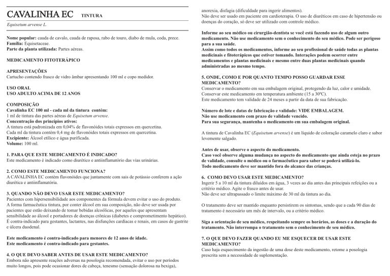 CAVALINHA EC TINTURA Equisetum arvense L. Nome popular: cauda de cavalo, cauda de raposa, rabo de touro, diabo de mula, coda, prece. Família: Equisetaceae. Parte da planta utilizada: Partes aéreas. MEDICAMENTO FITOTERÁPICO APRESENTAÇÕES Cartucho contendo frasco de vidro âmbar apresentando 100 ml e copo medidor. USO ORAL USO ADULTO ACIMA DE 12 ANOS COMPOSIÇÃO Cavalinha EC 100 ml - cada ml da tintura contém: 1 ml de tintura das partes aéreas de Equisetum arvense. Concentração dos princípios ativos: A tintura está padronizada em 0,04% de flavonóides totais expressos em quercetina. Cada ml da tintura contém 0,4 mg de flavonóides totais expressos em quercetina. Excipiente: Álcool etílico e água purificada. Volume: 100 ml. 1. PARA QUE ESTE MEDICAMENTO É INDICADO? Este medicamento é indicado como diurético e antiinflamatório das vias urinárias. 2. COMO ESTE MEDICAMENTO FUNCIONA? A CAVALINHA EC contém flavonóides que juntamente com sais de potássio conferem a ação diurética e antiinflamatória. 3. QUANDO NÃO DEVO USAR ESTE MEDICAMENTO? Pacientes com hipersensibilidade aos componentes da fórmula devem evitar o uso do produto. A forma farmacêutica tintura, por conter álcool em sua composição, não deve ser usada por pacientes que estão deixando de tomar bebidas alcoólicas, por aqueles que apresentam sensibilidade ao álcool e portadores de doenças crônicas (diabetes e comprometimento hepático). É contra-indicado para gestantes, lactantes, nas disfunções cardíacas e renais, em casos de gastrite e úlcera duodenal. Este medicamento é contra-indicado para menores de 12 anos de idade. Este medicamento é contra-indicado para gestantes. 4. O QUE DEVO SABER ANTES DE USAR ESTE MEDICAMENTO? Embora não apresente reações adversas na posologia recomendada, evitar o uso por períodos muito longos, pois pode ocasionar dores de cabeça, tenesmo (sensação dolorosa na bexiga), anorexia, disfagia (dificuldade para ingerir alimentos). Não deve ser usado em paciente em cardioterapia. O uso de diuréticos em caso de hipertensão ou doenças do coração, só deve ser utilizado com controle médico. Informe ao seu médico ou cirurgião-dentista se você está fazendo uso de algum outro medicamento. Não use medicamento sem o conhecimento do seu médico. Pode ser perigoso para a sua saúde. Assim como todos os medicamentos, informe ao seu profissional de saúde todas as plantas medicinais e fitoterápicos que estiver tomando. Interações podem ocorrer entre medicamentos e plantas medicinais e mesmo entre duas plantas medicinais quando administradas ao mesmo tempo. 5. ONDE, COMO E POR QUANTO TEMPO POSSO GUARDAR ESSE MEDICAMENTO? Conservar o medicamento em sua embalagem original, protegendo da luz, calor e umidade. Conservar este medicamento em temperatura ambiente (15 a 30ºC). Este medicamento tem validade de 24 meses a partir da data de sua fabricação. Número de lote e datas de fabricação e validade: VIDE EMBALAGEM. Não use medicamento com prazo de validade vencido. Para sua segurança, mantenha o medicamento em sua embalagem original. A tintura de Cavalinha EC (Equisetum arvense) é um líquido de coloração caramelo claro e sabor levemente salgado. Antes de usar, observe o aspecto do medicamento. Caso você observe alguma mudança no aspecto do medicamento que ainda esteja no prazo de validade, consulte o médico ou o farmacêutico para saber se poderá utilizá-lo. Todo medicamento deve ser mantido fora do alcance das crianças. 6. COMO DEVO USAR ESTE MEDICAMENTO? Ingerir 5 a 10 ml da tintura diluídos em água, 3 vezes ao dia antes das principais refeições ou a critério médico. Agite o frasco antes de usar. Não deve ser ultrapassado o limite máximo de 30 ml da tintura ao dia. O tratamento deve ser mantido enquanto persistirem os sintomas, sendo que a cada 90 dias de tratamento é necessário um mês de intervalo, ou a critério médico. Siga a orientação de seu médico, respeitando sempre os horários, as doses e a duração do tratamento. Não interrompa o tratamento sem o conhecimento de seu médico. 7. O QUE DEVO FAZER QUANDO EU ME ESQUECER DE USAR ESTE MEDICAMENTO? Caso haja esquecimento da ingestão de uma dose deste medicamento, retome a posologia prescrita sem a necessidade de suplementação. N° de lote, data de fabricação e data de validade: VIDE EMBALAGEM Em casos de dúvidas, procure orientação do farmacêutico ou de seu médico, ou cirurgiãodentista. 8. QUAIS OS MALES QUE ESTE MEDICAMENTO PODE ME CAUSAR? Não são conhecidos os efeitos colaterais com a utilização das dosagens recomendadas de produtos contendo Equisetum arvense. Reação rara (ocorre entre 0,01% e 0,1% dos pacientes que utilizam este medicamento): com a administração contínua do produto (tratamentos prolongados) podem ocorrer cefaléias, tenesmo, anorexia, disfagia. Informe seu médico, cirurgião-dentista ou farmacêutico o aparecimento de reações indesejáveis pelo uso do medicamento. Informe a empresa sobre o aparecimento de reações indesejáveis e problemas com este medicamento, entrando em contato através do Sistema de Atendimento ao Consumidor (SAC). MS: 1.1678.0009 Farmacêutico Responsável: Aldo Cândido Dadalt CRF-PR: 4787 Fabricado por: As Ervas Curam Indústria Farmacêutica Ltda Rua Eunice Weaver, 231, Campo Comprido Curitiba - PR - CEP: 81220-080 CNPJ: 79.634.572/0001-82 Indústria Brasileira SAC 0800 643 3949 VENDA SOB PRESCRIÇÃO MÉDICA Esta bula foi aprovada pela ANVISA em 19/05/2010. 9. O QUE FAZER SE ALGUÉM USAR UMA QUANTIDADE MAIOR DO QUE A INDICADA DESTE MEDICAMENTO? A ingestão de altas doses de produtos contendo Equisetum arvense pode provocar queda brusca de pressão arterial, perda de eletrólitos e irritação nas vias urinárias. Em caso de superdosagem, suspender o uso, procurar orientação médica de imediato para que sejam adotadas as medidas habituais de apoio e controle das funções vitais. Em caso de uso de grande q