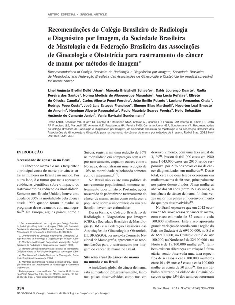 Urban LABD et al. Rastreamento ARTIGO ESPECIAL do câncer • deSPECIAL mama porARTICLE métodos de imagem Recomendações do Colégio Brasileiro de Radiologia e Diagnóstico por Imagem, da Sociedade Brasileira de Mastologia e da Federação Brasileira das Associações de Ginecologia e Obstetrícia para rastreamento do câncer de mama por métodos de imagem* Recommendations of Colégio Brasileiro de Radiologia e Diagnóstico por Imagem, Sociedade Brasileira de Mastologia, and Federação Brasileira das Associações de Ginecologia e Obstetrícia for imaging screening for breast cancer Linei Augusta Brolini Dellê Urban1, Marcela Brisighelli Schaefer2, Dakir Lourenço Duarte2, Radiá Pereira dos Santos2, Norma Medicis de Albuquerque Maranhão2, Ana Lucia Kefalas2, Ellyete de Oliveira Canella2, Carlos Alberto Pecci Ferreira2, João Emílio Peixoto2, Luciano Fernandes Chala3, Rodrigo Pepe Costa4, José Luís Esteves Francisco4, Simone Elias Martinelli4, Heverton Leal Ernesto de Amorim4, Henrique Alberto Pasqualette5, Paulo Mauricio Soares Pereira5, Helio Sebastião Amâncio de Camargo Junior5, Vania Ravizzini Sondermann5 Urban LABD, Schaefer MB, Duarte DL, Santos RP, Maranhão NMA, Kefalas AL, Canella EO, Ferreira CAP, Peixoto JE, Chala LF, Costa RP, Francisco JLE, Martinelli SE, Amorim HLE, Pasqualette HA, Pereira PMS, Camargo Junior HSA, Sondermann VR. Recomendações do Colégio Brasileiro de Radiologia e Diagnóstico por Imagem, da Sociedade Brasileira de Mastologia e da Federação Brasileira das Associações de Ginecologia e Obstetrícia para rastreamento do câncer de mama por métodos de imagem. Radiol Bras. 2012 Nov/ Dez;45(6):334–339. INTRODUÇÃO Necessidade de consenso no Brasil O câncer de mama é o mais freqüente e a principal causa de morte por câncer entre as mulheres no Brasil e no mundo. Por outro lado, é o tumor que mais apresenta evidências científicas sobre o impacto do rastreamento na redução da mortalidade. Somente nos Estado Unidos, houve uma queda de 30% na mortalidade pela doença desde 1990, quando foram iniciados os programas de rastreamento com mamografia(1). Na Europa, alguns países, como a * Documento elaborado em conjunto pelo Colégio Brasileiro de Radiologia e Diagnóstico por Imagem (CBR), pela Sociedade Brasileira de Mastologia (SBM) e pela Federação Brasileira das Associações de Ginecologia e Obstetrícia (FEBRASGO). 1. Coordenadora da Comissão Nacional de Mamografia, Colégio Brasileiro de Radiologia e Diagnóstico por Imagem (CBR). 2. Membros da Comissão Nacional de Mamografia, Colégio Brasileiro de Radiologia e Diagnóstico por Imagem (CBR). 3. Membro Convidado da Comissão Nacional de Mamografia, Colégio Brasileiro de Radiologia e Diagnóstico por Imagem (CBR). 4. Membros da Comissão Nacional de Mamografia, Sociedade Brasileira de Mastologia (SBM). 5. Membros da Comissão Nacional de Mamografia, Federação Brasileira das Associações de Ginecologia e Obstetrícia (FEBRASGO). Endereço para correspondência: Dra. Linei A. B. D. Urban. Rua Padre Agostinho, 913, ap. 53, Mercês. Curitiba, PR, Brasil, 80430-050. E-mail: [email protected] Suécia, registraram uma redução de 36% na mortalidade em comparação com a era pré-rastreamento, enquanto outros, como a Noruega, demonstraram uma redução de 10% na mortalidade relacionada somente com o rastreamento(2,3). No Brasil não existe uma política de rastreamento populacional, somente rastreamento oportunístico. Portanto, ações no sentido de padronizar o rastreamento do câncer de mama, assim como esclarecer a população sobre a importância da sua realização, devem ser estimuladas. Dessa forma, o Colégio Brasileiro de Radiologia e Diagnóstico por Imagem (CBR), a Sociedade Brasileira de Mastologia (SBM) e a Federação Brasileira das Associações de Ginecologia e Obstetrícia (FEBRASGO), por meio da Comissão Nacional de Mamografia, apresentam as recomendações para o rastreamento por imagem do câncer de mama no Brasil. Situação atual do câncer de mama no mundo e no Brasil A incidência global do câncer de mama está aumentando progressivamente, tanto nos países desenvolvidos como nos em 334 0100-3984 © Colégio Brasileiro de Radiologia e Diagnóstico por Imagem desenvolvimento, com uma taxa anual de 3,1%(4). Passou de 641.000 casos em 1980 para 1.643.000 casos em 2010, sendo responsável por 27% dos novos casos de câncer diagnosticados em mulheres(4). Desse total, cerca de dois terços ocorreram em mulheres acima de 50 anos, principalmente nos países desenvolvidos. Já nas mulheres abaixo dos 50 anos (entre 15 e 49 anos), a incidência de câncer de mama foi duas vezes maior nos países em desenvolvimento do que nos desenvolvidos(4). No Brasil espera-se que em 2012 ocorram 52.680 novos casos de câncer de mama, com risco estimado de 52 casos a cada 100.000 mulheres. Este risco apresenta grande variação de acordo com a região do País: no Sudeste é de 69/100.000, no Sul é de 65/100.000, no Centro-Oeste é de 48/ 100.000, no Nordeste é de 32/100.000 e no Norte é de 19/100.000 mulheres(5). Também existem diferenças em relação à faixa etária, sendo observada uma taxa específica de 4 casos a cada 100.000 mulheres entre 40 e 49 anos e 5 casos a cada 100.000 mulheres acima de 50 anos(5). Em um trabalho realizado na cidade de Goiânia observou-se que 15% dos tumores ocorreram Radiol Bras. 2012 Nov/Dez;45(6):334–339 Urban LABD et al. Rastreamento do câncer de mama por métodos de imagem abaixo dos 40 anos, 27% entre 41 e 50 anos e 57% acima dos 50 anos(6). Ou seja, mais de 40% dos casos de câncer de mama ocorreram em pacientes abaixo dos 50 anos. Por outro lado, a taxa de mortalidade pelo câncer de mama é bastante diferente entre os países desenvolvidos e os em desenvolvimento no mundo. Nos países desenvolvidos houve importante redução da mortalidade nos últimos anos, enquanto nos países em desenvolvimento observouse estabilidade ou mesmo cont