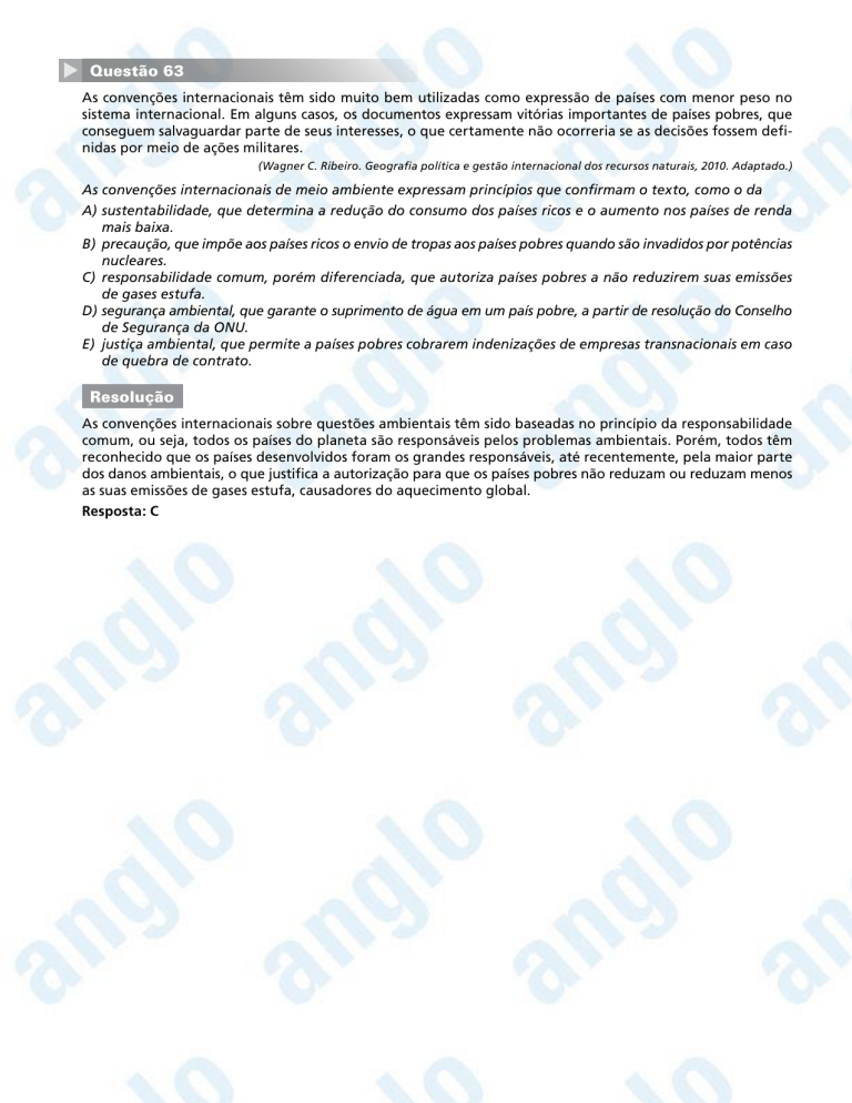▼ Questão 63 As convenções internacionais têm sido muito bem utilizadas como expressão de países com menor peso no sistema internacional. Em alguns casos, os documentos expressam vitórias importantes de países pobres, que conseguem salvaguardar parte de seus interesses, o que certamente não ocorreria se as decisões fossem definidas por meio de ações militares. (Wagner C. Ribeiro. Geografia política e gestão internacional dos recursos naturais, 2010. Adaptado.) As convenções internacionais de meio ambiente expressam princípios que confirmam o texto, como o da A)sustentabilidade, que determina a redução do consumo dos países ricos e o aumento nos países de renda mais baixa. B) precaução, que impõe aos países ricos o envio de tropas aos países pobres quando são invadidos por potências nucleares. C) responsabilidade comum, porém diferenciada, que autoriza países pobres a não reduzirem suas emissões de gases estufa. D)segurança ambiental, que garante o suprimento de água em um país pobre, a partir de resolução do Conselho de Segurança da ONU. E) justiça ambiental, que permite a países pobres cobrarem indenizações de empresas transnacionais em caso de quebra de contrato. Resolução As convenções internacionais sobre questões ambientais têm sido baseadas no princípio da responsabilidade comum, ou seja, todos os países do planeta são responsáveis pelos problemas ambientais. Porém, todos têm reconhecido que os países desenvolvidos foram os grandes responsáveis, até recentemente, pela maior parte dos danos ambientais, o que justifica a autorização para que os países pobres não reduzam ou reduzam menos as suas emissões de gases estufa, causadores do aquecimento global. Resposta: C