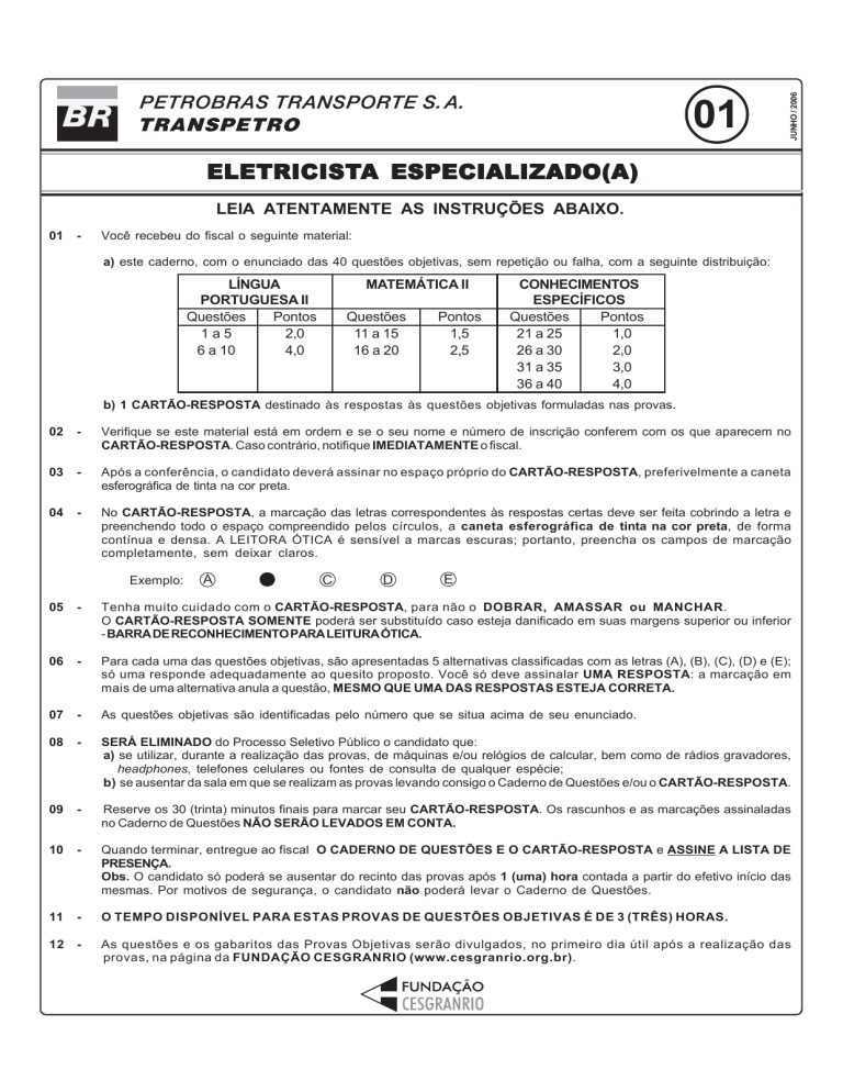 JUNHO / 2006 01 ELETRICIST A ESPECIALIZADO(A) ELETRICISTA LEIA ATENTAMENTE AS INSTRUÇÕES ABAIXO. 01 - Você recebeu do fiscal o seguinte material: a) este caderno, com o enunciado das 40 questões objetivas, sem repetição ou falha, com a seguinte distribuição: LÍNGUA PORTUGUESA II Questões Pontos 1a5 2,0 6 a 10 4,0 MATEMÁTICA II Questões 11 a 15 16 a 20 Pontos 1,5 2,5 CONHECIMENTOS ESPECÍFICOS Questões Pontos 21 a 25 1,0 26 a 30 2,0 31 a 35 3,0 36 a 40 4,0 b) 1 CARTÃO-RESPOSTA destinado às respostas às questões objetivas formuladas nas provas. 02 - Verifique se este material está em ordem e se o seu nome e número de inscrição conferem com os que aparecem no CARTÃO-RESPOSTA. Caso contrário, notifique IMEDIATAMENTE o fiscal. 03 - Após a conferência, o candidato deverá assinar no espaço próprio do CARTÃO-RESPOSTA, preferivelmente a caneta esferográfica de tinta na cor preta. 04 - No CARTÃO-RESPOSTA, a marcação das letras correspondentes às respostas certas deve ser feita cobrindo a letra e preenchendo todo o espaço compreendido pelos círculos, a caneta esferográfica de tinta na cor preta, de forma contínua e densa. A LEITORA ÓTICA é sensível a marcas escuras; portanto, preencha os campos de marcação completamente, sem deixar claros. Exemplo: A C D E 05 - Tenha muito cuidado com o CARTÃO-RESPOSTA, para não o DOBRAR, AMASSAR ou MANCHAR. O CARTÃO-RESPOSTA SOMENTE poderá ser substituído caso esteja danificado em suas margens superior ou inferior - BARRA DE RECONHECIMENTO PARA LEITURA ÓTICA. 06 - Para cada uma das questões objetivas, são apresentadas 5 alternativas classificadas com as letras (A), (B), (C), (D) e (E); só uma responde adequadamente ao quesito proposto. Você só deve assinalar UMA RESPOSTA: a marcação em mais de uma alternativa anula a questão, MESMO QUE UMA DAS RESPOSTAS ESTEJA CORRETA. 07 - As questões objetivas são identificadas pelo número que se situa acima de seu enunciado. 08 - SERÁ ELIMINADO do Processo Seletivo Público o candidato que: a) se utilizar, durante a realização das provas, de máquinas e/ou relógios de calcular, bem como de rádios gravadores, headphones, telefones celulares ou fontes de consulta de qualquer espécie; b) se ausentar da sala em que se realizam as provas levando consigo o Caderno de Questões e/ou o CARTÃO-RESPOSTA. 09 - Reserve os 30 (trinta) minutos finais para marcar seu CARTÃO-RESPOSTA. Os rascunhos e as marcações assinaladas no Caderno de Questões NÃO SERÃO LEVADOS EM CONTA. 10 - Quando terminar, entregue ao fiscal O CADERNO DE QUESTÕES E O CARTÃO-RESPOSTA e ASSINE A LISTA DE PRESENÇA. Obs. O candidato só poderá se ausentar do recinto das provas após 1 (uma) hora contada a partir do efetivo início das mesmas. Por motivos de segurança, o candidato não poderá levar o Caderno de Questões. 11 - O TEMPO DISPONÍVEL PARA ESTAS PROVAS DE QUESTÕES OBJETIVAS É DE 3 (TRÊS) HORAS. 12 - As questões e os gabaritos das Provas Objetivas serão divulgados, no primeiro dia útil após a realização das provas, na página da FUNDAÇÃO CESGRANRIO (www.cesgranrio.org.br). LÍNGUA PORTUGUESA II 50 A ciência de viver bem - Ouça música 5 10 15 20 25 30 35 40 45 Não se culpe se você é daqueles que passam o dia todo com um fone de ouvido cantarolando por aí. A música tem efeitos muito benéficos para a saúde física e mental. Já não é de hoje que os cientistas vêm estudando o fenômeno. Entre outras coisas, a música pode acalmar, estimular a criatividade e a concentração, além de ajudar na cura de uma porção de doenças. Em 1999, uma pesquisa feita no Instituto de Psicologia da USP mostrou que crianças hiperativas conseguem atingir um grau de concentração muito maior se estiverem ouvindo música – e não estamos falando de jazz ou bossa-nova, mas de rock pesado. A trilha sonora da pesquisa, que acompanhou crianças entre 9 e 10 anos, era composta pelo guitarrista sueco Yngwie Malmsteen. Embora muitos roqueiros torçam o nariz para seu heavy metal melódico, é inegável que o cara faz um tanto de barulho. Pois essa é uma bela resposta aos pais que implicam quando o filho estuda curtindo um som. Que o digam aqueles que aprenderam música desde pequenos. Pesquisas canadenses provaram que crianças que estudaram música precocemente têm desenvolvimento intelectual melhor do que as que não tiveram nenhum contato com ela. “A música é capaz de mudar a freqüência das ondas cerebrais. Já foi provado, por exemplo, que clássicos de compositores como Bach, Beethoven e Mozart deixam as ondas cerebrais com o mesmo comportamento, ou seja, com o mesmo potencial elétrico, de um indivíduo em repouso”, afirma Luís Celso Vilanova, médico neurologista, professor da Unifesp (Universidade Federal de São Paulo). “Esse estado é chamado ritmo alfa e ocorre quando a pessoa está muito relaxada (...)”. Entre os clássicos citados, o austríaco Wolfgang Amadeus Mozart merece um destaque na sua discografia. O poder do compositor vem sendo alvo de diversas pesquisas. A Universidade da Califórnia em Los Angeles mostrou, no início da década de 90, que a execução da Sonata para Dois Pianos em Ré Maior aumenta o número de conexões dos neurônios e melhora o raciocínio matemático em estudantes. Uma vez que nosso organismo também tem um ritmo interno, ao entrar por nossos ouvidos, a música faz contato com este ritmo, interagindo com as atividades biológicas do nosso corpo. É assim que trabalha a musicoterapia, muito aplicada – e com bons resultados – no tratamento de pacientes com Mal de Alzheimer, epilepsia, esquizofrenia e depressão, entre outras doenças. 55 Revista Superinteressante, jan. 2006. 1 Assinale a opção que NÃO traz uma idéia presente no texto. (A) A música contribui para a qualidade de vida do ser humano. (B) A audição de música deve interferir em aspectos psicossomáticos do homem. (C) O aprendizado precoce de música influi be