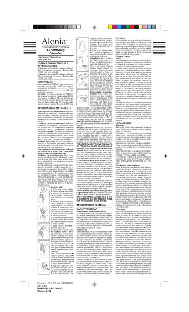 6 12/400 mcg Cápsulas USO INALATÓRIO ORAL USO ADULTO FORMAS FARMACÊUTICAS E APRESENTAÇÕES Embalagem contendo 60 cápsulas de ALENIA® (fumarato de formoterol + budesonida) 12/400 mcg com inalador. Embalagem contendo 60 cápsulas de ALENIA® (fumarato de formoterol + budesonida) 12/400 mcg (refil). 8 COMPOSIÇÃO Cada cápsula de ALENIA® (fumarato de formoterol + budesonida) 12/400 mcg contém: fumarato de formoterol ...................... 12 mcg budesonida ................................... 400 mcg excipiente: lactose Atenção: Em cada inalação de ALENIA® (fumarato de formoterol + budesonida) 12/400 mcg a dose medida de 12 mcg de fumarato de formoterol equivale à dose liberada de 9,0 mcg e a dose medida de 400 mcg de budesonida equivale à dose liberada de 320 mcg. INFORMAÇÕES AO PACIENTE Ação esperada do medicamento: ALENIA® (fumarato de formoterol + budesonida) está indicado para a melhora e controle da falta de ar em pacientes asmáticos e em pacientes portadores da doença pulmonar obstrutiva crônica. Cuidados de armazenamento: ALENIA® (fumarato de formoterol + budesonida) deve ser armazenado em temperatura ambiente (entre 15oC e 30oC), protegido da umidade. Prazo de validade: Desde que sejam observados os cuidados de armazenamento, o medicamento apresenta prazo de validade de 18 meses. Não utilize o medicamento após o vencimento do prazo de validade. Gravidez e lactação: Informe seu médico a ocorrência de gravidez na vigência do tratamento ou após o seu término. Informar ao médico se está amamentando. Este medicamento não deve ser utilizado por mulheres grávidas sem orientação médica ou do cirurgião-dentista. Cuidados de administração: Para assegurar uma administração adequada, o paciente deve ser informado sobre as instruções de uso do inalador pelo médico ou outro profissional de saúde. É importante para o paciente entender que a cápsula de gelatina pode fragmentar-se e que pequenos pedaços de gelatina podem atingir a boca ou a garganta após a inalação, sem conseqüências. As cápsulas só devem ser retiradas do frasco e manuseadas, imediatamente antes do uso, para não sofrerem ação da umidade das mãos ou do ambiente. Siga a orientação do seu médico, respeitando sempre os horários, as doses e a duração do tratamento. Modo de usar: 1 1. Retire a tampa do inalador. 2. Segure a base do inalador e, para abri-lo, levante o bocal na direção indicada pela seta existente na lateral do bocal. 3. Remova a cápsula do frasco e coloque-a no compartimento interno, na base do 2 inalador. É importante que a cápsula somente seja retirada do frasco imediatamente antes do uso do inalador. 4. Feche o inalador. 5. Pressione completamente o botão frontal do inalador para a perfuração da cápsula. Solte o botão. 3 6. Solte o ar dos pulmões o máximo possível. 7. Coloque o bocal do inalador na boca e feche os lábios ao redor dele. Incline levemente a cabeça para baixo (aproximadamente 45o). Inspire de maneira rápida e o mais profundamente possí4 vel. Você deverá ouvir um som de vibração, pois a cápsula gira no compartimento interno dispersando o medicamento. 5 Obs.: Se não ouvir o ruído da cápsula girando, essa pode estar grudada; então, abra novamente o compartimento interno, desprenda a cápsula e repita o procedimento. 8. Segure a respiração contando mentalmente até 10 (aproximadamente 10 segundos); enquanto isso retire o inalador da boca. Em Formato: 150 x 280 mm (DOBRADA) Cor: Black Modelo de bula: 2alnca5 Código: 7134 9 seguida respire normalmente. Abra o inalador e verifique se ainda há resíduo de pó na cápsula. Caso ainda reste pó repita os procedimentos de 4 a 8. 9. Após o uso, abra o inalador, remova e descarte a cápsula vazia. Feche o bocal e recoloque a tampa. 7 Importante: Lave a boca com água e/ou escove os dentes imediatamente após o uso do medicamento. Obs.: A cápsula é feita de gelatina e pode se partir em pequenos fragmentos que poderão atingir a boca e a garganta. A gelatina é comestível e, portanto, não é prejudicial. Da mesma forma, fragmentos da cápsula podem permanecer no fundo do compartimento interno e estes resíduos deverão ser removidos com auxílio de uma escovinha ou pincel macio. Conservação e limpeza do inalador: Para melhor conservação de seu inalador, faça uso de escova ou pincel macio, removendo resíduos após cada uso. Após o último uso do dia, limpe o bocal e o compartimento da cápsula com uma haste flexível de algodão, podendo ocasionalmente umedecê-la em solução anti-séptica (como, por exemplo, água oxigenada 10 volumes). Não utilize álcool, pois poderá danificar a superfície plástica. Seguindo estes cuidados de conservação, a vida útil estimada de seu inalador é de até 3 meses. Interrupção do tratamento: Não interromper o tratamento sem o conhecimento do seu médico. Reações adversas: Informe seu médico o aparecimento de reações desagradáveis, como: leve irritação de garganta, tosse, rouquidão, infecções por fungos na boca e garganta, infecções respiratórias, insônia, boca seca, dor abdominal, dor de cabeça, aumento dos batimentos cardíacos, tremores, queda do potássio sanguíneo, agitação e náusea. TODO MEDICAMENTO DEVE SER MANTIDO FORA DO ALCANCE DAS CRIANÇAS. Ingestão concomitante com outras substâncias: Alguns medicamentos para pressão alta, para problemas cardíacos, para infecções por fungos e alguns colírios podem alterar o efeito de ALENIA® (fumarato de formoterol + budesonida) se usados em associação. Contra-indicações e precauções: Não deve ser usado por pessoas alérgicas à budesonida, ao fumarato de formoterol ou à lactose. Informe seu médico se você tem ou já teve outros problemas de saúde, principalmente: problemas cardíacos, diabetes, baixa taxa de potássio no sangue ou função alterada da tireóide. Informe seu médico sobre qualquer medicamento que esteja usando, antes 