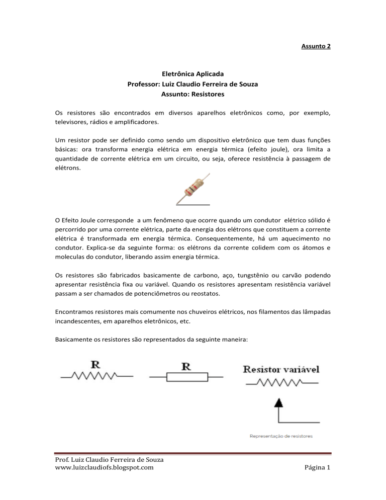 Assunto 2 Eletrônica Aplicada Professor: Luiz Claudio Ferreira de Souza Assunto: Resistores Os resistores são encontrados em diversos aparelhos eletrônicos como, por exemplo, televisores, rádios e amplificadores. Um resistor pode ser definido como sendo um dispositivo eletrônico que tem duas funções básicas: ora transforma energia elétrica em energia térmica (efeito joule), ora limita a quantidade de corrente elétrica em um circuito, ou seja, oferece resistência à passagem de elétrons. O Efeito Joule corresponde a um fenômeno que ocorre quando um condutor elétrico sólido é percorrido por uma corrente elétrica, parte da energia dos elétrons que constituem a corrente elétrica é transformada em energia térmica. Consequentemente, há um aquecimento no condutor. Explica-se da seguinte forma: os elétrons da corrente colidem com os átomos e moleculas do condutor, liberando assim energia térmica. Os resistores são fabricados basicamente de carbono, aço, tungstênio ou carvão podendo apresentar resistência fixa ou variável. Quando os resistores apresentam resistência variável passam a ser chamados de potenciômetros ou reostatos. Encontramos resistores mais comumente nos chuveiros elétricos, nos filamentos das lâmpadas incandescentes, em aparelhos eletrônicos, etc. Basicamente os resistores são representados da seguinte maneira: Prof. Luiz Claudio Ferreira de Souza www.luizclaudiofs.blogspot.com Página 1 O físico alemão George Simon (1787-1854), em suas experiencias, descobriu que a intensidade elétrica que atravessa um condutor dependia da d.d.p. aplicadaaos seus extremos. Variando a d.d.p., também variava a intensidade da corrente elétrica. Usando um resistor metálico, mantido a uma temperatura constante, ele verificou que a d.d.p. e a intensidade de corrente se mantinham diretamente proporcionais, ou seja: O quociente entre a d.d.p. U e a intensidade i da corrente da corrente elétrica era constante. Verificou ainda que diversos materiais, em sua maioria metalicos, também apresentavam essa propriedade.Portanto, podemos escrever: A constante de proporcionalidade é a resistência R do condutor elétrico. A expressão anterior pode ser convertida na formula como é conhecida a Lei de Ohm: Quando o resistor obedece a Lei de Ohm, é denominado de resistor ôhmico. É o caso dos resistores fabricados com metais ou carbono. Se o esistor não obdecer à lei de Ohm, ele é denominado de resistor não ôhmico. Vejamos o comportamento de gráfico de um resistor ôhmico submetido a diversas tensões elétricas: Prof. Luiz Claudio Ferreira de Souza www.luizclaudiofs.blogspot.com Página 2 Prof. Luiz Claudio Ferreira de Souza www.luizclaudiofs.blogspot.com Página 3 Prof. Luiz Claudio Ferreira de Souza www.luizclaudiofs.blogspot.com Página 4 Associação de Resistores Em um circuito é possível organizar conjuntos de resistores interligados, chamada associação de resistores. O comportamento desta associação varia conforme a ligação entre os resistores, sendo seus possíveis tipos: em série, em paralelo e mista. Prof. Luiz Claudio Ferreira de Souza www.luizclaudiofs.blogspot.com Página 5 Prof. Luiz Claudio Ferreira de Souza www.luizclaudiofs.blogspot.com Página 6 Prof. Luiz Claudio Ferreira de Souza www.luizclaudiofs.blogspot.com Página 7 Leitura dos Capacitores Prof. Luiz Claudio Ferreira de Souza www.luizclaudiofs.blogspot.com Página 8 Exemplos: Prof. Luiz Claudio Ferreira de Souza www.luizclaudiofs.blogspot.com Página 9