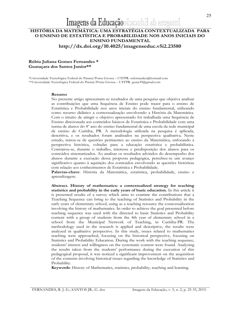 25 HISTÓRIA DA MATEMÁTICA: UMA ESTRATÉGIA CONTEXTUALIZADA PARA O ENSINO DE ESTATÍSTICA E PROBABILIDADE NOS ANOS INICIAIS DO ENSINO FUNDAMENTAL http://dx.doi.org/10.4025/imagenseduc.v5i2.23580 Rúbia Juliana Gomes Fernandes * Guataçara dos Santos Junior** *Universidade Tecnológica Federal do Paraná/Ponta Grossa – UTFPR. [email protected] **Universidade Tecnológica Federal do Paraná/Ponta Grossa – UTFPR. [email protected] Resumo No presente artigo apresentam-se resultados de uma pesquisa que objetiva analisar as contribuições que uma Sequência de Ensino pode trazer para o ensino de Estatística e Probabilidade nos anos iniciais do ensino fundamental, utilizando como recurso didático a contextualização envolvendo a História da Matemática. Com o intuito de atingir o objetivo apresentado foi trabalhada uma Sequência de Ensino direcionada aos conteúdos básicos de Estatística e Probabilidade com uma turma de alunos do 4º ano do ensino fundamental de uma escola da rede municipal de ensino de Curitiba, PR. A metodologia utilizada na pesquisa é aplicada, descritiva, e os resultados foram analisados na perspectiva qualitativa. Neste estudo, tratou-se de questões pertinentes ao ensino da Matemática, enfocando a perspectiva histórica, voltadas para a educação estatística e probabilística. Constatou-se, durante o trabalho, interesse e predisposição dos alunos para os conteúdos sistematizados. Ao analisar os resultados advindos do desempenho dos alunos durante a execução dessa proposta pedagógica, percebeu-se um avanço significativo quanto à aquisição dos conteúdos envolvendo as questões históricas com relação aos conhecimentos de Estatística e Probabilidade. Palavras-chave: História da Matemática, estatística, probabilidade, ensino e aprendizagem. Abstract. History of mathematics: a contextualized strategy for teaching statistics and probability in the early years of basic education. In this article it is presented results of a survey which aims to examine the contributions that a Teaching Sequence can bring to the teaching of Statistics and Probability in the early years of elementary school, using as a teaching resource the contextualization involving the history of mathematics. In order to achieve the goal presented before teaching sequence was used with the directed to basic Statistics and Probability content with a group of students from the 4th year of elementary school in a school from the Municipal Network of Teaching, in Curitiba-PR. The methodology used in the research is applied and descriptive, the results were analyzed in qualitative perspective. In this study, issues related to mathematics teaching were approached, focusing on the historical perspective, focusing on Statistics and Probability Education. During the work with the teaching sequence, students' interest and willingness on the systematic content were found. Analyzing the results taken from the students' performance during the execution of this pedagogical proposal, it was noticed a significant improvement on the acquisition of the contents involving historical issues regarding the knowledge of Statistics and Probability. Keywords: History of Mathematics, statistics, probability, teaching and learning. FERNANDES, R. J. G.; SANTOS JR., G. dos Imagens da Educação, v. 5, n. 2, p. 25-35, 2015. 26 Introdução Nos últimos anos, tem-se observado em evidência a preocupação acadêmica em expandir a presença das questões relacionadas ao contexto histórico nas produções científicas destinadas às discussões sobre a matemática escolar. Essas discussões ocorrem num contexto em que se percebe, em algumas situações, que parte dos alunos ainda demonstra grandes dificuldades nessa área do conhecimento. Acredita-se que uma justificativa para tal fato pode ser a forma como é realizada a abordagem do conteúdo matemático. Isto geralmente acontece numa perspectiva essencialmente tradicionalista, em que o professor expõe as relações matemáticas na oralidade e, na sequência, apresenta definições, exemplos e demonstrações das propriedades, para indicar a realização de exercícios de fixação e aplicação mecânica envolvendo os conceitos trabalhados, com o pressuposto de que os alunos aprendem pela simples repetição. Compreende-se que essa estrutura pode ser ineficaz, “[...]pois a reprodução correta pode ser apenas uma simples indicação que o aluno aprendeu a reproduzir alguns procedimentos mecânicos, mas não aprendeu o conteúdo matemático e não sabe utilizá-lo em outros contextos” (BRASIL, 1998, p. 37). Nesse sentido, buscam-se diferentes estratégias e encaminhamentos pedagógicos, visando oportunizar uma educação matemática significativa, em que os estudantes não acatem a ideia de que a matemática é uma ciência pronta e acabada, mas que ela se revela na compreensão de seus conceitos, conhecimentos e saberes vinculados ao entendimento social. Isto posto, cabe ao professor adotar uma postura crítica, com relação a sua própria atuação profissional, à medida que ele deve ser um facilitador do processo pedagógico, que auxilia os alunos no processo de apropriação e construção dos conhecimentos e conceitos matemáticos. Em consequência dessa ação espera-se instigar a curiosidade e interesse dos estudantes, de modo que eles sintam a necessidade de obter novas informações, visando sistematizar outras aprendizagens e extrapolar as apresentadas pelo professor. Para tanto, entende-se que a História da Matemática pode ser uma grande aliada do FERNANDES, R. J. G.; SANTOS JR., G. dos ensino da Matemática e, em especial, do ensino da Estatística e Probabilidade, ao revelar a Matemática como: [...] criação humana, ao mostrar necessidades e preocupações de diferentes culturas, em diferentes momentos históricos, ao estabelecer comparações entre os conceitos e processos matemáticos do passado e presente, o professor cria condiç