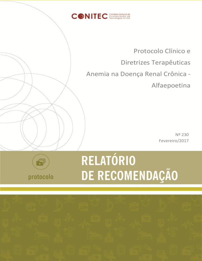 Protocolo Clínico e Diretrizes Terapêuticas Anemia na Doença Renal Crônica Alfaepoetina Nº 230 Fevereiro/2017 2017 Ministério da Saúde. É permitida a reprodução parcial ou total desta obra, desde que citada a fonte e que não seja para venda ou qualquer fim comercial. A responsabilidade pelos direitos autorais de textos e imagens desta obra é da CONITEC. Informações: MINISTÉRIO DA SAÚDE Secretaria de Ciência, Tecnologia e Insumos Estratégicos Esplanada dos Ministérios, Bloco G, Edifício Sede, 8° andar CEP: 70058-900, Brasília – DF E-mail: [email protected] http://conitec.gov.br CONTEXTO Em 28 de abril de 2011, foi publicada a Lei n° 12.401, que altera diretamente a Lei nº 8.080 de 1990 dispondo sobre a assistência terapêutica e a incorporação de tecnologias em saúde no âmbito do SUS. Essa lei define que o Ministério da Saúde, assessorado pela Comissão Nacional de Incorporação de Tecnologias no SUS – CONITEC, tem como atribuições a incorporação, exclusão ou alteração de novos medicamentos, produtos e procedimentos, bem como a constituição ou alteração de Protocolos Clínicos e Diretrizes Terapêuticas. Protocolos Clínicos e Diretrizes Terapêuticas (PCDT) são documentos que visam a garantir o melhor cuidado de saúde possível diante do contexto brasileiro e dos recursos disponíveis no Sistema Único de Saúde. Podem ser utilizados como material educativo dirigido a profissionais de saúde, como auxílio administrativo aos gestores, como parâmetro de boas práticas assistenciais e como documento de garantia de direitos aos usuários do SUS. Os PCDT são os documentos oficiais do SUS para estabelecer os critérios para o diagnóstico de uma doença ou agravo à saúde; o tratamento preconizado incluindo medicamentos e demais tecnologias apropriadas; as posologias recomendadas; os cuidados com a segurança dos doentes; os mecanismos de controle clínico; e o acompanhamento e a verificação dos resultados terapêuticos a serem buscados pelos profissionais de saúde e gestores do SUS. Os medicamentos e demais tecnologias recomendadas no PCDT se relacionam às diferentes fases evolutivas da doença ou do agravo à saúde a que se aplicam, bem como incluem as tecnologias indicadas quando houver perda de eficácia, contra-indicação, surgimento de intolerância ou reação adversa relevante, provocadas pelo medicamento, produto ou procedimento de primeira escolha. A nova legislação estabeleceu que a elaboração e atualização dos PCDT será baseada em evidências científicas, o que quer dizer que levará em consideração os critérios de eficácia, segurança, efetividade e custo-efetividade das intervenções em saúde recomendadas. Para a constituição ou alteração dos PCDT, a Portaria GM n° 2.009 de 2012 instituiu na CONITEC uma Subcomissão Técnica de Avaliação de PCDT, com as seguintes competências: definir os temas para novos PCDT, acompanhar sua elaboração, avaliar as recomendações propostas e as evidências científicas apresentadas, além de revisar periodicamente, a cada dois anos, os PCDT vigentes. Após concluídas todas as etapas de elaboração de um PCDT, a aprovação do texto é submetida à apreciação do Plenário da CONITEC, com posterior disponibilização do documento em consulta pública para contribuição de toda sociedade, antes de sua deliberação final e publicação. O Plenário da CONITEC é o fórum responsável pelas recomendações sobre a constituição ou alteração de Protocolos Clínicos e Diretrizes Terapêuticas, além dos assuntos relativos à incorporação, exclusão ou alteração das tecnologias no âmbito do SUS, bem como sobre a atualização da Relação Nacional de Medicamentos Essenciais (RENAME). É composto por treze membros, um representante de cada Secretaria do Ministério da Saúde – sendo o indicado pela Secretaria de Ciência, Tecnologia e Insumos Estratégicos (SCTIE) o presidente do Plenário – e um representante de cada uma das seguintes instituições: Agência Nacional de Vigilância Sanitária ANVISA, Agência Nacional de Saúde Suplementar - ANS, Conselho Nacional de Saúde - CNS, Conselho Nacional de Secretários de Saúde - CONASS, Conselho Nacional de Secretarias Municipais de Saúde CONASEMS e Conselho Federal de Medicina - CFM. Cabe à Secretaria-Executiva da CONITEC – exercida pelo Departamento de Gestão e Incorporação de Tecnologias em Saúde (DGITS/SCTIE) – a gestão e a coordenação das atividades da Comissão. Conforme o Decreto n° 7.646 de 2011, a publicação do PCDT é de responsabilidade do Secretário de Ciência, Tecnologia e Insumos Estratégicos após manifestação de anuência do titular da Secretaria responsável pelo programa ou ação, conforme a matéria. Para a garantia da disponibilização das tecnologias previstas no PCDT e incorporadas ao SUS, a lei estipula um prazo de 180 dias para a efetivação de sua oferta à população brasileira. APRESENTAÇÃO A presente proposta de Protocolo Clínico e Diretrizes Terapêuticas Anemia na Doença Renal Crônica - Alfaepoetina pretende atualizar as recomendações sobre o assunto, conforme estabelecido no Decreto n° 7.508 de 28/06/2011, Art.26, parágrafo único. A proposta foi avaliada pela Subcomissão Técnica de Avaliação de PCDT da CONITEC e apresentada aos membros do Plenário da CONITEC, em sua 47ª Reunião Ordinária, que recomendaram favoravelmente ao texto. O Protocolo Clínico e Diretrizes Terapêuticas Anemia na Doença Renal Crônica - Alfaepoetina segue agora para consulta pública a fim de que se considere a visão da sociedade e se possa receber as suas valiosas contribuições, que poderão ser tanto de conteúdo científico quanto um relato de experiência. Gostaríamos de saber a sua opinião sobre a proposta como um todo, assim como se há recomendações que poderiam ser diferentes ou mesmo se algum aspecto importante deixou de ser considerado. DELIBE