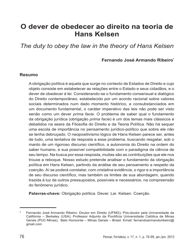 Fernando José Armando Ribeiro O dever de obedecer ao direito na teoria de Hans Kelsen The duty to obey the law in the theory of Hans Kelsen Fernando José Armando Ribeiro* Resumo A obrigação política é aquela que surge no contexto de Estados de Direito e cujo objeto consiste em estabelecer as relações entre o Estado e seus cidadãos, e o dever de obedecer à lei. Considerando-se o fundamento consensual e dialógico do Direito contemporâneo, estabelecido por um acordo racional sobre valores sociais determinados num dado momento histórico, e consubstanciados em um documento fundamental, o caráter imperativo das leis não pode ser visto senão como um dever prima facie. O problema de saber qual o fundamento da obrigação jurídica (obrigação prima facie) é um dos temas mais clássicos e debatidos na seara da Filosofia do Direito e da Teoria Política. Não há sequer uma escola de importância no pensamento jurídico-político que sobre ele não se tenha debruçado. O neopositivismo lógico de Hans Kelsen parece ser, antes de tudo, uma tentativa de resposta a esse problema, buscando resgatar, sob o manto de um rigoroso discurso científico, a autonomia do Direito na ordem do saber humano, e sua possível compatibilidade com o paradigma da ciência de seu tempo. Na busca por essa resposta, muitas são as contribuições que ele nos trouxe a reboque. Nosso estudo pretende analisar o fundamento da obrigação política em Hans Kelsen, partindo da análise de seu pensamento a respeito da coerção. Aí se poderá constatar, com cristalina evidência, o rigor e a importância de seu discurso científico, mas também os limites de sua abordagem, quando trazida à luz de outros pressupostos, possíveis e necessários, na compreensão do fenômeno jurídico. Palavras-chave: Obrigação política. Dever. Lei. Kelsen. Coerção. * 76 Fernando José Armando Ribeiro: Doutor em Direito (UFMG); Pós-doutor pela Universidade da Califórnia – Berkeley (USA); Professor Adjunto da Pontifícia Universidade Católica de Minas Gerais (PUC-Minas); Belo Horizonte – Minas Gerais – Brasil. Email: fernandoarmandoribeiro@ gmail.com Pensar, Fortaleza, v. 17, n. 1, p. 76-99, jan./jun. 2012 O dever de obedecer ao direito na teoria de Hans Kelsen Abstract The political obligation is the one that arises in the context of rule of law and whose object is to establish relations between the state and its citizens, and the duty to obey the law. However, considering the consensual and dialogical basis of contemporary law, established by a rational agreement on certain social values in a given historical moment, and embodied in a fundamental document, the imperative character of law cannot be regarded as more than a prima facie duty. The problem about the foundations of legal obligation (prima facie obligation) is one of the most traditional and debated on legal and political philosophy. There’s not even one single school in legal and political thought that has not reflected about this subject. The neo-logical positivism of Hans Kelsen seems to be, above all, an attempt to address this issue, seeking to recover, under the cloak of a rigorous scientific discourse, the autonomy of law in the order of human knowledge, in order to make it compatible with the paradigm of science of his time. Our study aims to analyze the basis of political obligation according to Hans Kelsen, based on his analysis about coercion. Then we will see, with sober evidence, the accuracy and importance of his scientific discourse, but in the other way the limits of his approach, when brought to light of different assumptions, possible and necessary in understanding the legal phenomenon. Keywords: Political obligation. Duty. Law. Kelsen. Coercion. Introdução O problema da obediência à lei traz em seu bojo a questão da hierarquização e estratificação de condutas impostas à sociedade pelo ordenamento estatal. Às normas estatais deve-se seguir uma atitude que se manifeste em conformidade com o dever e a obrigação imperativamente prescritos. Antes de tudo, é preciso estar ciente da dificuldade conceitual apresentada pela ideia de obrigação, a qual se apresenta sempre destituída de clareza. Isso se deve ao fato de que, tanto na linguagem filosófica quanto na jurídica, é comum a utilização indiscriminada das expressões dever e obrigação. Dever e obrigação são, de fato, utilizados usualmente para estabelecer quais são as condutas às quais os homens se encontram Pensar, Fortaleza, v. 17, n. 1, p. 76-99, jan./jun. 2012 77 Fernando José Armando Ribeiro vinculados. Ademais, o uso indiscriminado das expressões se faz igualmente favorecido no âmbito jurídico, visto que os Estados Modernos passam a instituir, indiscriminadamente, “deveres” e “obrigações” com o fim de gerar certas condutas, sendo também facultado aos indivíduos, em certas ocasiões, modificá-los, transferi-los e extingui-los. Todavia, parece-nos que, diante da obra de autores como Herbert Lionel Adolphus Hart (1958;1994), John Rawls (2000) ou Rex Martin (1993), deve-se buscar manejar com mais cuidado os conceitos de dever e obrigação. As obrigações nascem como consequência de atos voluntários e necessitam, para sua gênese, de especiais ações individuais destinadas à sua criação, fazendo com que, tanto no âmbito da moral como do direito, uma conduta previamente opcional e relativa perca, ao menos em princípio, sua relatividade (como, p. ex., se dá com as promessas). As obrigações são interpessoais, vale dizer, são requisições dirigidas a pessoas determinadas (os obrigados) por pessoas também determinadas (os titulares dos direitos), sendo seu conteúdo perfeitamente individualizado. Ademais, além de se correlacionarem com seu respectivo direito, as obrigações não se originam do caráter ou do conteúdo das ações obrigatórias, mas tão somente da particular forma pela qual as partes se relacionam. Assim, cabe af