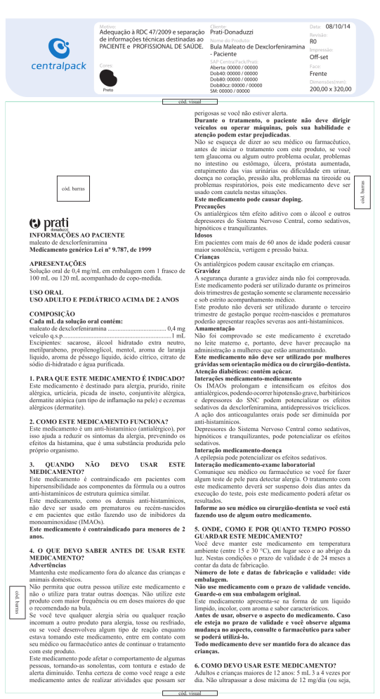 08/10/14 Adequação à RDC 47/2009 e separação Prati-Donaduzzi de informações técnicas destinadas ao R0 PACIENTE e PROFISSIONAL DE SAÚDE. Bula Maleato de Dexclorfeniramina - Paciente Off-set Aberta: 00000 / 00000 Dob40: 00000 / 00000 Dob80: 00000 / 00000 Dob80cz: 00000 / 00000 SM: 00000 / 00000 Preto Frente 200,00 x 320,00 cód. visual perigosas se você não estiver alerta. Durante o tratamento, o paciente não deve dirigir veículos ou operar máquinas, pois sua habilidade e atenção podem estar prejudicadas. doença no coração, pressão alta, problemas na tireoide ou problemas respiratórios, pois este medicamento deve ser usado com cautela nestas situações. Este medicamento pode causar doping. Precauções Os antialérgicos têm efeito aditivo com o álcool e outros depressores do Sistema Nervoso Central, como sedativos, cód. barras INFORMAÇÕES AO PACIENTE maleato de dexclorfeniramina Medicamento genérico Lei nº 9.787, de 1999 APRESENTAÇÕES Solução oral de 0,4 mg/mL em embalagem com 1 frasco de 100 mL ou 120 mL acompanhado de copo-medida. Idosos Em pacientes com mais de 60 anos de idade poderá causar maior sonolência, vertigem e pressão baixa. Crianças Os antialérgicos podem causar excitação em crianças. Gravidez USO ORAL USO ADULTO E PEDIÁTRICO ACIMA DE 2 ANOS dois trimestres de gestação somente se claramente necessário e sob estrito acompanhamento médico. COMPOSIÇÃO Cada mL da solução oral contém: maleato de dexclorfeniramina .................................... 0,4 mg veículo q.s.p...................................................................1 mL Excipientes: sacarose, álcool hidratado extra neutro, metilparabeno, propilenoglicol, mentol, aroma de laranja líquido, aroma de pêssego líquido, ácido cítrico, citrato de trimestre de gestação porque recém-nascidos e prematuros poderão apresentar reações severas aos anti-histamínicos. Amamentação Não foi comprovado se este medicamento é excretado no leite materno e, portanto, deve haver precaução na administração a mulheres que estão amamentando. Este medicamento não deve ser utilizado por mulheres grávidas sem orientação médica ou do cirurgião-dentista. Atenção diabéticos: contém açúcar. Interações medicamento-medicamento 1. PARA QUE ESTE MEDICAMENTO É INDICADO? Este medicamento é destinado para alergia, prurido, rinite alérgica, urticária, picada de inseto, conjuntivite alérgica, antialérgicos, podendo ocorrer hipotensão grave, barbitúricos sedativos da dexclorfeniramina, antidepressivos tricíclicos. A ação dos anticoagulantes orais pode ser diminuída por anti-histamínicos. Depressores do Sistema Nervoso Central como sedativos, 2. COMO ESTE MEDICAMENTO FUNCIONA? sedativos. Interação medicamento-doença próprio organismo. 3. QUANDO NÃO DEVO USAR ESTE MEDICAMENTO? Este medicamento é contraindicado em pacientes com hipersensibilidade aos componentes da fórmula ou a outros anti-histamínicos de estrutura química similar. Este medicamento, como os demais anti-histamínicos, não deve ser usado em prematuros ou recém-nascidos Interação medicamento-exame laboratorial Este medicamento é contraindicado para menores de 2 anos. 5. ONDE, COMO E POR QUANTO TEMPO POSSO GUARDAR ESTE MEDICAMENTO? Você deve manter este medicamento em temperatura 4. O QUE DEVO SABER ANTES DE USAR ESTE MEDICAMENTO? Advertências Mantenha este medicamento fora do alcance das crianças e animais domésticos. cód. barras produto com maior frequência ou em doses maiores do que o recomendado na bula. Se você teve qualquer alergia séria ou qualquer reação incomum a outro produto para alergia, tosse ou resfriado, ou se você desenvolveu algum tipo de reação enquanto estava tomando este medicamento, entre em contato com seu médico ou farmacêutico antes de continuar o tratamento com este produto. Este medicamento pode afetar o comportamento de algumas pessoas, tornando-as sonolentas, com tontura e estado de algum teste de pele para detectar alergia. O tratamento com este medicamento deverá ser suspenso dois dias antes da execução do teste, pois este medicamento poderá afetar os resultados. Informe ao seu médico ou cirurgião-dentista se você está fazendo uso de algum outro medicamento. contar da data de fabricação. Número de lote e datas de fabricação e validade: vide embalagem. Não use medicamento com o prazo de validade vencido. Guarde-o em sua embalagem original. Este medicamento apresenta-se na forma de um líquido límpido, incolor, com aroma e sabor característicos. Antes de usar, observe o aspecto do medicamento. Caso ele esteja no prazo de validade e você observe alguma mudança no aspecto, consulte o farmacêutico para saber se poderá utilizá-lo. Todo medicamento deve ser mantido fora do alcance das crianças. 6. COMO DEVO USAR ESTE MEDICAMENTO? dia. Não ultrapassar a dose máxima de 12 mg/dia (ou seja, cód. visual cód. barras antes de iniciar o tratamento com este produto, se você tem glaucoma ou algum outro problema ocular, problemas no intestino ou estômago, úlcera, próstata aumentada, 08/10/14 Adequação à RDC 47/2009 e separação Prati-Donaduzzi de informações técnicas destinadas ao R0 PACIENTE e PROFISSIONAL DE SAÚDE. Bula Maleato de Dexclorfeniramina - Paciente Off-set Aberta: 00000 / 00000 Dob40: 00000 / 00000 Dob80: 00000 / 00000 Dob80cz: 00000 / 00000 SM: 00000 / 00000 Preto Verso 200,00 x 320,00 cód. visual 7. O QUE DEVO FAZER QUANDO EU ME ESQUECER DE USAR ESTE MEDICAMENTO? Se você se esquecer de tomar uma dose na hora certa, tome-a assim que possível e depois reajuste os horários de acordo com esta última tomada, continuando o tratamento de acordo com os novos horários programados. Não dobre a dose para compensar a dose esquecida. Em caso de dúvidas, procure orientação do farmacêutico ou de seu médico, ou cirurgião-dentista. 8. QUAIS OS MALES QUE ESTE MEDICAMENTO PODE ME CAUSAR? Poderá ocorrer sonolê