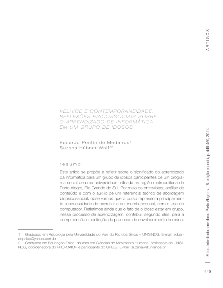 ARTIGOS Eduardo Pontin de Medeiros1 Suzana Hübner Wolff2 resumo Este artigo se propõe a refletir sobre o significado do aprendizado da informática para um grupo de idosos participantes de um programa social de uma universidade, situada na região metropolitana de Porto Alegre, Rio Grande do Sul. Por meio de entrevistas, análise de conteúdo e com o auxilio de um referencial teórico de abordagem biopsicossocial, observamos que o curso representa principalmente a necessidade de exercitar a autonomia pessoal, com o uso do computador. Refletimos ainda que o fato de o idoso estar em grupo, nesse processo de aprendizagem, contribui, segundo eles, para a compreensão e aceitação do processo de envelhecimento humano. 1 Graduado em Psicologia pela Universidade do Vale do Rio dos Sinos – UNISINOS. E-mail: [email protected] 2 Graduada em Educação Física, doutora em Ciências do Movimento Humano, professora da UNISINOS, coordenadora do PRÓ-MAIOR e participante do GREG). E-mail: [email protected] Estud. interdiscipl. envelhec., Porto Alegre, v. 16, edição especial, p. 449-459, 2011. VELHICE E CONTEMPORANEIDADE: REFLEXÕES PSICOSSOCIAIS SOBRE O APRENDIZADO DE INFORMÁTICA EM UM GRUPO DE IDOSOS 449 ARTIGOS palavras-chave Envelhecimento Humano. Informática. Autonomia. Aprendizado. Grupo. 1 Introdução Como podermos definir um idoso? Segundo o estatuto brasileiro, idoso é qualquer indivíduo que tenha idade igual ou superior a 60 anos. Outra tentativa de definir o que seria um sujeito idoso, segundo Goldfarb (1998, p. 62) é: Estud. interdiscipl. envelhec., Porto Alegre, v. 16, edição especial, p. 449-459, 2011. (...) um sujeito psíquico em constante crescimento e evolução, altamente afetado pela representação de um corpo que se deteriora e pela consciência da finitude. Mas, estamos falando de um limite e não de uma limitação. Limite que será o do corpo biológico que sofre uma involução, mas não daquele outro que sabemos capaz de ter prazer, instrumento de amor e que deverá ser incentivado a sentir e se sensibilizar com a proximidade dos outros e a força dos vínculos. 450 O processo de envelhecimento implica uma série de mudanças. Essas acontecem em tempos diferentes não podendo ser generalizado a todos os indivíduos. Como o indivíduo trabalhará essas mudanças é o que fará a diferença ao pensarmos o envelhecimento de uma, ou mais pessoas (NERI, 1995). Se comparadas duas pessoas da mesma idade, com vivências e culturas diferentes, certamente serão encontradas muitas diferenças entre elas. Possivelmente mais diferenças que semelhanças. Mais importante que a idade cronológica é a forma como os anos foram vividos, as construções que foram feitas e a maneira como esse idoso se sente e se percebe (NERI, 1995). Assim, na atualidade, faz-se necessário cada vez mais refletir sobre o que é ser velho e envelhecer. Nesse sentido, afirma Morais (2007) que, respeitadas as diferenças, devemos pensar em um olhar que supra as demandas desses novos velhos, para que assim eles possam manter a sua autonomia e usufruir de uma qualidade de vida laboriosamente alcançada. Alerta ainda a autora que, a população idosa vem crescendo exponencialmente, visto que a expectativa de vida dos brasileiros que em 1900 era de 33,7 anos, passou para 68,5 anos em 2000, sendo que essa tendência para os próximos anos é aumentar ainda mais tal expectativa. Frente ao exposto e sabendo que o uso de novas tecnologias por parte da população em geral irá aumentar significativamente, perguntamos: Como estão os idosos diante a essas transformações? 2 Metodologia Para a presente pesquisa utilizamos de uma metodologia qualitativodialógica para obtenção dos dados. Esse tipo de metodologia permite uma seleção intencional da amostra, e uma análise de dados que possibilita o diálogo com um referencial teórico amplo e com recortes dos dados coletados, o que resulta em uma oportunidade para que a subjetividade seja manifestada (PEREIRA, 1999). Participaram deste estudo os idosos que faziam parte do curso de informática oferecido pelo programa de ação social, PRÓ-MAIOR da Universidade ARTIGOS Estud. interdiscipl. envelhec., Porto Alegre, v. 16, edição especial, p. 449-459, 2011. Morais (2007) afirma que apenas 6% da população idosa faz uso da internet com frequência, considerando que a camada da população brasileira que tem acesso a esse serviço ainda é pequena, se comparada com outros países em desenvolvimento. Podemos então, refletir sobre o quanto os idosos podem sentir-se excluídos. E ainda: visto que esse universo tecnológico está em constante evolução, acompanhar essas transformações pode ser difícil para grande parte dessa população (KACHAR, 2003). Este fato coloca mais uma vez o idoso frente a uma função social de passado e desatualizado, o que pode vir a produzir sentimentos de sofrimento (NERI, 1995). É sabido que um dos elementos para a promoção de um envelhecimento bem sucedido, levando em consideração aspectos biopsicossociais, é buscar manter o idoso ativo e exercendo sua autonomia. Um desses recursos pode vir a ser a informática, pois ela possibilita a ação integradora nos relacionamentos desse velho, promovendo aproximação entre gerações, proporcionando mais autonomia aos idosos. Além de abrir um mundo novo para o idoso aprendente. Essa descoberta pode não só auxiliar no uso do computador, mas pode trazer facilidade para o dia a dia desses idosos, pois aprendendo uma tecnologia nova eles podem quebrar barreiras, sejam elas intergeracionais, ou minimizar dificuldades em incorporar novas mudanças (KACHAR, 2001). Tendo em vista tais considerações, justificamos esta busca junto a um grupo de idosos aprendentes de informática de um Programa de Ação Social, refletindo com esses colaboradores sobre o lugar que a informática assume no cotidiano da vida deles. Buscamos ainda, identificar se o fato de o curso ser realizado em gr