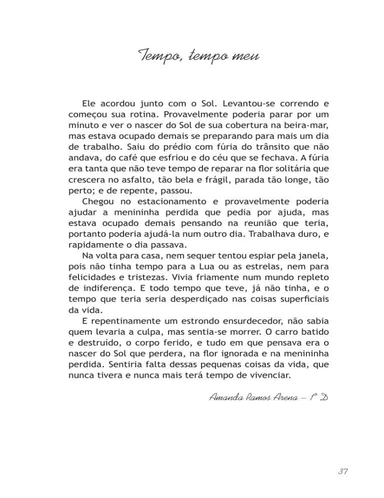 Tempo, tempo meu Ele acordou junto com o Sol. Levantou-se correndo e começou sua rotina. Provavelmente poderia parar por um minuto e ver o nascer do Sol de sua cobertura na beira-mar, mas estava ocupado demais se preparando para mais um dia de trabalho. Saiu do prédio com fúria do trânsito que não andava, do café que esfriou e do céu que se fechava. A fúria era tanta que não teve tempo de reparar na flor solitária que crescera no asfalto, tão bela e frágil, parada tão longe, tão perto; e de repente, passou. Chegou no estacionamento e provavelmente poderia ajudar a menininha perdida que pedia por ajuda, mas estava ocupado demais pensando na reunião que teria, portanto poderia ajudá-la num outro dia. Trabalhava duro, e rapidamente o dia passava. Na volta para casa, nem sequer tentou espiar pela janela, pois não tinha tempo para a Lua ou as estrelas, nem para felicidades e tristezas. Vivia friamente num mundo repleto de indiferença. E todo tempo que teve, já não tinha, e o tempo que teria seria desperdiçado nas coisas superficiais da vida. E repentinamente um estrondo ensurdecedor, não sabia quem levaria a culpa, mas sentia-se morrer. O carro batido e destruído, o corpo ferido, e tudo em que pensava era o nascer do Sol que perdera, na flor ignorada e na menininha perdida. Sentiria falta dessas pequenas coisas da vida, que nunca tivera e nunca mais terá tempo de vivenciar. Amanda Ramos Arena – 1º D 37