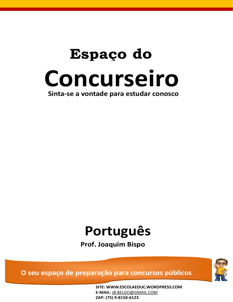 Espaço do do Concurseiro Sinta-se a vontade para estudar conosco Português Prof. Joaquim Bispo ação O seu espaço de preparação para concursos públicos SITE: WWW.ESCOLAEDUC.WORDPRESS.COM E-MAIL: [email protected] ZAP: (75) 9-8150-6123 1 Aula 7 PONTUAÇÃO 1 . Emprego da Vírgula Na ordem direita da oração (sujeito + verbo + complemento(s) + adjunto adverbal), NÃO use Virgula entre os termos. Isso só acontecera ao deslocarem-se o predicativo ou o adjunto adverbial. Os professores da casa do concurseiro entregaram o assunto aos alunos nesta semana Os professores da casa do concurseiro entregaram aos alunos as dicas nesta semana Dica Bispaziana = NÃO SE SEPARA O POR VÍRGULA: Predicado de sujeito =ocorrem bons concursos nesta época! Objeto de verbo = entregamos, ao grupo, algumas questões! Adjunto adnominal de nome = a questão, de português, esta comentada no site. 2 . Entre os termos da oração 1. Para separar itens de uma série (Enumeração) Alegria tristeza, fracassos, e êxito fazem parte da vida. Precisa-se de pedreiro, servente, mestre- de- obras 2. Para assinalar supressão de um verbo. “Os tristes achoa que os ventos geme ; os alegres, que ele canta” (verisimo) 3. Para separar o adjunto adverbial deslocado. “Na plenitude da felicidade, cada dia e uma vida inteira.”(Geothe) “Sua tarefa é descobrir seu trabalho e, com todo coração, dedicar-se a ele. (Buba) As pessoas, muitas vezes, são falsas. SITE: WWW.ESCOLAEDUC.WORDPRESS.COM E-MAIL: [email protected] ZAP: (75) 9-8150-6123 2 Observação: Se o adjunto adverbial for pequeno, a utilização da vírgula não é necessário, a não ser que se queira enfatizar a informação nele contida. Ontem comemoramos o seu nascimento. 4. Para separar o aposto. Sempre seguir três dicas: sorria sempre, tenha amigos e estude Há duas fases na vida, infância e velhice, em que a felicidade está em uma caixa de bombom. ” 5. Para separar o vocativo Senhores passageiros, desliguem os celulares. 6. Para separar expressões explicativas, retificativas, continuativas, conclusivas ou enfatizas (alias, além disso, com efeito, enfim, isto e, em suma, ou seja, ou melhor, por exemplo, etc ). Preciso estudar, ou seja, adeus final de semana. Falar ao célula durante a aula é, em suma, manifestação de falta de respeito. Entre as orações 1. Para separar as orações coordenadas assindéticas “Não mim falta cadeira, não mim falta sofá, só falta você sentar na sala, só falta você sentar”(Armando Antunes) 2. As orações devem sempre ser coordenadas por virgulas, orações coordenadas as que indicam edição (e, nem, mais também) , alternativa (ou, ou ... ou, ora ... ora), adversidade (mas, porém, contudo, entretanto, todavia...), conclusão (logo, portanto...), e explicação (porque, pois). Ela queria muito aquele concurso, entretanto não estudava muito. Sempre fui assim, portanto não vou mudar. SITE: WWW.ESCOLAEDUC.WORDPRESS.COM E-MAIL: [email protected] ZAP: (75) 9-8150-6123 3 3. Para separar orações coordenadas sindéticas ligadas por “e”, desde que os sujeitos sejam diferentes. As pessoas participavam do protesto pacificamente, e a polícia respeitava a todos. Os sentimentos podem mudar com o tempo e as pessoas não percebem isso. 4. Para separar orações adverbiais, especialmente quando forem longas. Em determinado momento, Paulo chorou de raiva, por que não aprendia os verbos! 5. Para separar orações adverbias anteposta a principal ou intercaladas, tanto desenvolvidas, quanto reduzidas. Como queria deixar de ser solteira, estudava com afinco. Nossos sonhos, conforme os olhos relatam, soa possíveis. Emprego de ponto-e-vírgula 1. Para separar orações que contém várias enumerações já separadas por virgulas ou que encerrem comparações e contraste. Durante a aula do Paulo, estudaram-se largamente as taxas de juros; na aula do Joaquim, os alunos aprenderão regras gramaticais. Muito se esforçam; poucos conseguem. 2. Para separar as orações em que as conjunções adversativas ou conclusivas estejam deslocadas. O colega sempre conversava durante a aula; as pessoas da turma, todavia, não suportavam aquela atitude. Vamos terminar este namoro; considere-se, portanto, livre, deste compromisso. 3. Para alongar a pausa de conjunções adversativas (mais, porém, todavia, entretanto, contudo) substituindo, assim, a vírgula. Gostaria de estudar; todavia, só chegarei perto dos livros amanhã. SITE: WWW.ESCOLAEDUC.WORDPRESS.COM E-MAIL: [email protected] ZAP: (75) 9-8150-6123 4 Emprego dos Dois-Pontos 1) Para anunciar uma citação. Lembrando um poema de Vinicius de Morais: “ tristeza não tem fim, felicidade sim. ” 2) para anunciar uma enumeração, um aposto, uma explicação, uma consequência ou um esclarecimento. Sempre tive três grandes amigos: Joaquim, Messias e Cleydson. Não há motivos para preocupação: tudo já está resolvido. EXERCÍCIOS 1 – Faça as correções quanto o uso de pontuação nas frases a seguir: a) O noivo apresentou várias pessoas aos amigos com objetividade. b) Com objetivo o noivo apresentou várias pessoas aos amigos. c) O noivo com objetivo apresentou várias pessoas aos amigos. d) O gerente apresentou com determinação várias sugestões aos acionistas. e) Os namorados após meticulosas discussões decidirão acabar o relacionamento. f) Os namorados realizaram com extrema eficácia a catalogação dos bens. g) Alegria tristeza expectativa nervosismo decepção são comuns na vida dos indevidos. h) Naquela altura do julgamento o advogado de acusação homem comedido e responsável deixou entrever com extraordinária categoria sua invejável formação jurídica. i) Quando lhe disserem para desistir persista quando conseguir a vitória dívida com seus amigos sua alegria. j) De MPB eu gosto mais de música sertaneja. k) O presidente pode se tiver interessado pode colocar na cadeia os corruptos aqueles que só fazem mal ao país. SITE: WWW.ESCOLAEDUC.WORDP